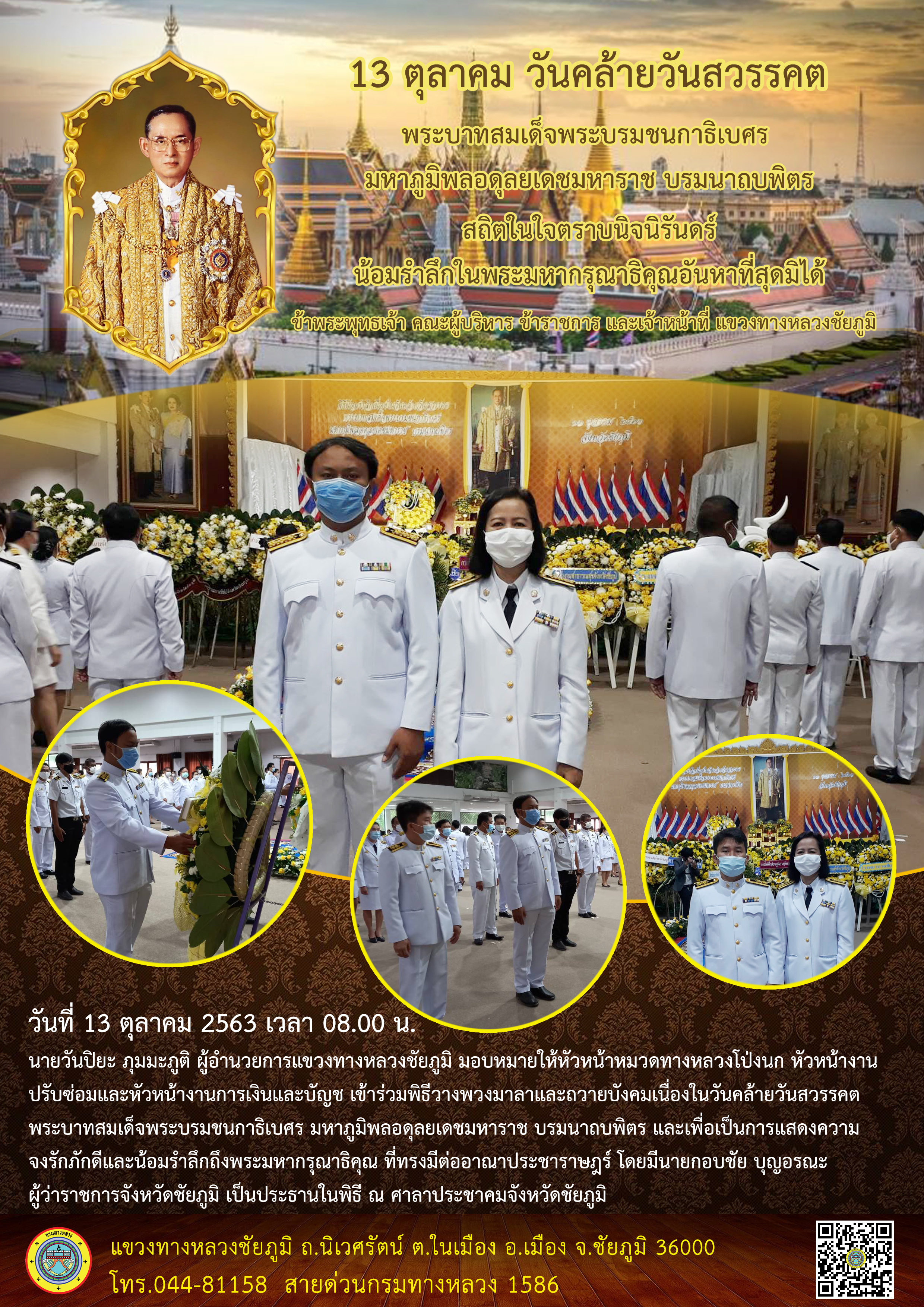 วันที่ 13 ตุลาคม 2563 เวลา 8.00 น. นายวันปิยะ ภูมมะภูติ ผู้อำนวยการแขวงทางหลวงชัยภูมิ มอบหมายให้หัวหน้าหมวดทางหลวงโป่งนก หัวหน้างานปรับซ่อม หัวหน้างานการเงินและบัญชี เข้าร่วมพิธีวางพวงมาลาและถวายบังคมเนื่องในวันคล้ายวันสวรรคต พระบาทสมเด็จพระบรมชนกาธิเบศร มหาภูมิพลอดุลยเดชมหาราช บรมนาถบพิตร และเพื่อเป็นการแสดงความจงรักภักดีและน้อมรำลึกถึงพระมหากรุณาธิคุณ ที่ทรงมีต่ออาณาประชาราษฎร์ โดยมี นายกอบชัย บุญอมรณะ ผู้ว่าราชการจังหวัดชัยภูมิ เป็นประธานในพิธี ณ ศาลาประชาคมจังหวัดชัยภูมิ