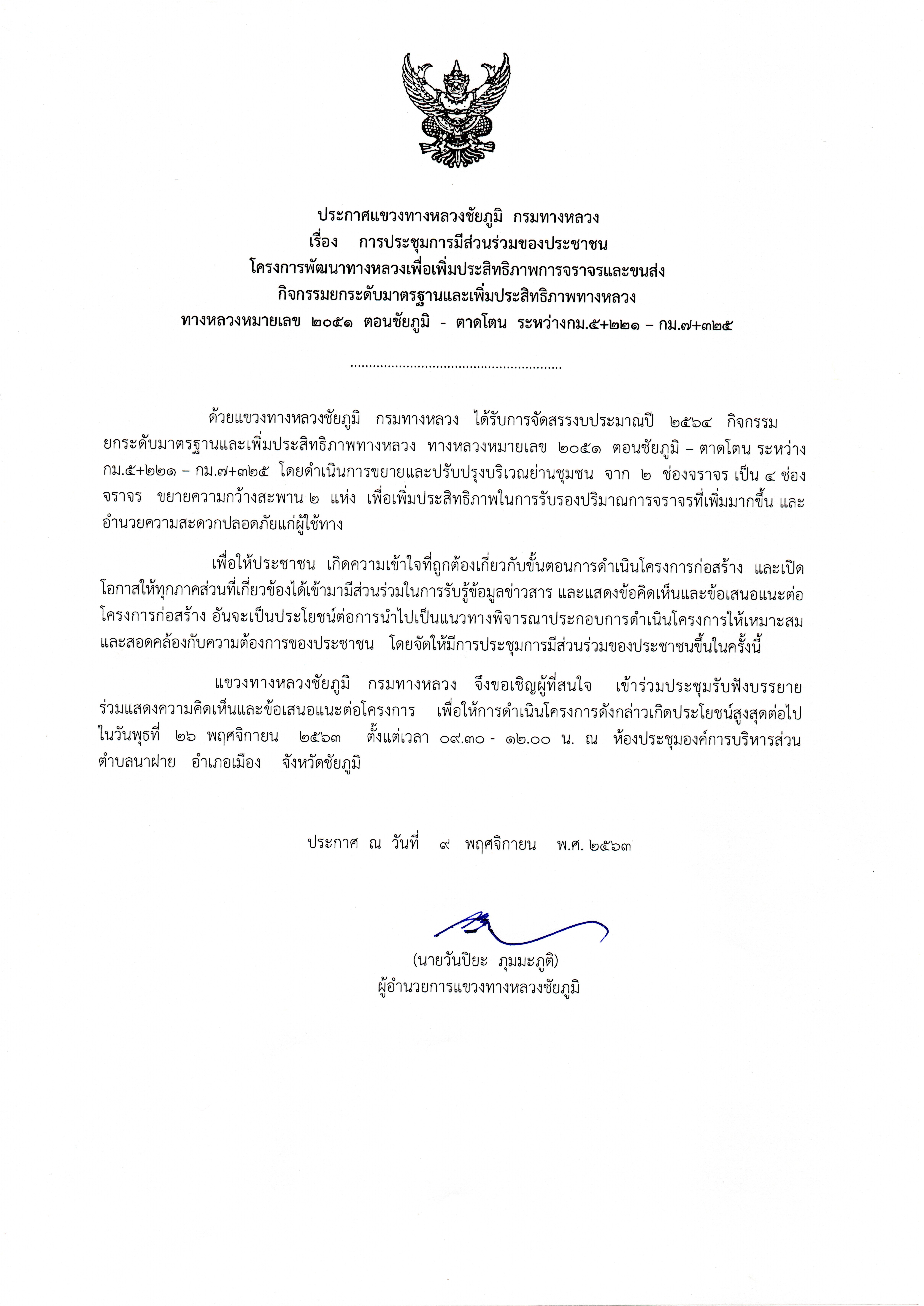 แขวงทางหลวงชัยภูมิจัดประชุมการมีส่วนร่วมของประชาชน โครงการพัฒนาทางหลวงเพื่อเพิ่มประสิทธิภาพการจราจรและขนส่ง