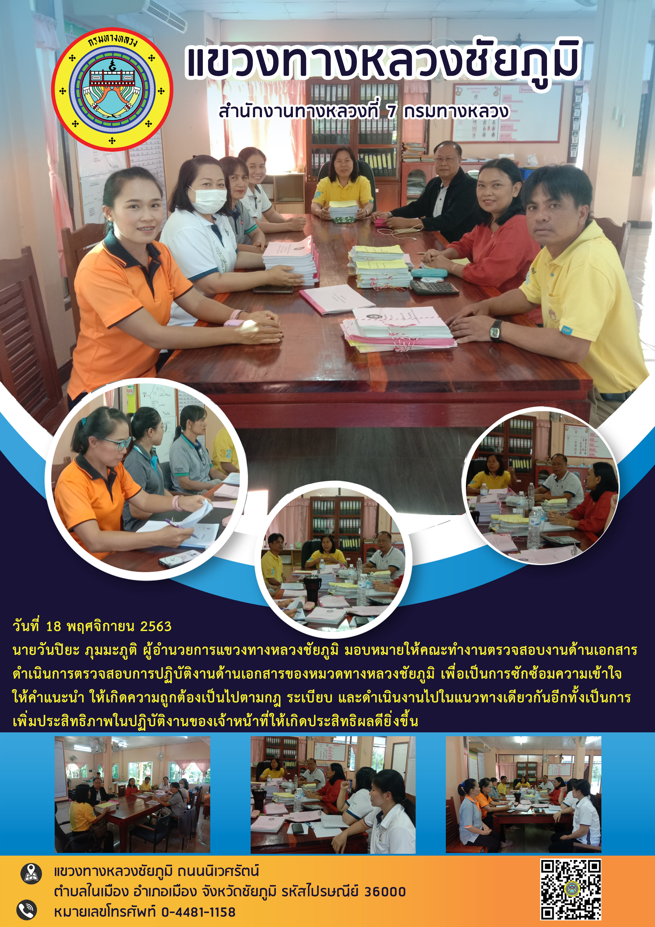วันที่ 18 พฤศจิกายน 2563 นายวันปิยะ ภุมมะภูติ ผู้อำนวยการแขวงทางหลวงชัยภูมิ มอบหมายให้คณะทำงานตรวจสอบงานด้านเอกสาร ดำเนินการตรวจสอบการปฏิบัติงานด้านเอกสารของหมวดทางหลวงชัยภูมิ เพื่อเป็นการซักซ้อมความเข้าใจ ให้คำแนะนำ ให้เกิดความถูกต้องเป็นไปตามกฎ ระเบียบ และดำเนินงานไปในแนวทางเดียวกันอีกทั้งเป็นการเพิ่มประสิทธิภาพในปฏิบัติงานของเจ้าหน้าที่ให้เกิดประสิทธิผลดียิ่งขึ้น