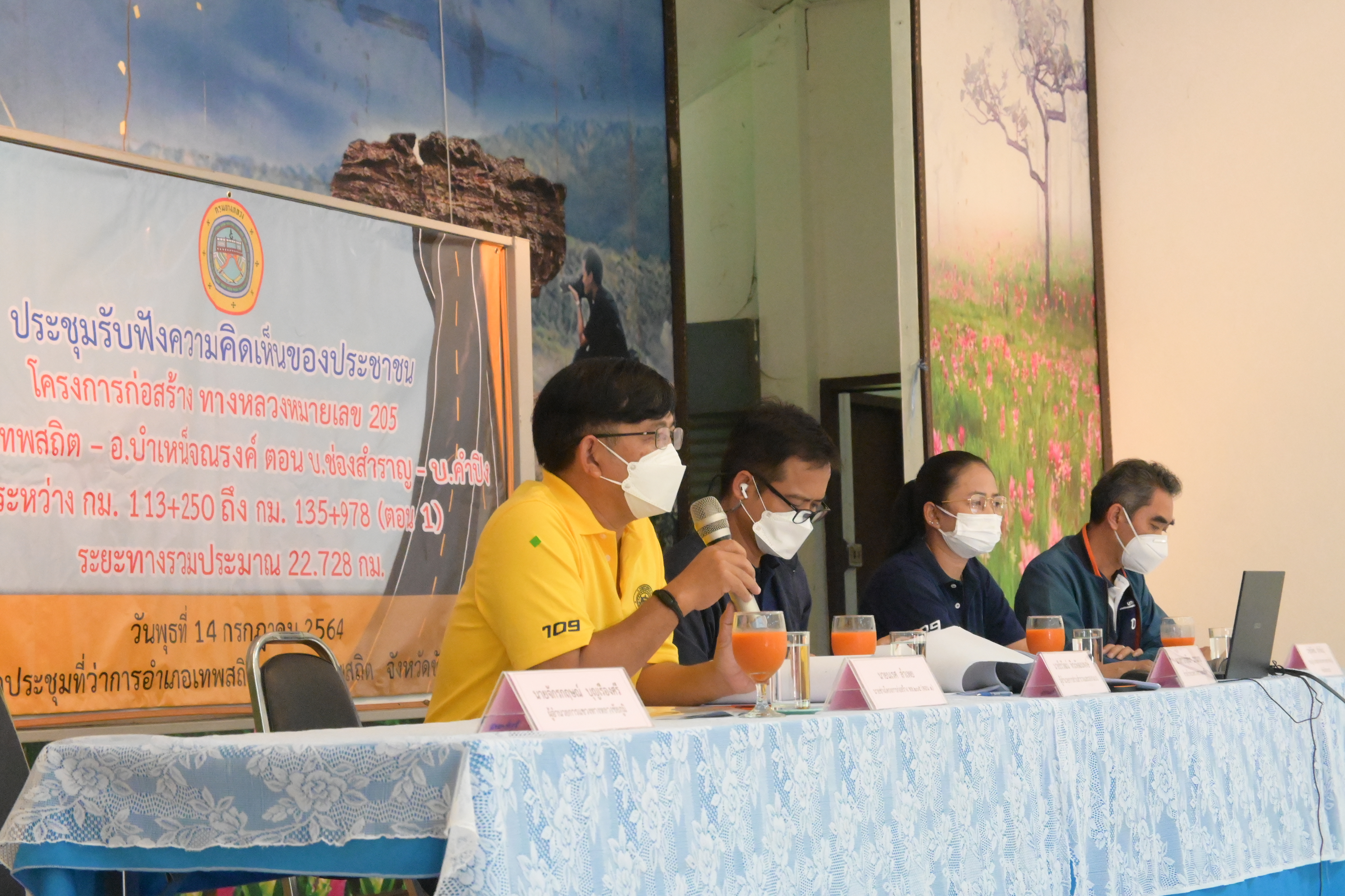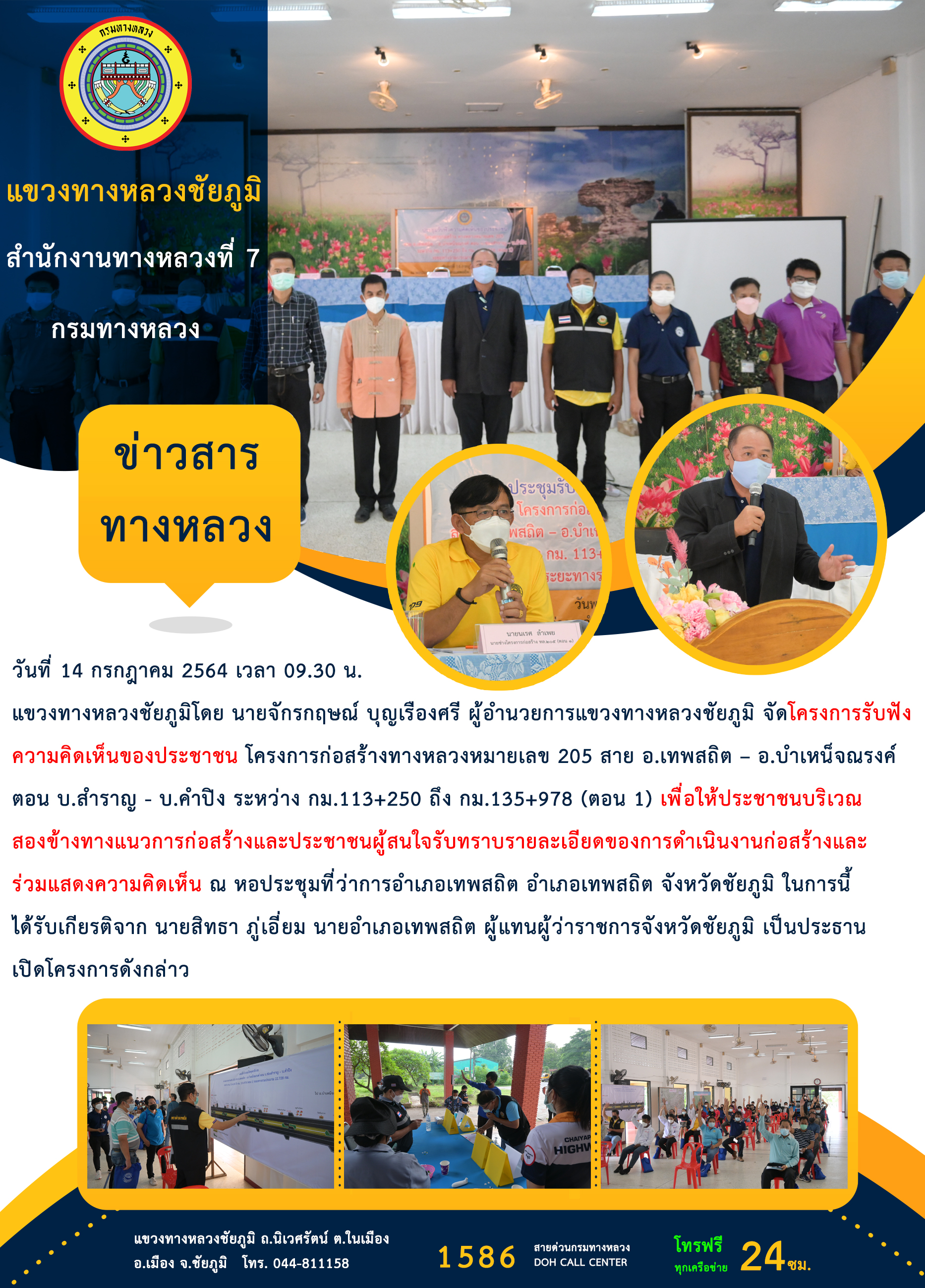 วันที่ 14 กรกฎาคม 2564 เวลา 09.30 น. แขวงทางหลวงชัยภูมิโดย นายจักรกฤษณ์ บุญเรืองศรี ผู้อำนวยการแขวงทางหลวงชัยภูมิ จัดโครงการรับฟังความคิดเห็นของประชาชน โครงการก่อสร้างทางหลวงหมายเลข 205 สาย อ.เทพสถิต – อ.บำเหน็จณรงค์ ตอน บ.สำราญ - บ.คำปิง ระหว่าง กม.113+250 ถึง กม.135+978 (ตอน 1) เพื่อให้ประชาชนบริเวณสองข้างทางแนวการก่อสร้างและประชาชนผู้สนใจรับทราบรายละเอียดของการดำเนินงานก่อสร้างและร่วมแสดงความคิดเห็น ณ หอประชุมที่ว่าการอำเภอเทพสถิต อำเภอเทพสถิต จังหวัดชัยภูมิ ในการนี้ได้รับเกียรติจาก นายสิทธา ภู่เอี่ยม นายอำเภอเทพสถิต ผู้แทนผู้ว่าราชการจังหวัดชัยภูมิ เป็นประธานเปิดโครงการดังกล่าว