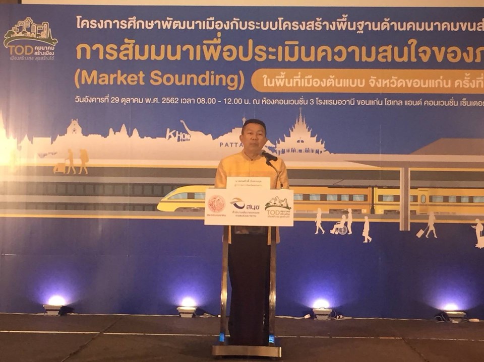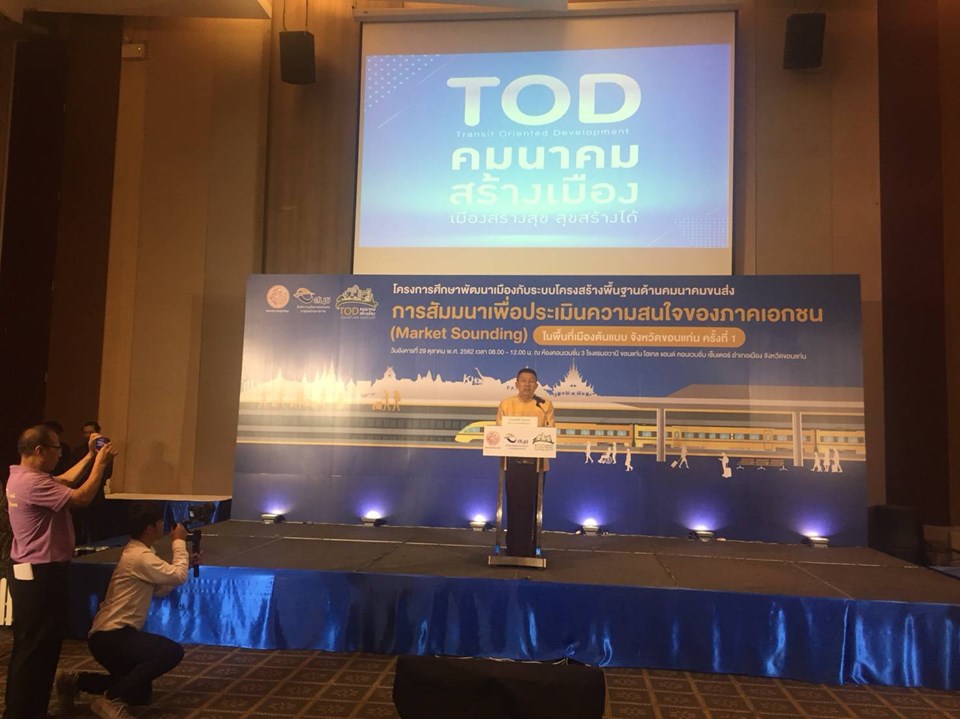 มอบหมายให้ นายเสน่ห์ เจริญวงศ์ ผู้อำนวยการส่วนแผนงาน เข้าร่วมการสัมมนาเพื่อประเมินความสนใจของภาคเอกชน(Market Sounding) ในพื้นที่เมืองต้นแบบจังหวัดขอนแก่น ครั้งที่ 1 โครงการศึกษาพัฒนาเมืองกับระบบโครงสร้างพื้นฐาน ซึ่งโครงการนี้ เป็นโครงการของสำนักนโยบายและแผนการขนส่งและจราจร (สนข.) โดยมีเป้าหมายในการพัฒนาเมืองโดยรอบแนวโครงข่ายเส้นทางรอบสถานีขนส่งมวลชน (Transit-oriented Development : TOD) เพื่อเป็นกรอบชี้นำการพัฒนาเมืองควบคู่กับการพัฒนาระบบคมนาคมขนส่ง ช่วยสร้างมูลค่าเพิ่มให้กับระบบคมนาคมขนส่งและเพิ่มขีดความสามารถในการแข่งขันของประเทศ โดยมีระยะเวลาดำเนินโครงการ 18 เดือน ซึ่งปัจจุบันการศึกษาอยู่ในขั้นตอนของการจัดสัมมนาเพื่อประเมินความสนใจภาคเอกชน (Market Sounding) ในพื้นที่เมืองต้นแบบ