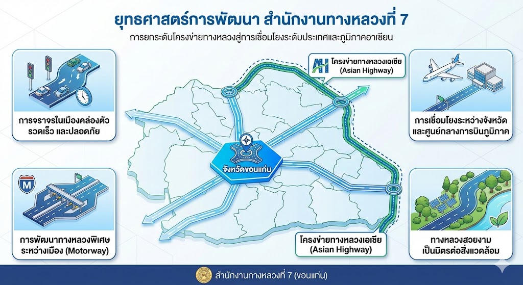 สำนักงานทางหลวงที่ 7 ดำเนินการปรับเปลี่ยนและยกระดับยุทธศาสตร์การพัฒนาโครงข่ายทางหลวงให้มีความทันสมัย มีประสิทธิภาพ และสอดคล้องกับทิศทางการพัฒนาคมนาคมขนส่งของประเทศและภูมิภาค โดยมุ่งเน้นการเชื่อมโยงโครงข่ายทางหลวงภายในประเทศเข้ากับโครงข่ายทางหลวงระหว่างประเทศ (Asian Highway) เพื่อสนับสนุนการเดินทาง การขนส่ง และการพัฒนาเศรษฐกิจในระดับภูมิภาคอย่างยั่งยืน ทั้งนี้ มีแนวทางดำเนินการที่สำคัญ ดังนี้