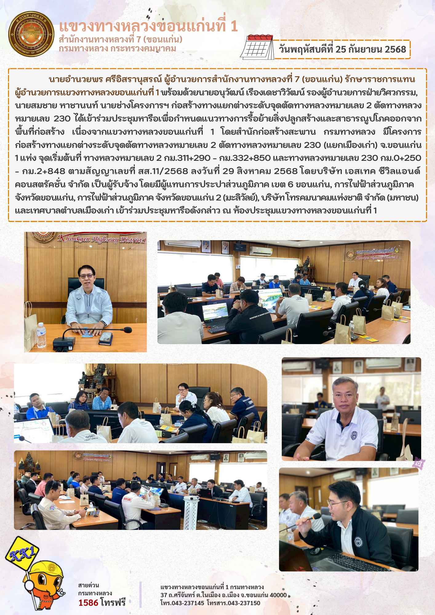 ประชุมหารือเพื่อกำหนดแนวทางการรื้อย้ายสิ่งปลูกสร้างและสาธารณูปโภคออกจากพื้นที่ก่อสร้าง เนื่องจากแขวงทางหลวงขอนแก่นที่ 1 โดยสำนักก่อสร้างสะพาน กรมทางหลวง มีโครงการก่อสร้างทางแยกต่างระดับจุดตัดทางหลวงหมายเลข 2 ตัดทางหลวงหมายเลข 230 (แยกเมืองเก่า) จ.ขอนแก่น 1 แห่ง