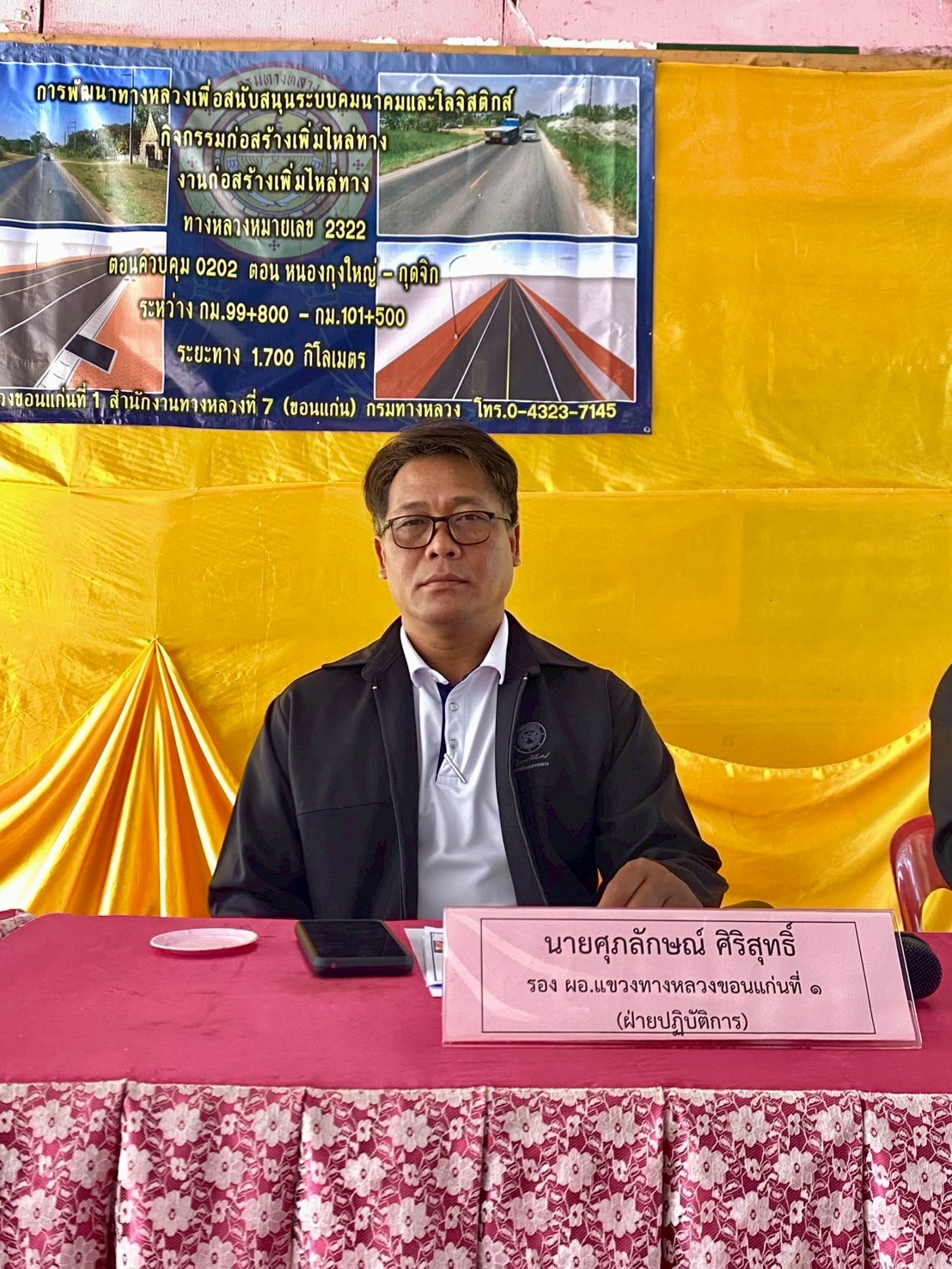 ประชุมโครงการการพัฒนาทางหลวงเพื่อสนับสนุนระบบคมนาคม และโลจิสติกส์ กิจกรรมก่อสร้างเพิ่มไหล่ทาง ทางหลวงหมายเลข 2322 ตอนควบคุม 0202 ตอน หนองกุงใหญ่ - กุดจิก ระหว่าง กม.99+800 - กม.101+500