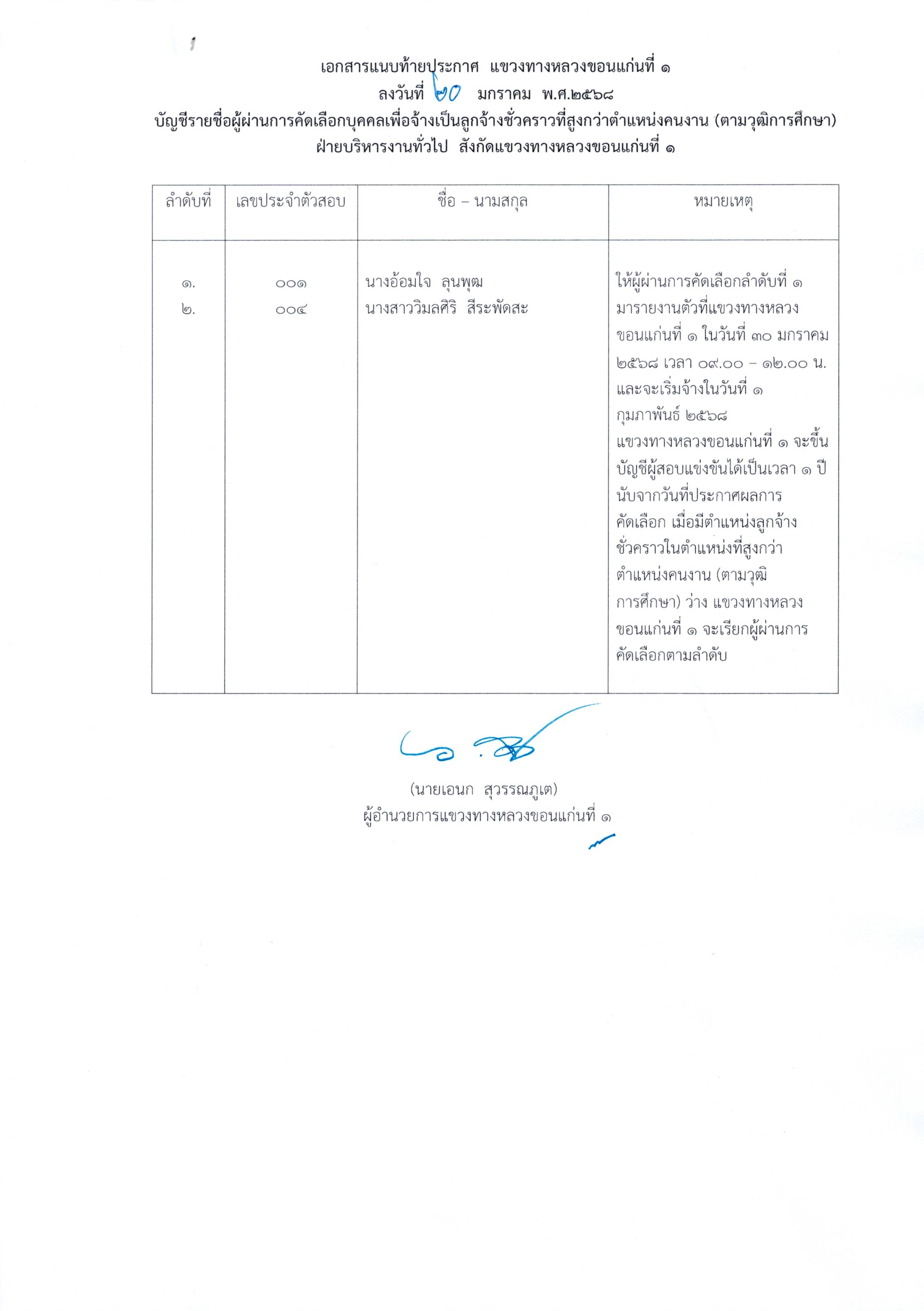 เรื่อง ประกาศรายชื่อผู้ผ่านการคัดเลือกเพื่อจ้างเป็นลูกจ้างชั่วคราวที่สูงกว่าตำแหน่งคนงาน (ตามวุฒิการศึกษา) ฝ่ายบริหารงานทั่วไป ตามประกาศแขวงทางหลวงขอนแก่นที่ 1 กรมทางหลวง ลงวันที่ 7 มกราคม 2568