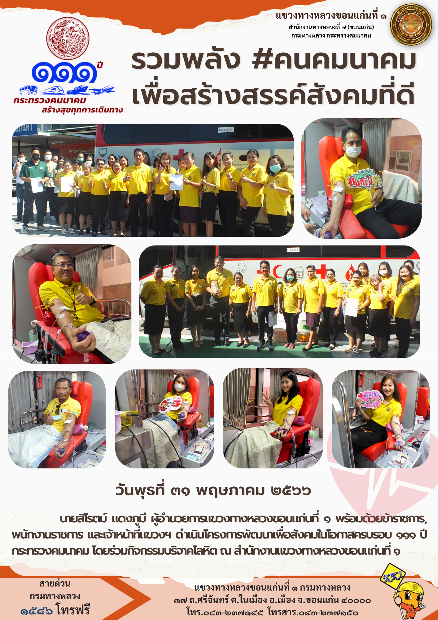 นายสิโรตม์ แดงภูมี ผู้อำนวยการแขวงทางหลวงขอนแก่นที่ 1 พร้อมด้วยข้าราชการ, พนักงานราชการ และเจ้าหน้าที่แขวงฯ ดำเนินโครงการพัฒนาเพื่อสังคมในโอกาสครบรอบ 111 ปี กระทรวงคมนาคม โดยร่วมกิจกรรมบริจาคโลหิต ณ สำนักงานแขวงทางหลวงขอนแก่นที่ 1