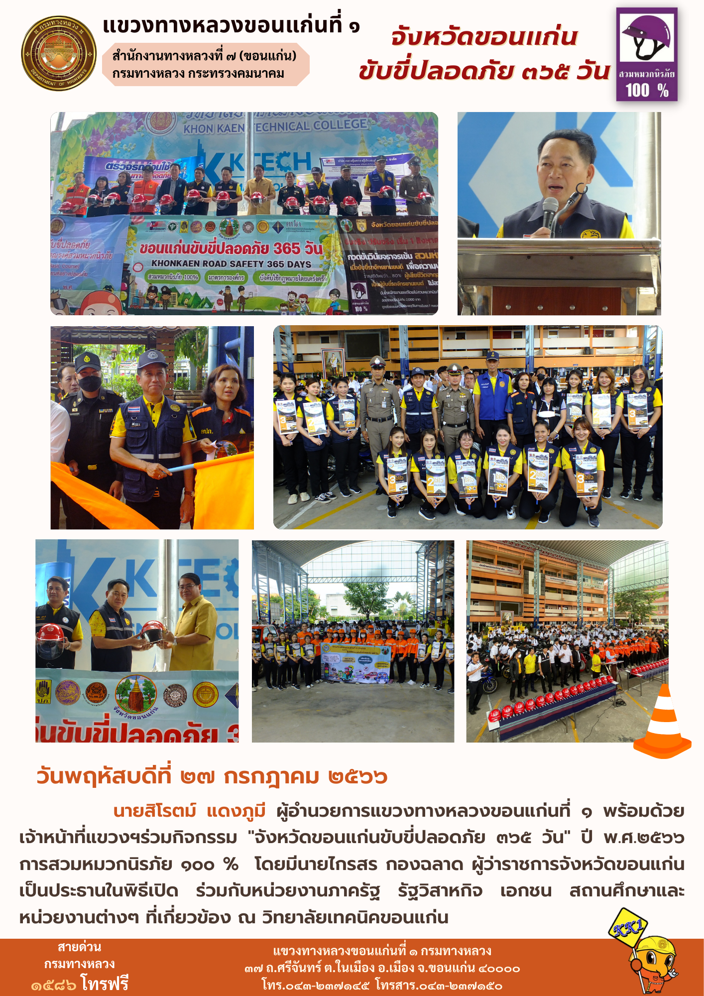 นายสิโรตม์ แดงภูมี ผู้อำนวยการแขวงทางหลวงขอนแก่นที่ 1 พร้อมด้วย เจ้าหน้าที่แขวงฯร่วมกิจกรรม "จังหวัดขอนแก่นขับขี่ปลอดภัย 365 วัน" ปี พ.ศ.2566 การสวมหมวกนิรภัย 100 % โดยมีนายไกรสร กองฉลาด ผู้ว่าราชการจังหวัดขอนแก่นเป็นประธานในพิธีเปิด ร่วมกับหน่วยงานภาครัฐ รัฐวิสาหกิจ เอกชน สถานศึกษาและหน่วยงานต่างๆ ที่เกี่ยวข้อง ณ วิทยาลัยเทคนิคขอนแก่น