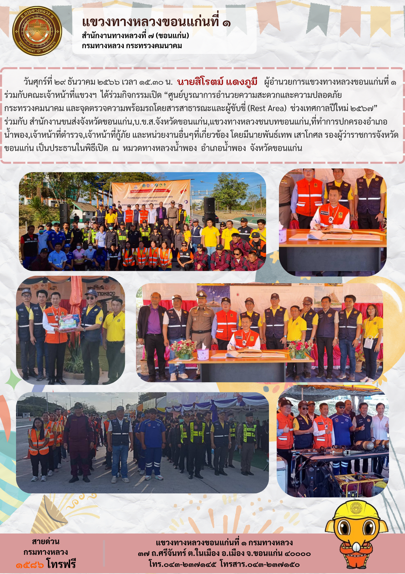 วันศุกร์ที่ 29 ธันวาคม 2566 เวลา 15.30 น. นายสิโรตม์ แดงภูมี ผู้อำนวยการแขวงทางหลวงขอนแก่นที่ 1 ร่วมกับคณะเจ้าหน้าที่แขวงฯ ได้ร่วมกิจกรรมเปิด “ศูนย์บูรณาการอำนวยความสะดวกและความปลอดภัย กระทรวงคมนาคม และจุดตรวจความพร้อมรถโดยสารสาธารณะและผู้ขับขี่ (Rest Area) ช่วงเทศกาลปีใหม่ ๒๕๖๗” ร่วมกับ สำนักงานขนส่งจังหวัดขอนแก่น,บ.ข.ส.จังหวัดขอนแก่น,แขวงทางหลวงชนบทขอนแก่น,ที่ทำการปกครองอำเภอน้ำพอง,เจ้าหน้าที่ตำรวจ,เจ้าหน้าที่กู้ภัย และหน่วยงานอื่นๆที่เกี่ยวข้อง โดยมีนายพันธ์เทพ เสาโกศล รองผู้ว่าราชการจังหวัดขอนแก่น เป็นประธานในพิธีเปิด ณ หมวดทางหลวงน้ำพอง อำเภอน้ำพอง จังหวัดขอนแก่น