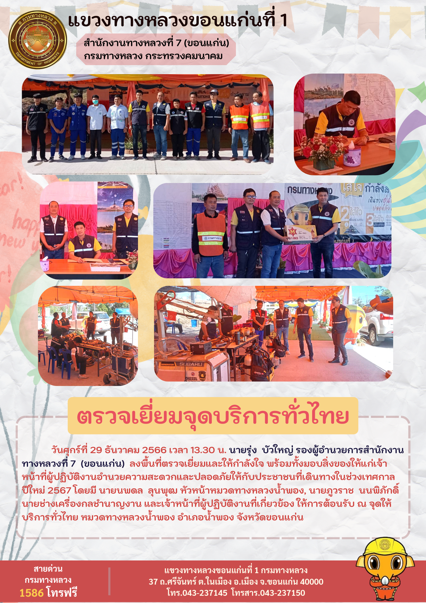 นายรุ่ง บัวใหญ่รักษา รองผู้อำนวยการสำนักงานทางหลวงที่ 7 ตำแหน่งที่ 1 ตรวจเยี่ยม ตรวจความพร้อม จุดให้บริการประชาชน จุดให้บริการทั่วไทย ช่วงเทศกาลกาลปีใหม่ 2567