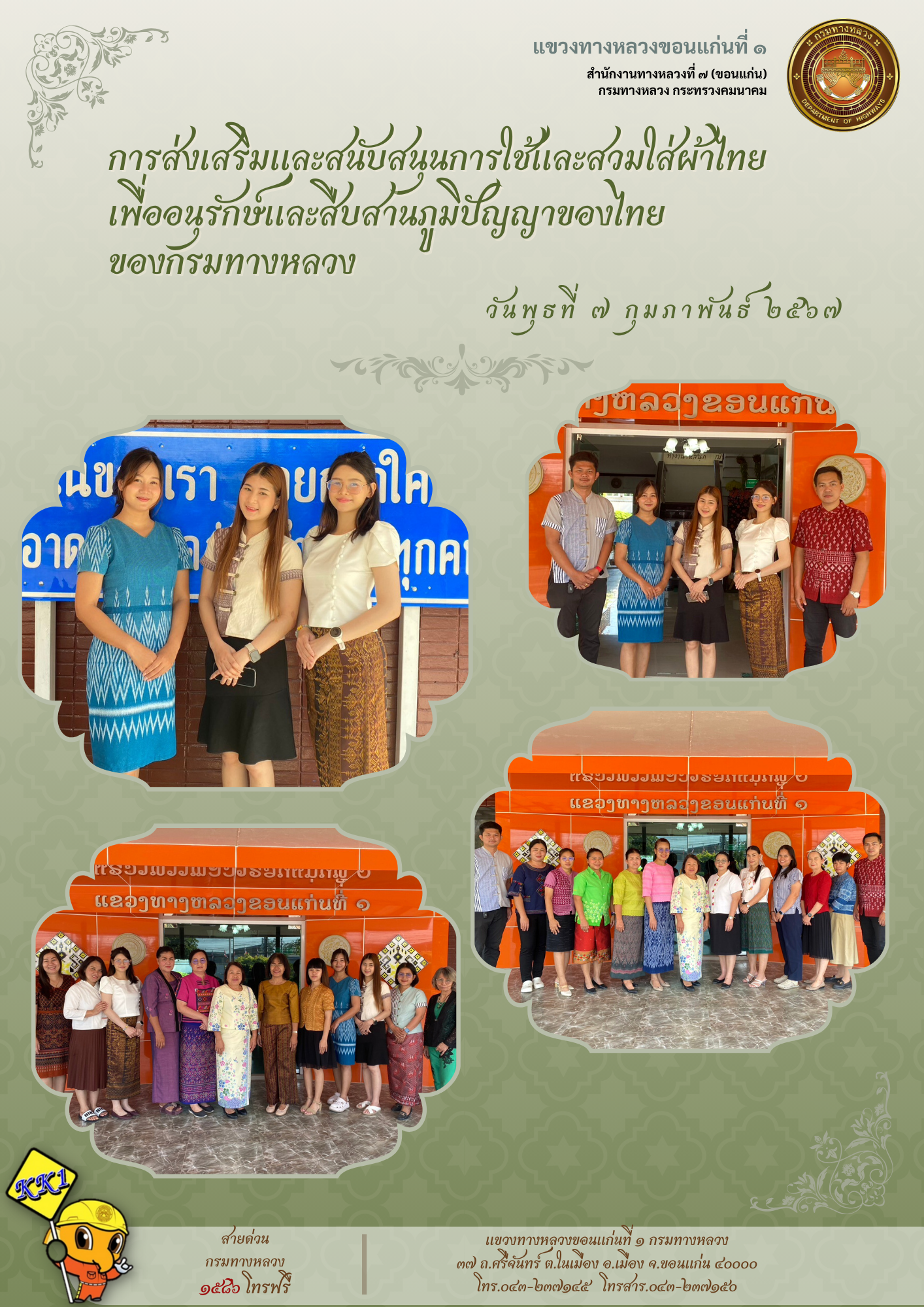 วันพุธที่ 7 กุมภาพันธ์ 2567 คณะผู้บริหาร ข้าราชการ และเจ้าหน้าที่ ร่วมกันแต่งกายด้วยชุดผ้าไทย ตามมาตรการส่งเสริมและสนับสนุนการใช้และสวมใส่ผ้าไทยของกรมทางหลวง ซึ่งเป็นนโยบายของรัฐบาล เพื่อเป็นการอนุรักษ์และสืบสานภูมิปัญญาของคนไทยตามความเหมาะสมของท้องถิ่นทุกวันพุธและวันศุกร์ของสัปดาห์