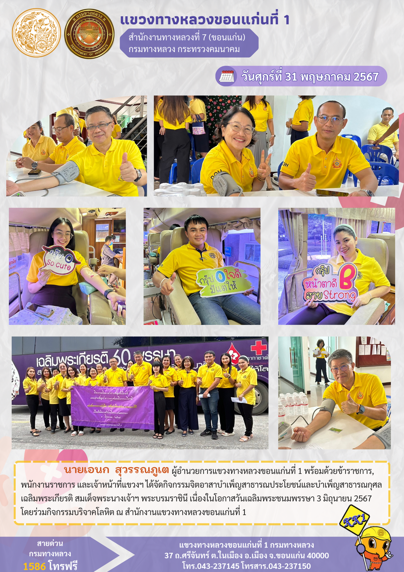 นายเอนก สุวรรณภูเต ผู้อำนวยการแขวงทางหลวงขอนแก่นที่ 1 พร้อมด้วยข้าราชการ, พนักงานราชการ และเจ้าหน้าที่แขวงฯ ได้จัดกิจกรรมจิตอาสาบำเพ็ญสาธารณประโยชน์และบำเพ็ญสาธารณกุศลเฉลิมพระเกียรติ สมเด็จพระนางเจ้าฯ พระบรมราชินี เนื่องในโอกาสวันเฉลิมพระชนมพรรษา 3 มิถุนายน 2567 โดยร่วมกิจกรรมบริจาคโลหิต ณ สำนักงานแขวงทางหลวงขอนแก่นที่ 1