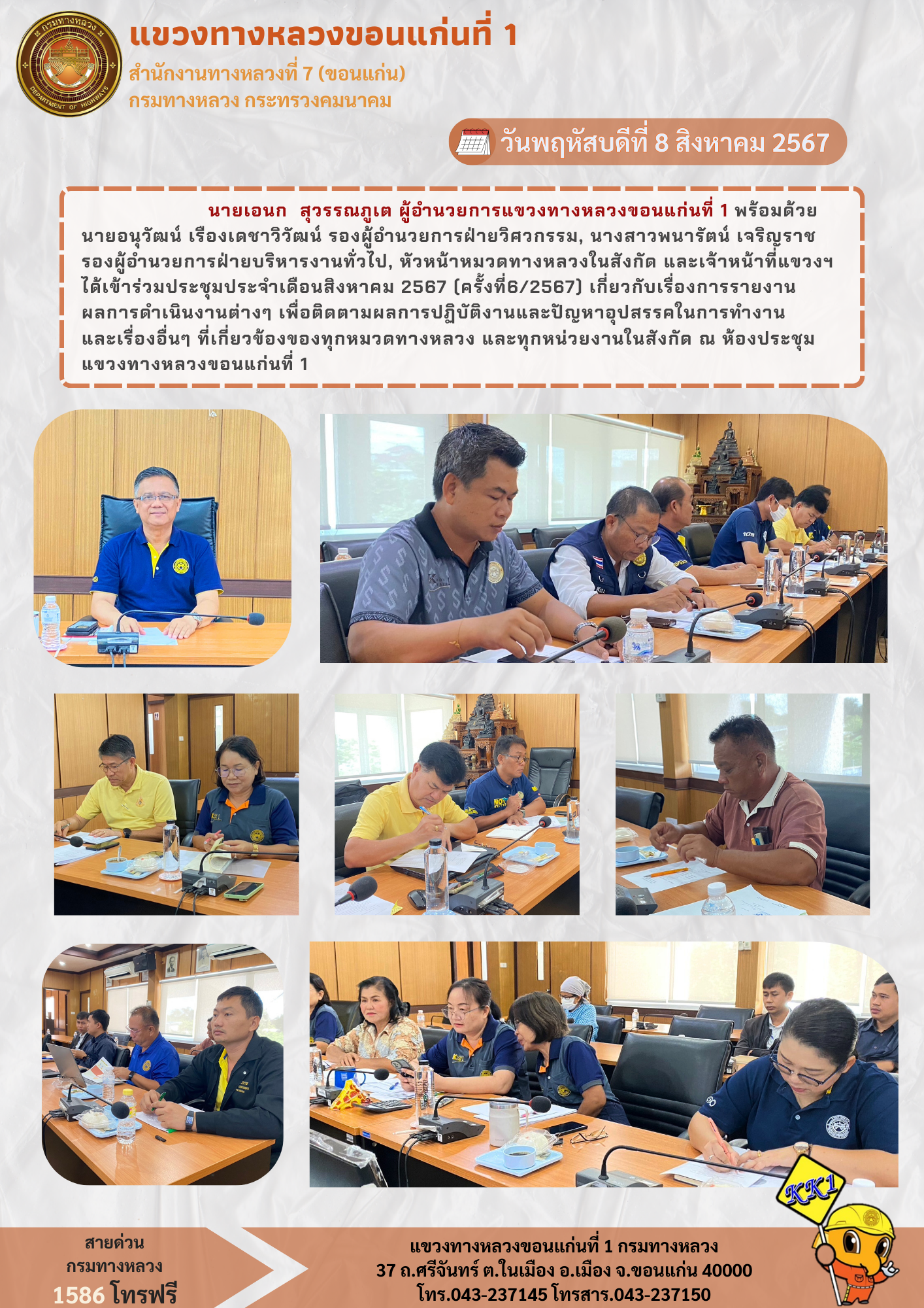 นายเอนก สุวรรณภูเต ผู้อำนวยการแขวงทางหลวงขอนแก่นที่ 1 พร้อมด้วยพร้อมด้วยนายศุภลักษณ์ ศิริสุทธิ์ รองผู้อำนวยการฝ่ายปฏิบัติการ, นายอนุวัฒน์ เรืองเดชาวิวัฒน์ รองผู้อำนวยการฝ่ายวิศวกรรม, นางสาวพนารัตน์ เจริญราช รองผู้อำนวยการฝ่ายบริหารงานทั่วไป, หัวหน้าหมวดทางหลวงในสังกัด และเจ้าหน้าที่แขวงฯ ได้เข้าร่วมประชุมประจำเดือนสิงหาคม 2567 (ครั้งที่6/2567) เกี่ยวกับเรื่องการรายงานผลการดำเนินงานต่างๆ เพื่อติดตามผลการปฏิบัติงานและปัญหาอุปสรรคในการทำงาน และเรื่องอื่นๆ ที่เกี่ยวข้องของทุกหมวดทางหลวง และทุกหน่วยงานในสังกัด ณ ห้องประชุมแขวงทางหลวงขอนแก่นที่ 1