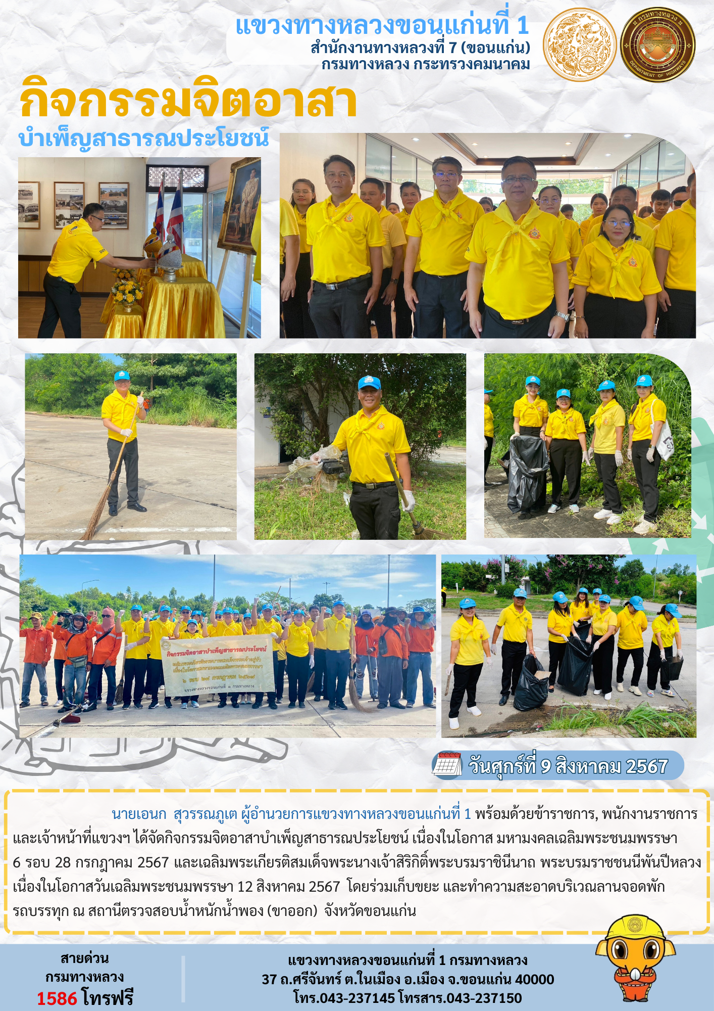 นายเอนก สุวรรณภูเต ผู้อำนวยการแขวงทางหลวงขอนแก่นที่ 1 พร้อมด้วยข้าราชการ, พนักงานราชการ และเจ้าหน้าที่แขวงฯ ได้จัดกิจกรรมจิตอาสาบำเพ็ญสาธารณประโยชน์ เนื่องในโอกาส มหามงคลเฉลิมพระชนมพรรษา 6 รอบ 28 กรกฎาคม 2567 และเฉลิมพระเกียรติสมเด็จพระนางเจ้าสิริกิติ์พระบรมราชินีนาถ พระบรมราชชนนีพันปีหลวง เนื่องในโอกาสวันเฉลิมพระชนมพรรษา 12 สิงหาคม 2567 โดยร่วมเก็บขยะ และทำความสะอาดบริเวณลานจอดพักรถบรรทุก ณ สถานีตรวจสอบน้ำหนักน้ำพอง (ขาออก) จังหวัดขอนแก่น