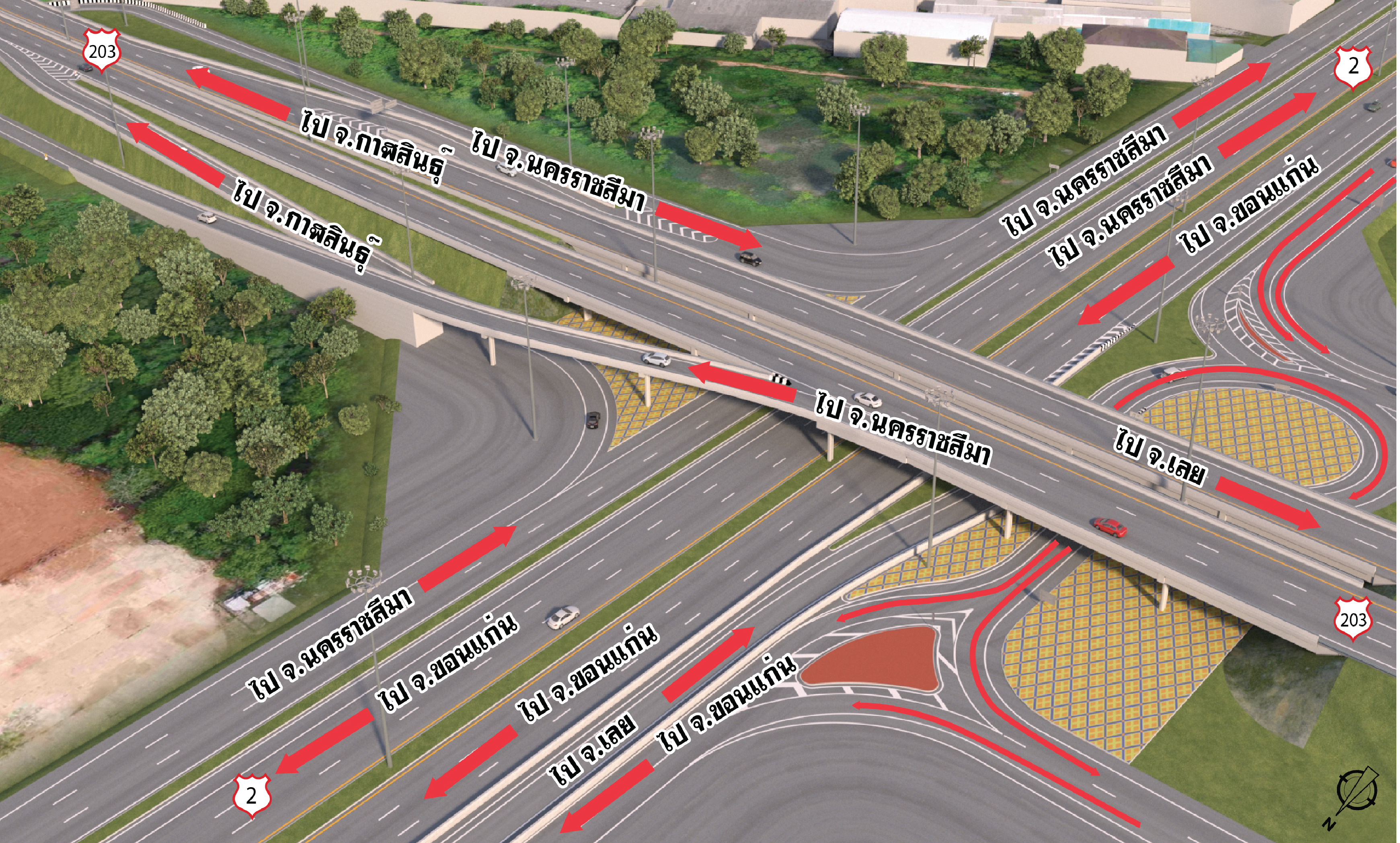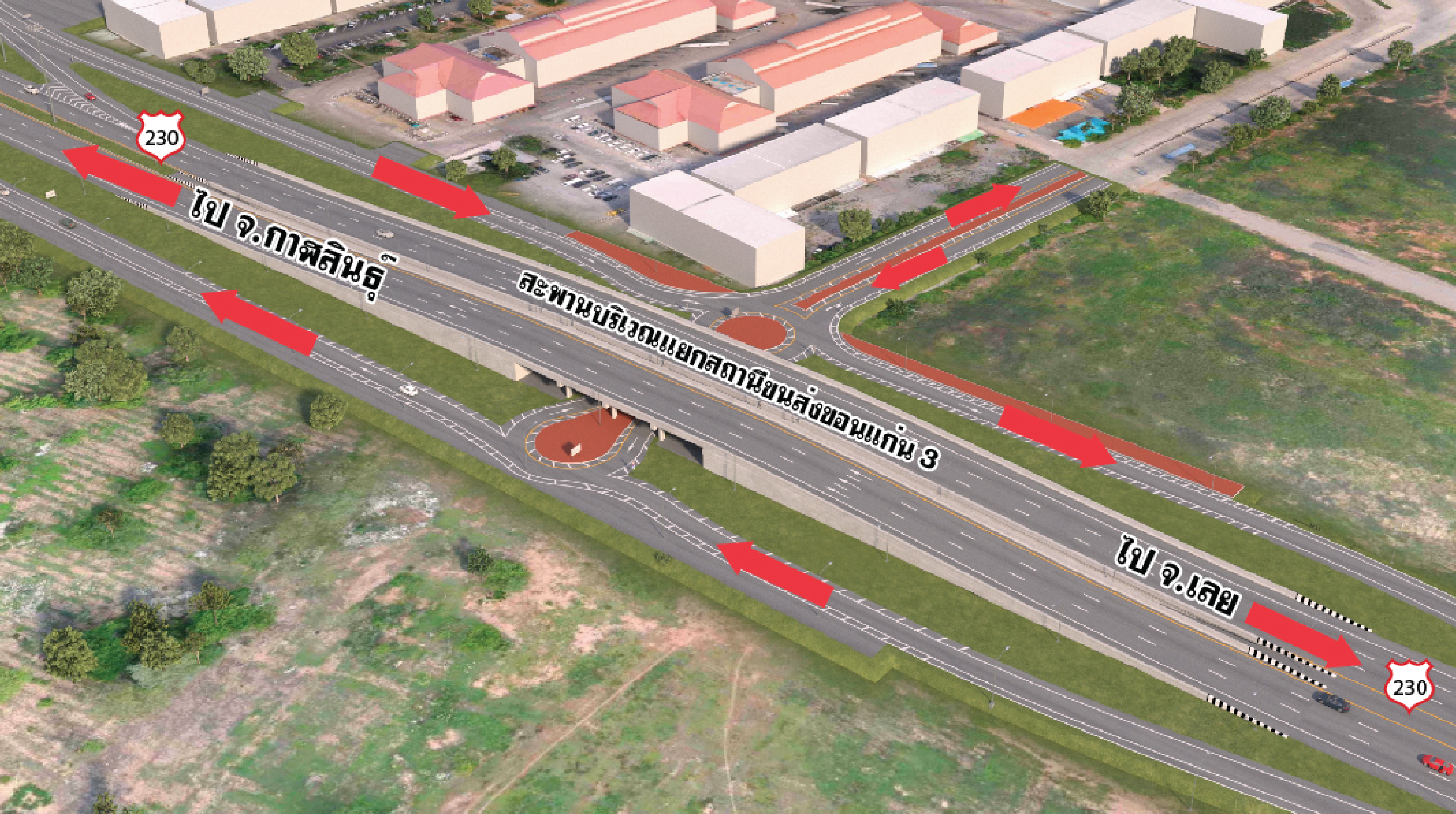 - ก่อสร้างทางแยกต่างระดับรูปแบบ One Directional Ramp With Overpass And Bridge Missing Link And Roundabout โดยแบ่งเป็นสะพานแนวใหม่ (Directional Ramp) บนทล.2 ทิศทางจากจังหวัดขอนแก่นไปสู่จังหวัดเลย ที่ กม.332+100 มีขนาดความกว้างขนาด 6 เมตร ยาว 362 เมตร และสะพานบริเวณทางเข้าสถานีขนส่งผู้โดยสารจังหวัดขอนแก่นแห่งที่ 3 ตามแนว ทล.230 ที่ กม.0+891.079 มีขนาดความกว้าง 14 เมตร ยาว 48 เมตร และก่อสร้างสะพานต่อขยายข้ามทล.2 ทิศทางจากจังหวัดเลยไปสู่จังหวัดนครราชสีมา บริเวณ กม.1+626 มีขนาดความกว้าง 14.50 เมตร ยาว 218 เมตร รวมทั้งสะพานต่อขยายข้ามทางรถไฟเพื่อเชื่อมการจราจรในทิศทางจากจังหวัดขอนแก่นไปจังหวัดกาฬสินธุ์ บริเวณ กม.0+318 มีขนาดความกว้าง 14.50 เมตร และความยาว 134 เมตร