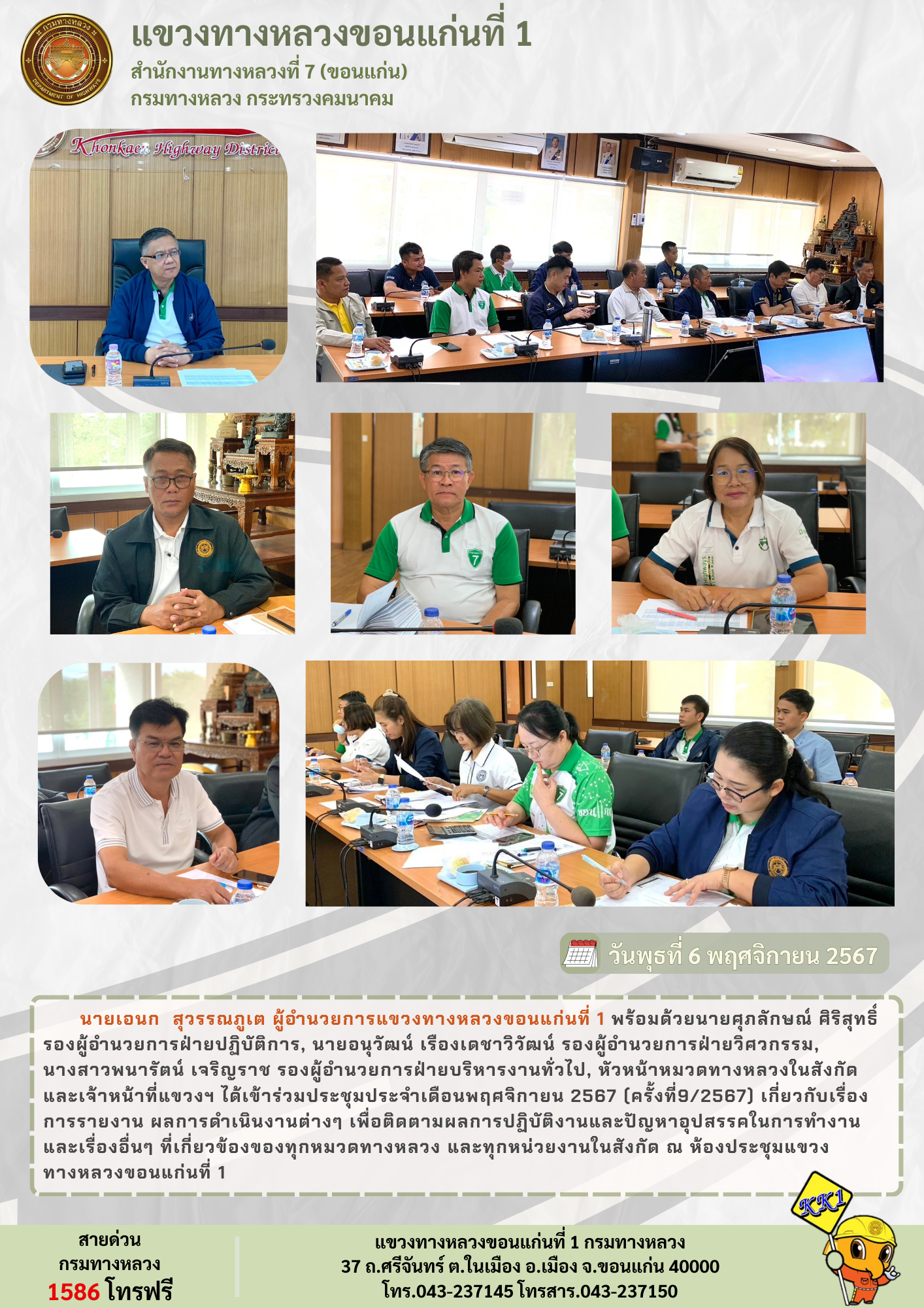 นายเอนก สุวรรณภูเต ผู้อำนวยการแขวงทางหลวงขอนแก่นที่ 1 พร้อมด้วยนายศุภลักษณ์ ศิริสุทธิ์ รองผู้อำนวยการฝ่ายปฏิบัติการ, นายอนุวัฒน์ เรืองเดชาวิวัฒน์ รองผู้อำนวยการฝ่ายวิศวกรรม, นางสาวพนารัตน์ เจริญราช รองผู้อำนวยการฝ่ายบริหารงานทั่วไป, หัวหน้าหมวดทางหลวงในสังกัด และเจ้าหน้าที่แขวงฯ ได้เข้าร่วมประชุมประจำเดือนพฤศจิกายน 2567 (ครั้งที่9/2567) เกี่ยวกับเรื่องการรายงาน ผลการดำเนินงานต่างๆ เพื่อติดตามผลการปฏิบัติงานและปัญหาอุปสรรคในการทำงาน และเรื่องอื่นๆ ที่เกี่ยวข้องของทุกหมวดทางหลวง และทุกหน่วยงานในสังกัด ณ ห้องประชุมแขวงทางหลวงขอนแก่นที่ 1