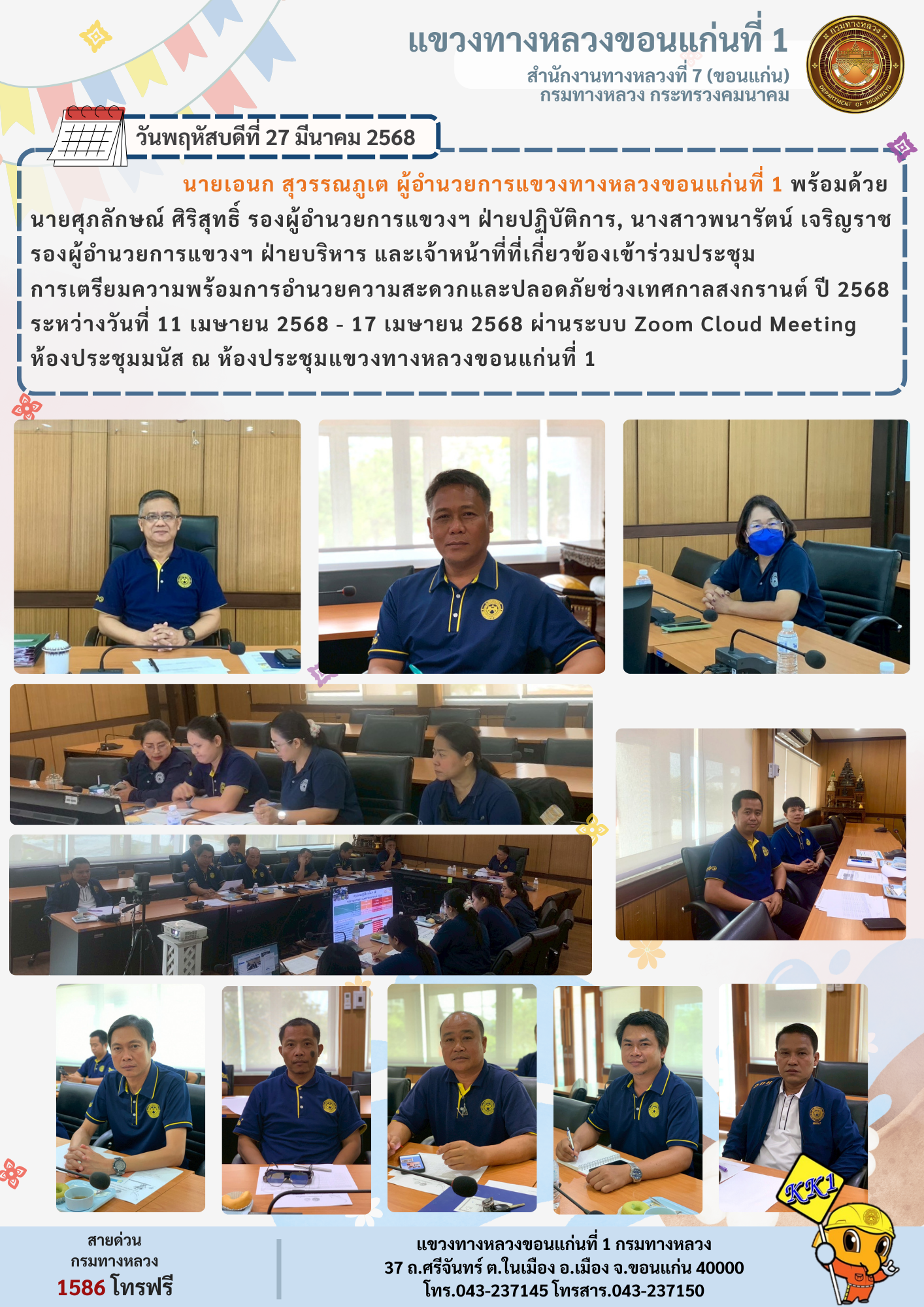 นายเอนก สุวรรณภูเต ผู้อำนวยการแขวงทางหลวงขอนแก่นที่ 1 พร้อมด้วยนายศุภลักษณ์ ศิริสุทธิ์ รองผู้อำนวยการแขวงฯ ฝ่ายปฏิบัติการ, นางสาวพนารัตน์ เจริญราช รองผู้อำนวยการแขวงฯ ฝ่ายบริหาร และเจ้าหน้าที่ที่เกี่ยวข้องเข้าร่วมประชุมการเตรียมความพร้อมด้านการอำนวยความสะดวกและปลอดภัยช่วงเทศกาลสงกรานต์ปี 2568 ระหว่างวันที่ 11 - 17 เมษายน 2568 ผ่านระบบ Zoom Cloud Meeting ห้องประชุมมนัส ณ ห้องประชุมแขวงทางหลวงขอนแก่นที่ 1