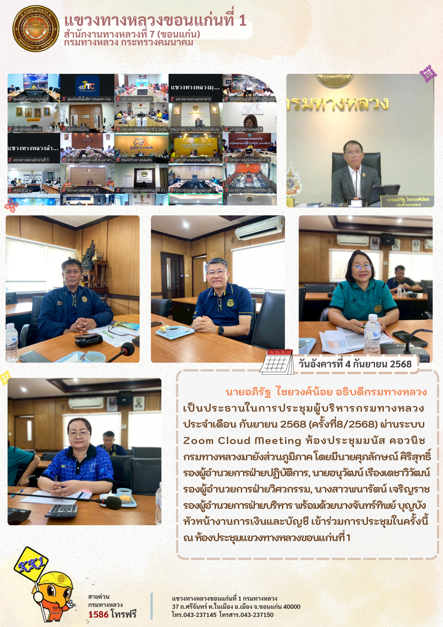 นายอภิรัฐ ไชยวงศ์น้อย อธิบดีกรมทางหลวงเป็นประธานในการประชุมผู้บริหารกรมทางหลวงประจำเดือน กันยายน 2568 (ครั้งที่8/2568) ผ่านระบบ Zoom Cloud Meeting ห้องประชุมมนัส คอวนิช กรมทางหลวงมายังส่วนภูมิภาค โดยมีนายศุภลักษณ์ ศิริสุทธิ์ รองผู้อำนวยการฝ่ายปฏิบัติการ, นายอนุวัฒน์ เรืองเดชาวิวัฒน์ รองผู้อำนวยการฝ่ายวิศวกรรม, นางสาวพนารัตน์ เจริญราช รองผู้อำนวยการฝ่ายบริหาร พร้อมด้วยนางจันทร์ทิพย์ บุญบัง หัวหน้างานการเงินและบัญชี เข้าร่วมการประชุมในครั้งนี้ ณ ห้องประชุมแขวงทางหลวงขอนแก่นที่ 1
