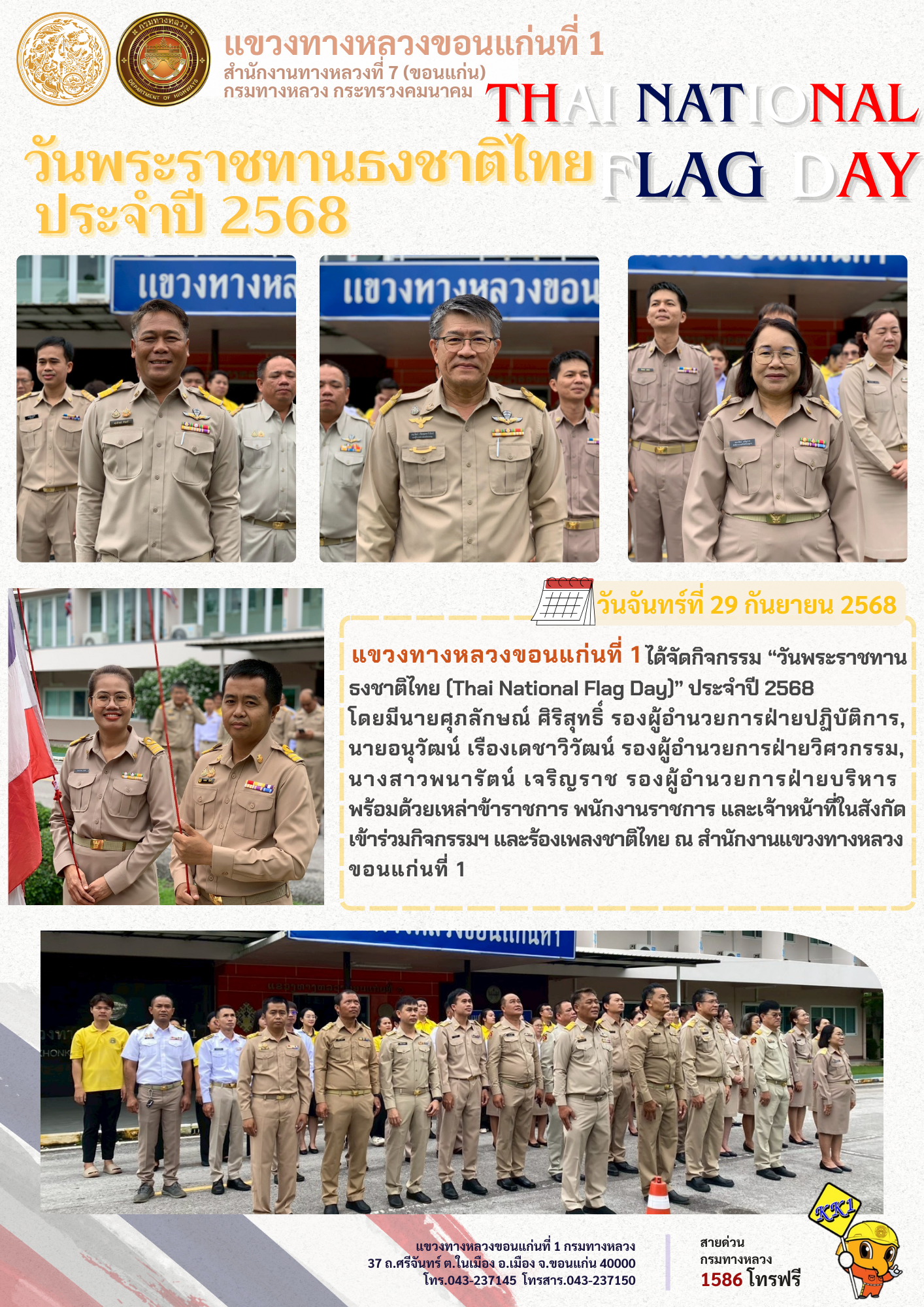 แขวงทางหลวงขอนแก่นที่ 1 ได้จัดกิจกรรม “วันพระราชทานธงชาติไทย (Thai National Flag Day)” ประจำปี 2568 โดยมีนายศุภลักษณ์ ศิริสุทธิ์ รองผู้อำนวยการฝ่ายปฏิบัติการ, นายอนุวัฒน์ เรืองเดชาวิวัฒน์ รองผู้อำนวยการฝ่ายวิศวกรรม, นางสาวพนารัตน์ เจริญราช รองผู้อำนวยการฝ่ายบริหาร พร้อมด้วยเหล่าข้าราชการ พนักงานราชการ และเจ้าหน้าที่ในสังกัด เข้าร่วมกิจกรรมฯ และร้องเพลงชาติไทย ณ สำนักงานแขวงทางหลวงขอนแก่นที่ 1