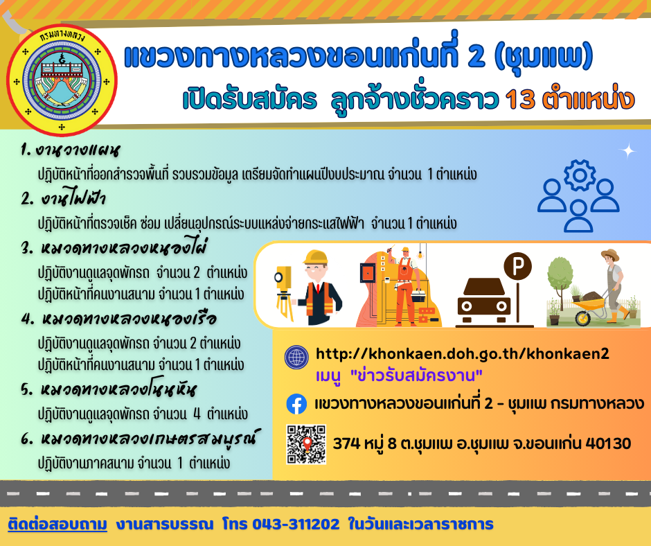 แขวงทางหลวงขอนแก่นที่ 2 (ชุมแพ) ประกาศรับสมัครบุคคล เพื่อสอบคัดเลือกจ้างเป็นลูกจ้างชั่วคราว (รายวัน) ทั้งหมด 13 ตำแหน่ง ดังนี้