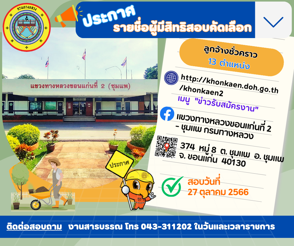 ตามประกาศ แขวงทางหลวงขอนแก่นที่ 2 (ชุมแพ) ลงวันที่ 16 ตุลาคม พ.ศ.2566 ได้ประกาศรับสมัครลูกจ้างชั่วคราวรายวัน โดยเริ่มรับสมัครตั้งแต่ วันที่ 16 ตุลาคม พ.ศ.2566 ถึงวันที่ 25 ตุลาคม พ.ศ.2566 บัดนี้ ได้สิ้นสุดการรับสมัครตามวันเวลาดังกล่าวแล้ว จึงขอประกาศรายชื่อผู้มีสิทธิสอบคัดเลือก รายละเอียดตามเอกสารแนบ