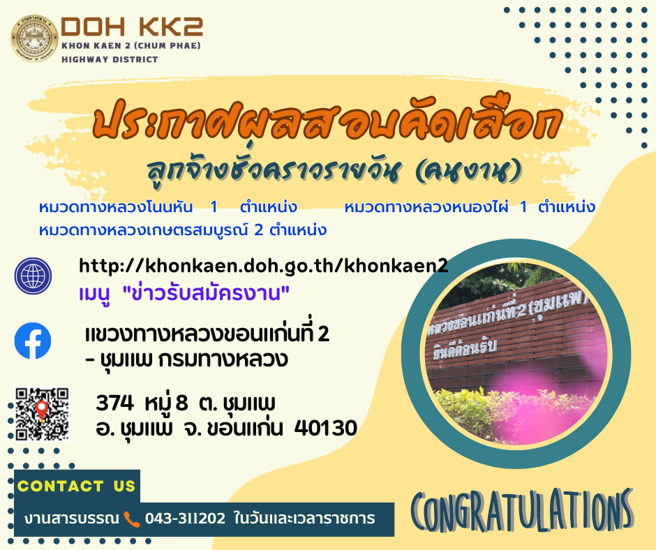 ตามที่แขวงทางหลวงขอนแก่นที่ 2 (ชุมแพ) ได้ดำเนินการรับสมัครคัดเลือกลูกจ้างชั่วคราวรายวันตามประกาศที่รับสมัคร ลงวันที่ 1 พฤษภาคม 2567 เพื่อจ้างเป็นลูกจ้างชั่วคราว ตำแหน่งคนงาม แขวงทางหลวงขอนแก่นที่ 2 (ชุมแพ) นั้น