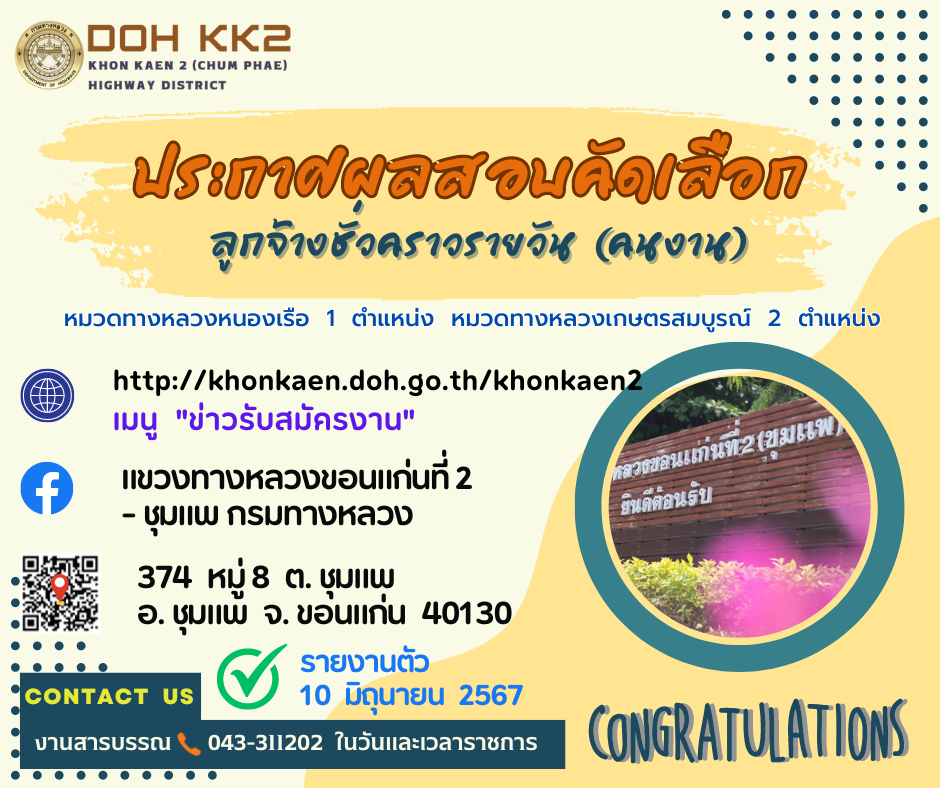 ตามที่แขวงทางหลวงขอนแก่นที่ ๒ (ชุมแพ) ได้ดำเนินการรับสมัครคัดเลือกลูกจ้างชั่วคราวรายวันตามประกาศที่รับสมัคร ลงวันที่ 27 พฤษภาคม 2567 เพื่อจ้างเป็นลูกจ้างชั่วคราวรายวัน ตำแหน่งคนงาน แขวงทางหลวงขอนแก่นที่ ๒ (ชุมแพ) นั้น บัดนี้ คณะกรรมการได้ดำเนินการประเมินสอบคัดเลือกเสร็จสิ้นแล้ว ในวันที่ 6 มิถุนายน 2567 จึงประกาศรายชื่อผู้ผ่านการคัดเลือกลูกจ้างชั่วคราวรายวัน ตามรายชื่อดังนี้ ทั้งนี้ บัญชีรายชื่อผู้สอบแข่งขันได้ใช้ได้ไม่เกิน 1 ปี นับตั้งแต่วันขึ้นบัญชี แต่ถ้ามีการแข่งขันใน ตำแหน่งเดียวกันนี้อีกและได้ขึ้นบัญชีผู้สอบแข่งขันได้ใหม่แล้ว บัญชีผู้สอบแข่งขันได้ครั้งนี้เป็นอันยกเลิก