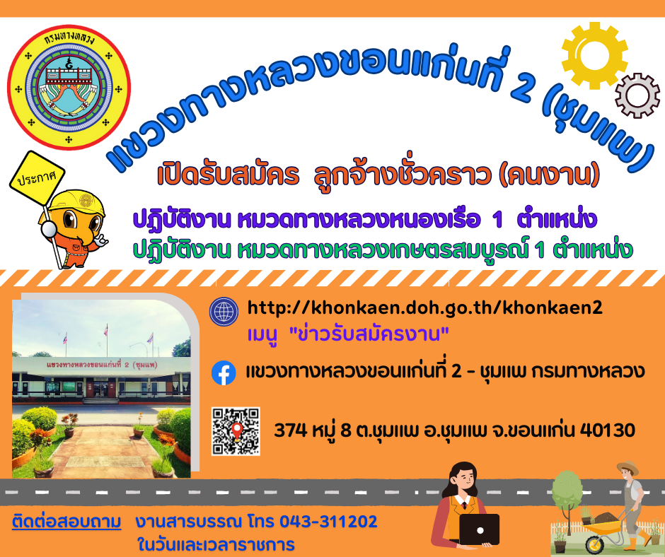 ด้วยแขวงทางหลวงขอนแก่นที่ 2 (ชุมแพ) สังกัดสำนักงานทางหลวงที่ 7 มีความประสงค์จะดำเนินการรับสมัครสอบคัดเลือกบุคคลเพื่อจ้างเป็นลูกจ้างชั่วคราวรายวัน ตำแหน่งคนงาน ปฏิบัติงาน หมวดทางหลวงหนองเรือ จำนวน 1 ตำแหน่ง และหมวดทางหลวงเกษตรสมบูรณ์ จำนวน 1 ตำแหน่ง ฝ่ายปฏิบัติการ แขวงทางหลวงขอนแก่นที่ 2 (ชุมแพ) รายละเอียดตามเอกสารแนบ