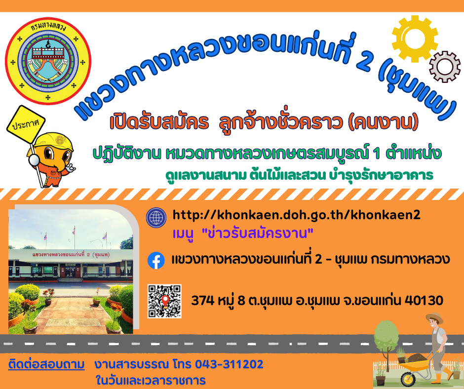 ด้วยแขวงทางหลวงขอนแก่นที่ 2 (ชุมแพ) สังกัดสำนักงานทางหลวงที่ 7 มีความประสงค์จะดำเนินการรับสมัครสอบคัดเลือกบุคคลเพื่อจ้างเป็นลูกจ้างชั่วคราวรายวัน ตำแหน่งคนงาน ปฏิบัติงาน หมวดทางหลวงเกษตรสมบูรณ์ จำนวน 1 ตำแหน่ง ฝ่ายปฏิบัติการ แขวงทางหลวงขอนแก่นที่ 2 (ชุมแพ) รายละเอียดตามเอกสารแนบ