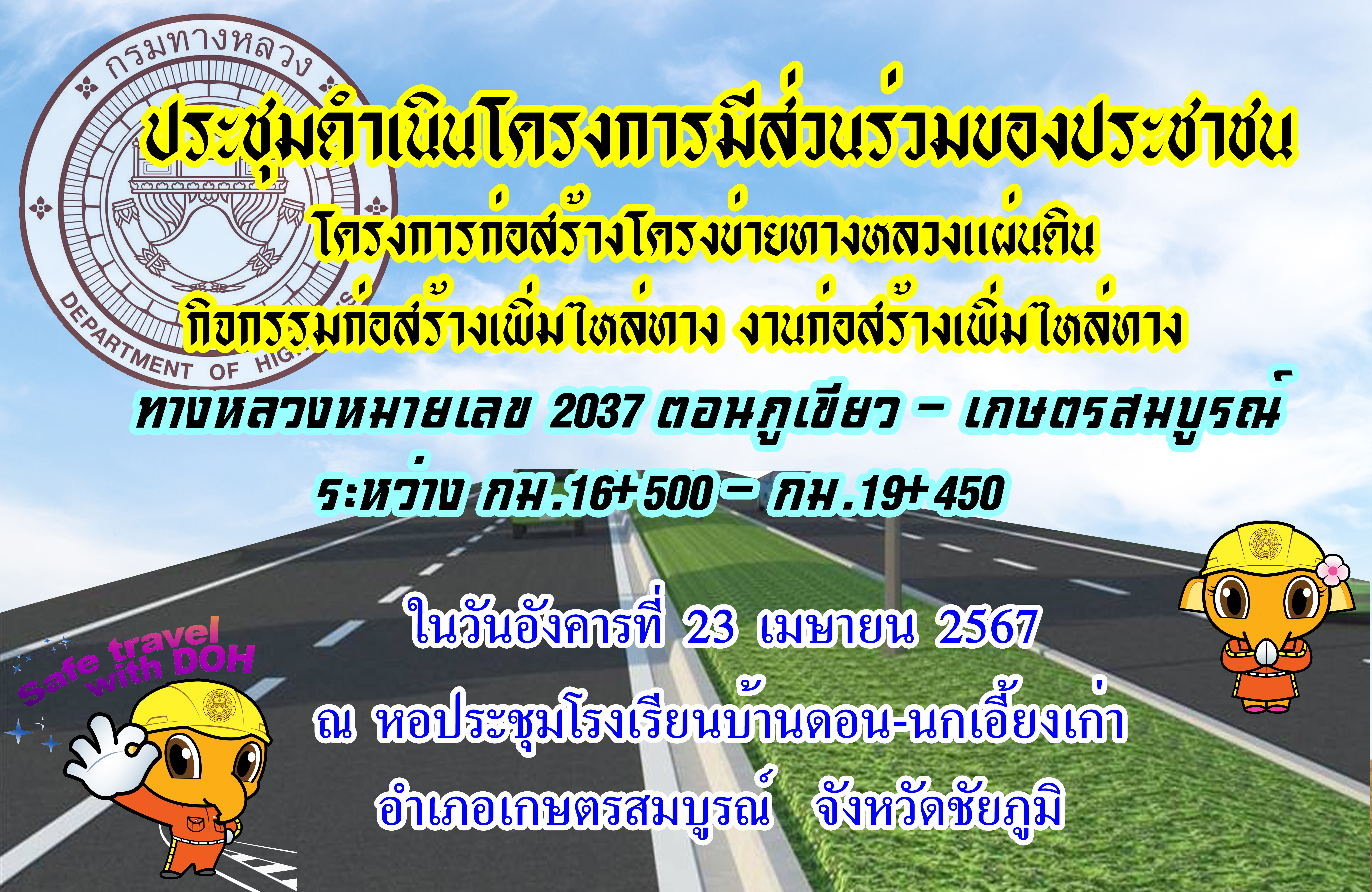 โครงการก่อสร้างโครงข่ายทางหลวงแผ่นดิน กิจกรรมก่อสร้างเพิ่มไหล่ทาง งานก่อสร้างเพิ่มไหล่ทาง ทางหลวงหมายเลข 2037 ตอนควบคุม 0100 ตอน ภูเขียว - เกษตรสมบูรณ์ ระหว่าง กม.16+500 – กม.19+450 |