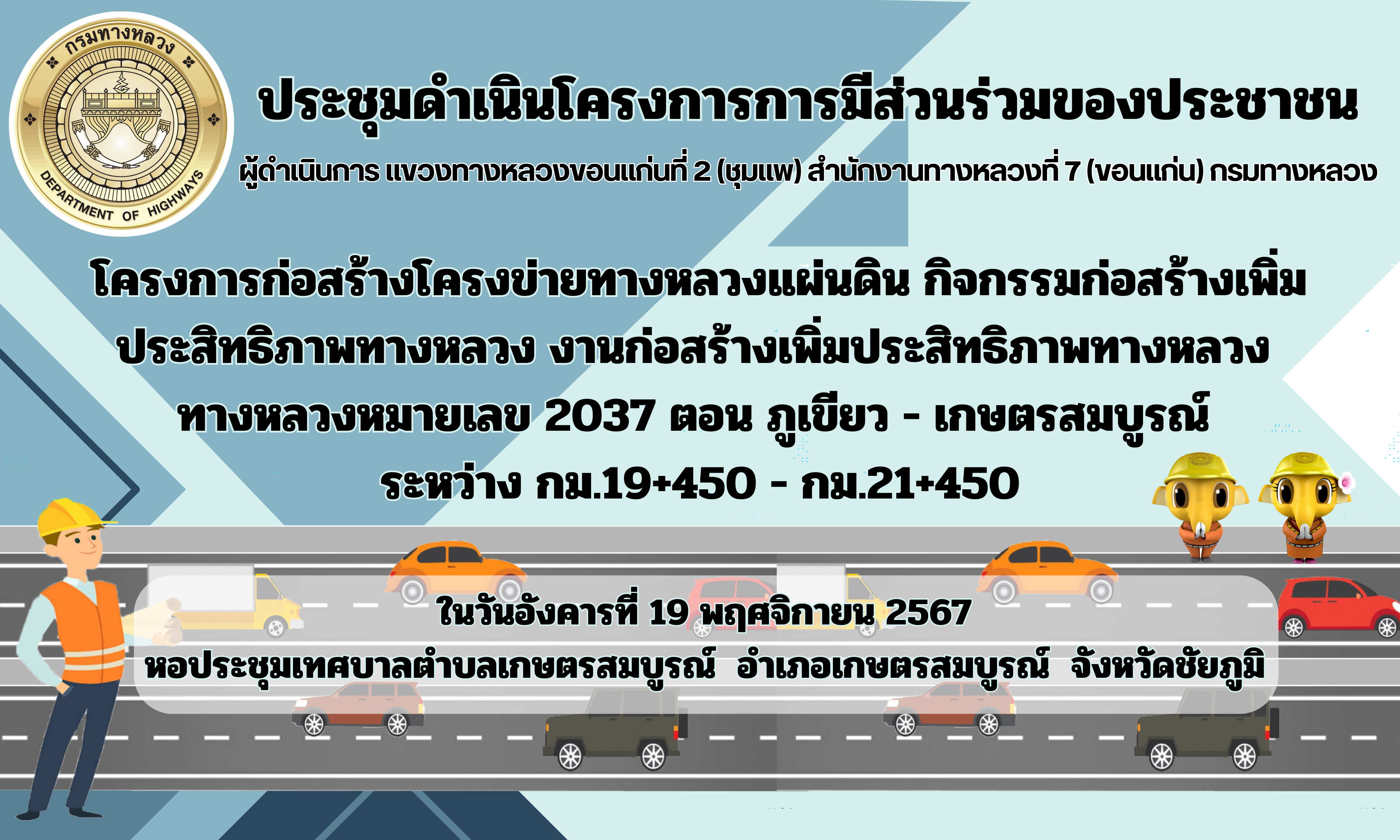 โครงการก่อสร้างโครงข่ายทางหลวงแผ่นดิน กิจกรรมก่อสร้างเพิ่มประสิทธิภาพทางหลวง งานก่อสร้างเพิ่มประสิทธิภาพทางหลวง ทล. 2037 ตอน ภูเขียว - เกษตรสมบูรณ์ ระหว่าง กม.19+450 - กม.21+450 |