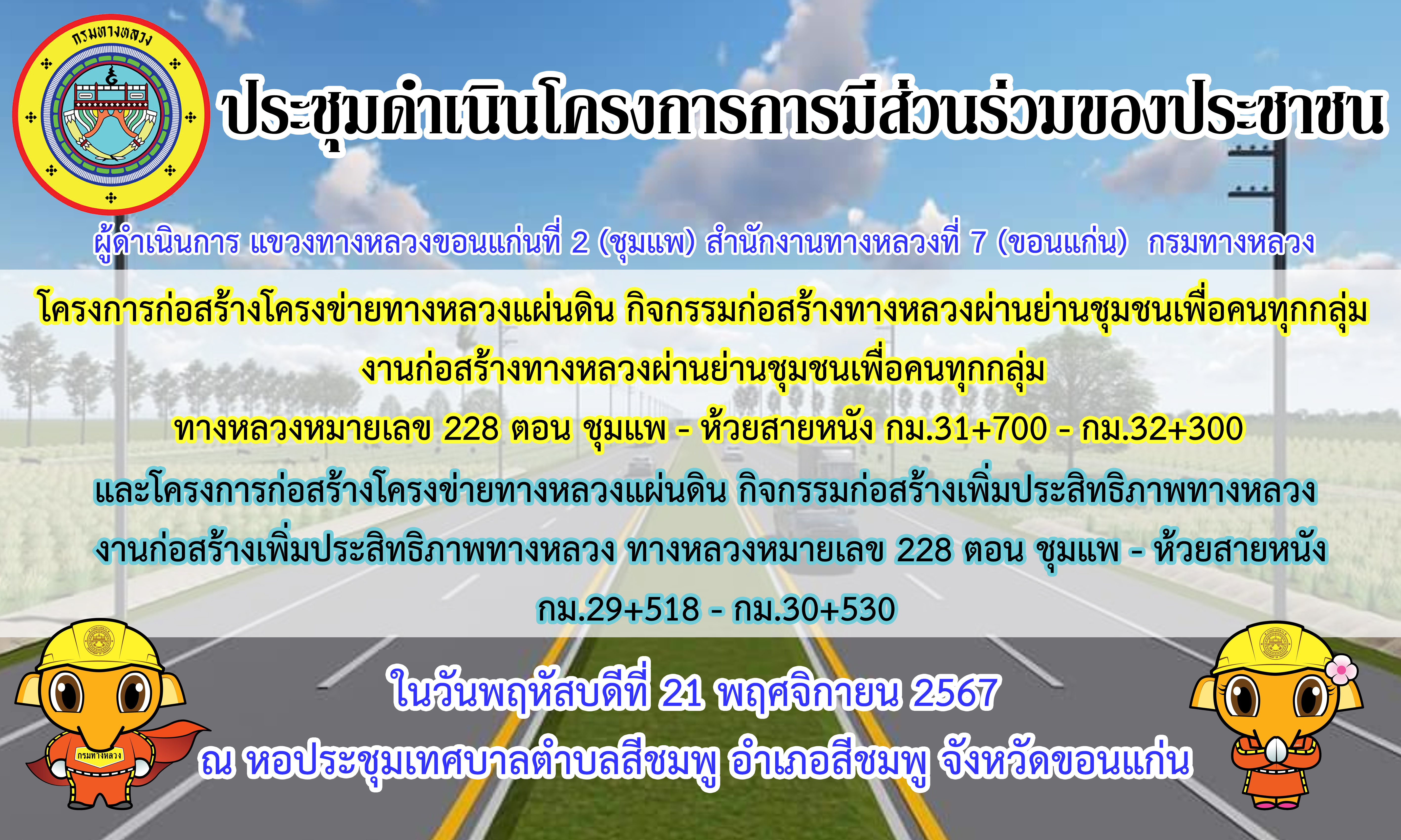โครงการก่อสร้างโครงข่ายทางหลวงแผ่นดิน กิจกรรมก่อสร้างทางหลวงผ่านย่านชุมชนเพื่อคนทุกกลุ่ม งานก่อสร้างทางหลวงผ่านย่านชุมชนเพื่อคนทุกกลุ่ม ทล. 228 ตอน ชุมแพ - ห้วยสายหนัง กม.31+700 - กม.32+300 |