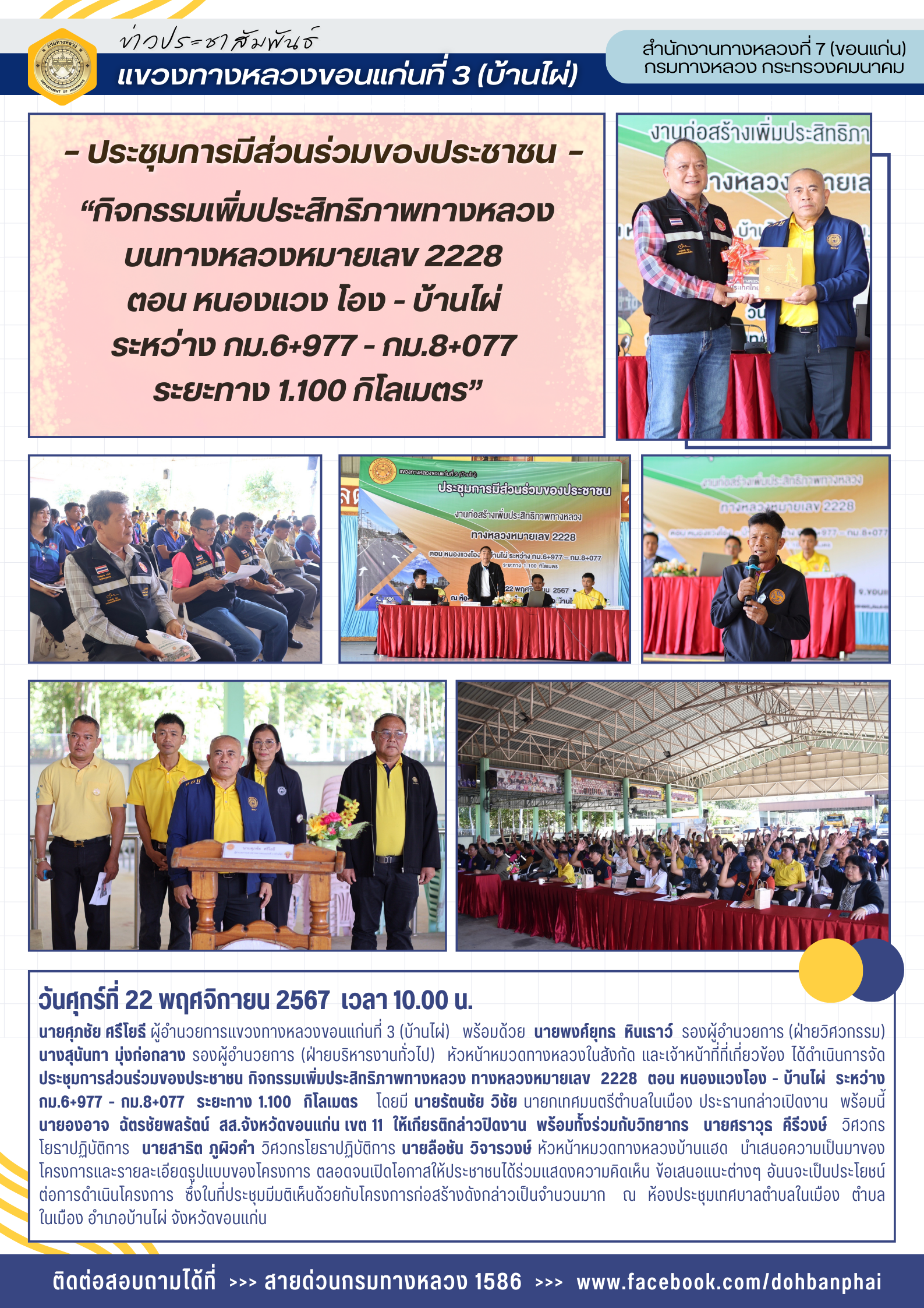 #นายศุภชัย ศรีึโยธี ผู้อำนวยการแขวงทางหลวงขอนแก่นที่ 3 (บ้านไผ่) พร้อมด้วย นายพงศ์ยุทธ หินเธาว์ รองผู้อำนวยการ (ฝ่ายวิศวกรรม) นางสุนันทา มุ่งก่อกลาง รองผู้อำนวยการ (ฝ่ายบริหารงานทั่วไป) หัวหน้าหมวดทางหลวงในสังกัด และเจ้าหน้าที่ที่เกี่ยวข้อง ได้ดำเนินการจัดประชุมการส่วนร่วมของประชาชน กิจกรรมเพิ่มประสิทธิภาพทางหลวง ทางหลวงหมายเลข 2228 ตอน หนองแวงโอง - บ้านไผ่ ระหว่าง กม.6+977 - กม.8+077 ระยะทาง 1.100 กิโลเมตร โดยมี นายรัตนชัย วิชัย นายกเทศมนตรีตำบลในเมือง ประธานกล่าวเปิดงาน พร้อมนี้ นายองอาจ ฉัตรชัยพลรัตน์ สส.จังหวัดขอนแก่น เขต 11 ให้เกียรติกล่าวปิดงาน พร้อมทั้งร่วมกับวิทยากร นายศราวุธ คีรีวงษ์ วิศวกรโยธาปฏิบัติการ นายสาธิต ภูผิวคำ วิศวกรโยธาปฏิบัติการ นายลือชัน วิจารวงษ์ หัวหน้าหมวดทางหลวงบ้านแฮด นำเสนอความเป็นมาของโครงการและรายละเอียดรูปแบบของโครงการ ตลอดจนเปิดโอกาสให้ประชาชนได้ร่วมแสดงความคิดเห็น ข้อเสนอแนะต่างๆ อันนจะเป็นประโยชน์ต่อการดำเนินโครงการ ซึ่งในที่ประชุมมีมติเห็นด้วยกับโครงการก่อสร้างดังกล่าวเป็นจำนวนมาก ณ ห้องประชุมเทศบาลตำบลในเมือง ตำบล ในเมือง อำเภอบ้านไผ่ จังหวัดขอนแก่น