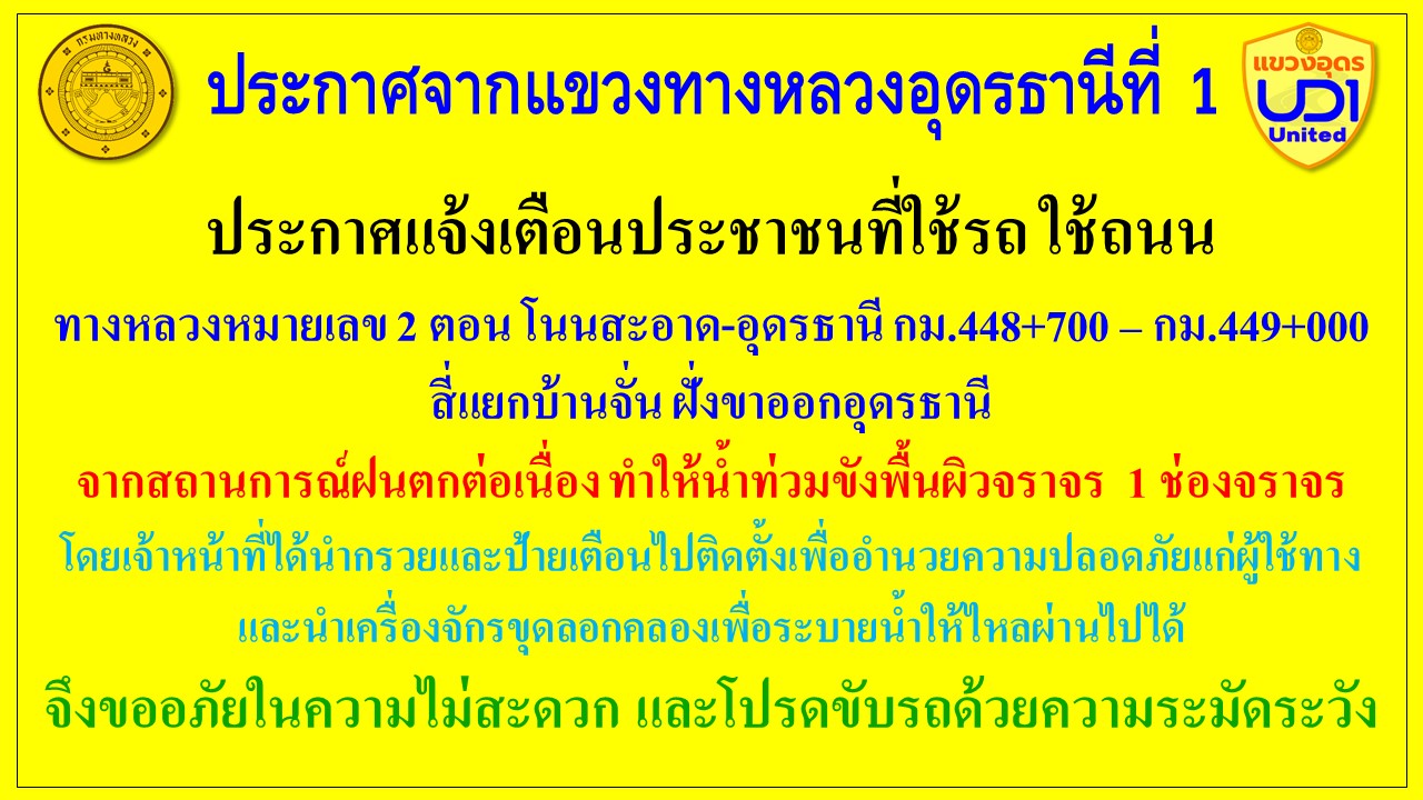 14 02/09/2568 ประกาศแจ้งเตือนประชาชนที่ใช้รถ ใช้ถนน น้ำท่วมขังพื้นผิวจราจร 1 ช่องจราจร ทางหลวงหมายเลข 2 ตอน โนนสะอาด-อุดรธานี กม.448+700 – กม.449+000 สี่แยกบ้านจั่น ฝั่งขาออกอุดรธานี