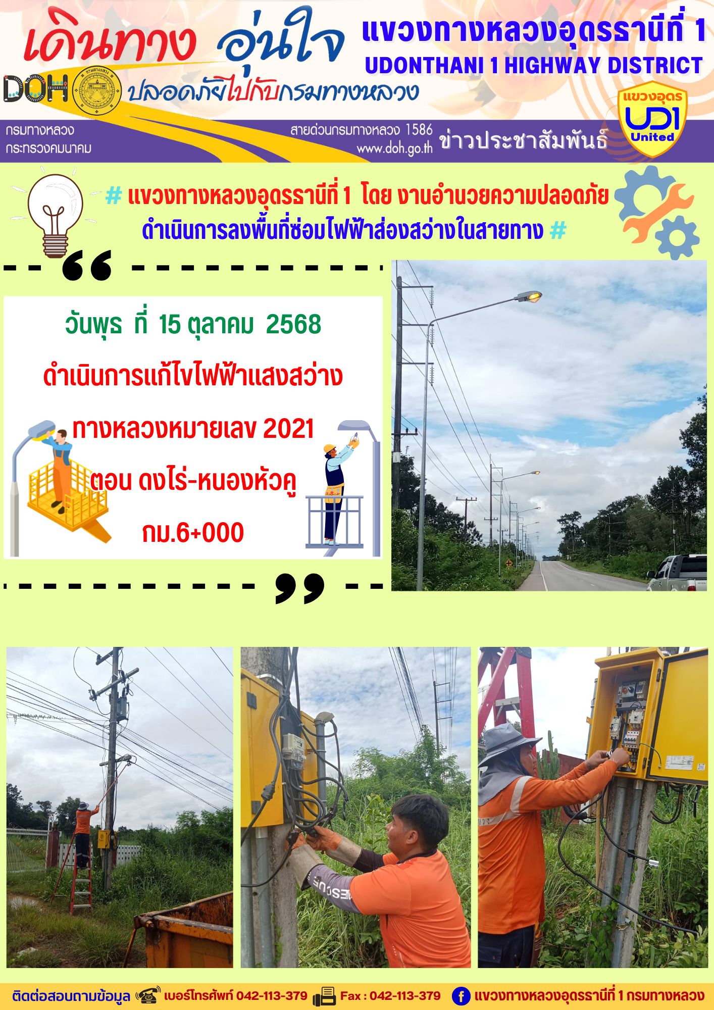 11 15/10/2568 ดำเนินการแก้ไขไฟฟ้าแสงสว่าง ทางหลวงหมายเลข 2021 ตอน ดงไร่-หนองหัวคู กม.6+000