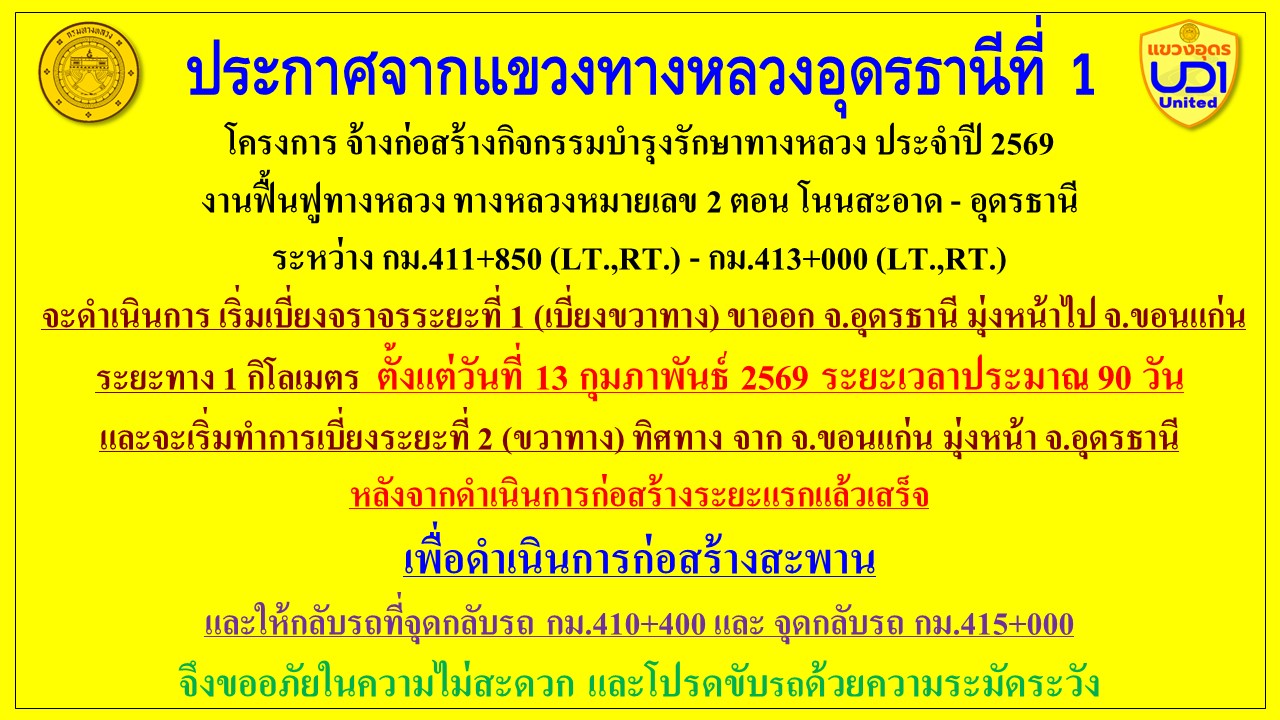 6 12/02/2569 เบี่ยงการจราจร งานฟื้นฟูทางหลวง ทางหลวงหมายเลข 2 ตอน โนนสะอาด - อุดรธานี ระหว่าง กม.411+850 (LT.,RT.) - กม.413+000 (LT.,RT.)