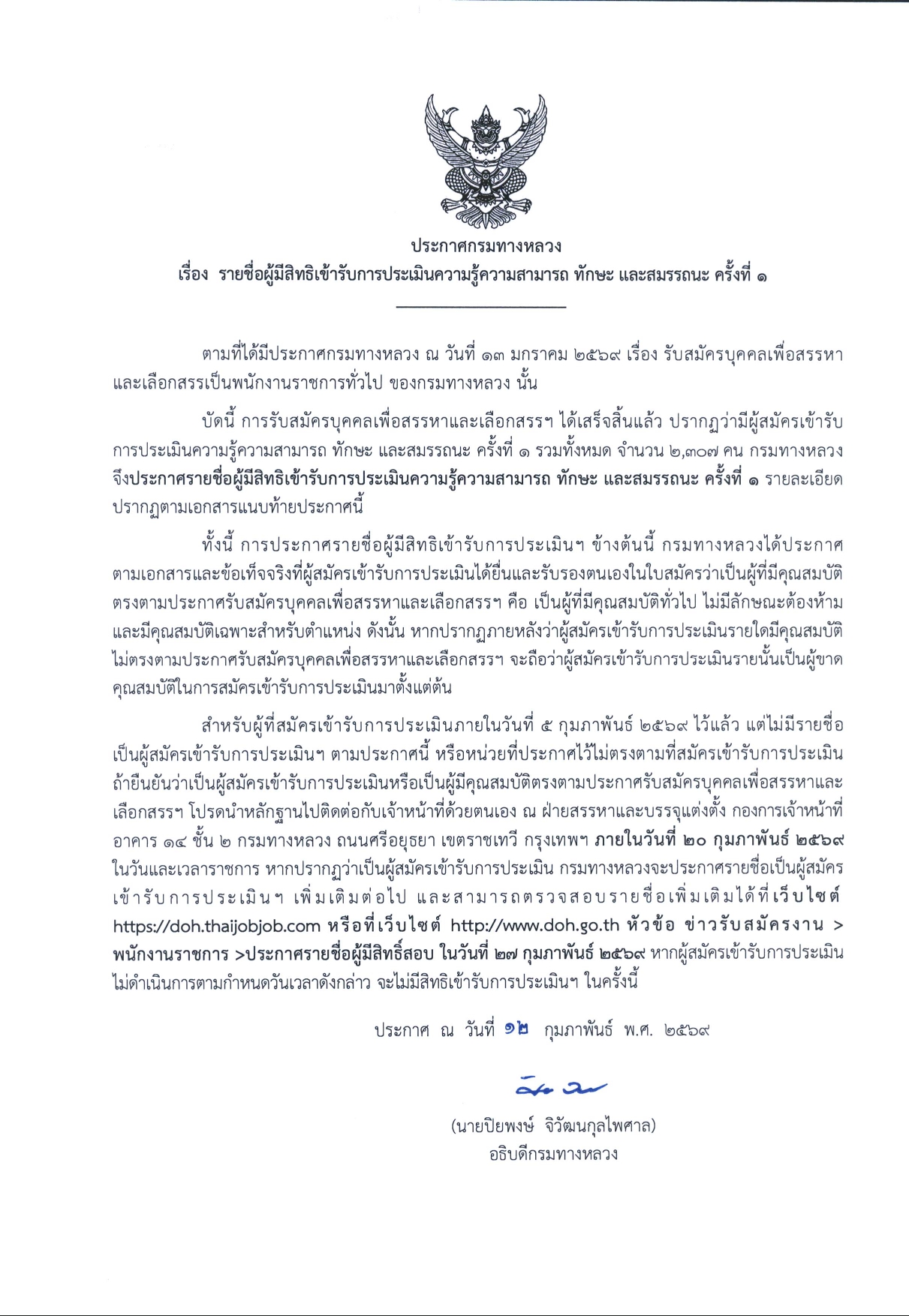 5 13/02/2569 ประกาศกรมทางหลวง เรื่อง รายชื่อผู้มีสิทธิเข้ารับการประเมินความรู้ความสามารถ ทักษะ และสมรรถนะ ครั้งที่ ๑ ตามที่ได้มีประกาศกรมทางหลวง ณ วันที่ ๑๓ มกราคม ๒๕๖๙ เรื่อง รับสมัครบุคคลเพื่อสรรหา และเลือกสรรเป็นพนักงานราชการทั่วไป