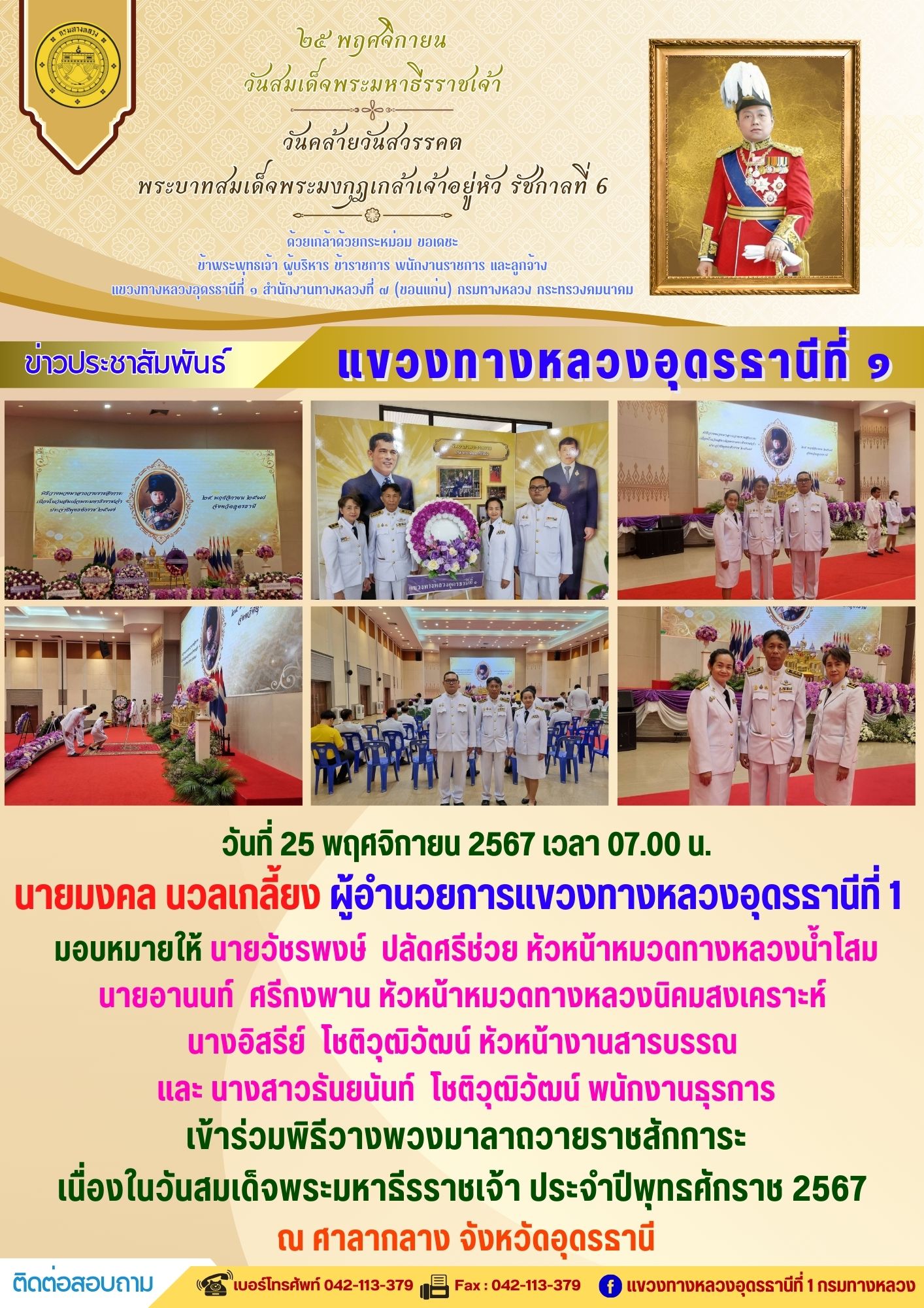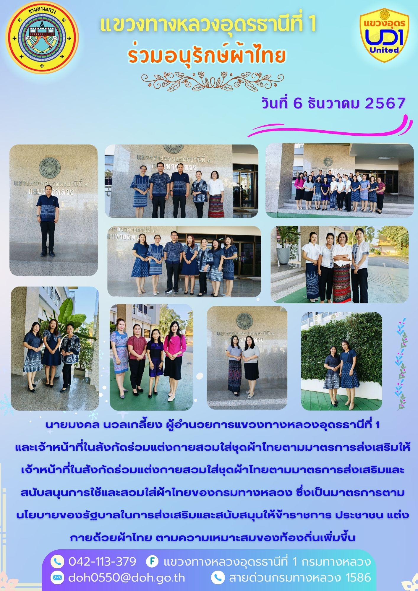 นายมงคล นวลเกลี้ยง ผู้อำนวยการแขวงทางหลวงอุดรธานีที่ 1 และเจ้าหน้าที่ในสังกัดร่วมแต่งกายสวมใส่ชุดผ้าไทยตามมาตรการส่งเสริมให้เจ้าหน้าที่ในสังกัดร่วมแต่งกายสวมใส่ชุดผ้าไทยตามมาตรการส่งเสริมและสนับสนุนการใช้และสวมใส่ผ้าไทยของกรมทางหลวง ซึ่งเป็นมาตรการตามนโยบายของรัฐบาลในการส่งเสริมและสนับสนุนให้ข้าราชการ ประชาชน แต่งกายด้วยผ้าไทย ตามความเหมาะสมของท้องถิ่นเพิ่มขึ้น