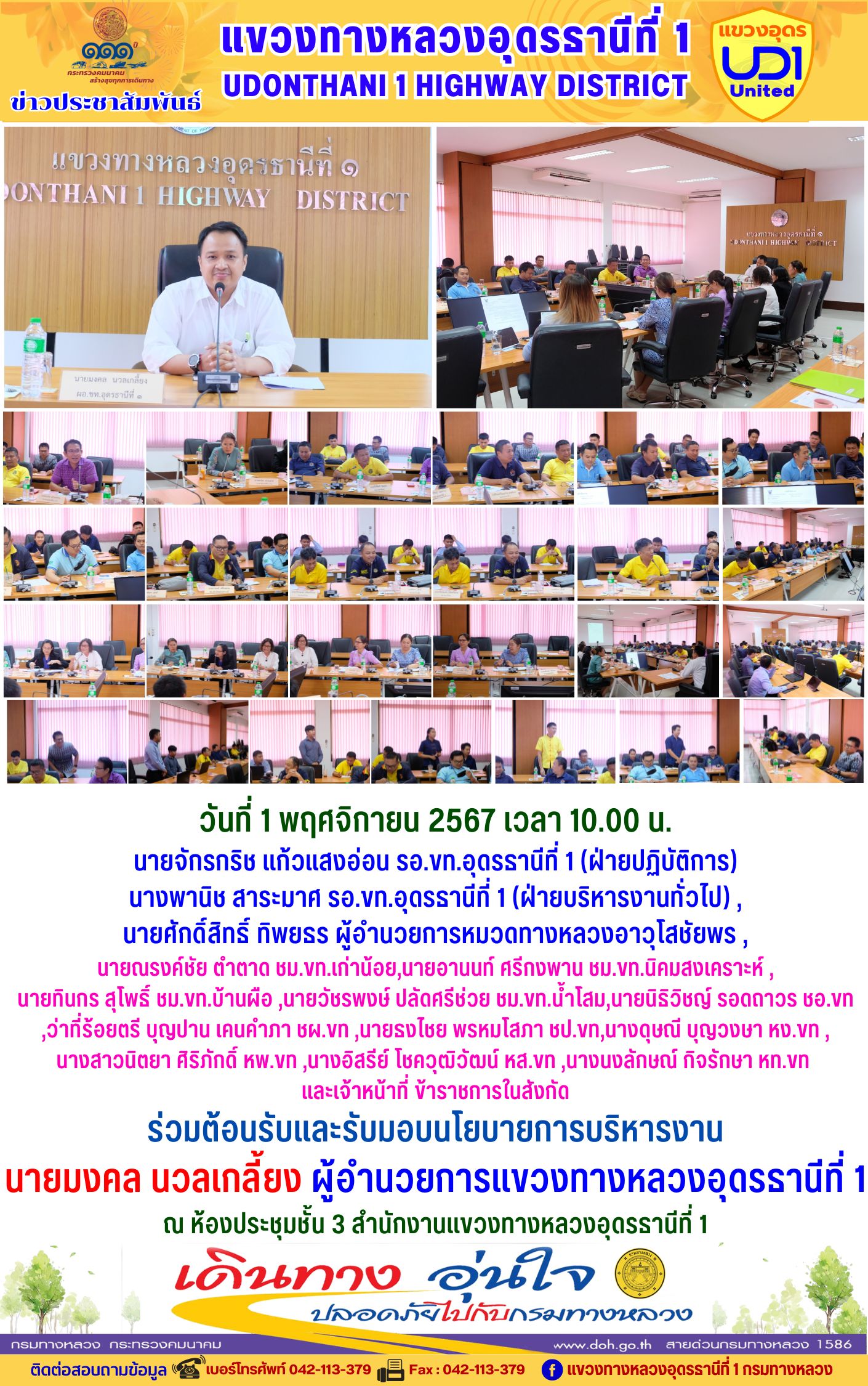 ต้อนรับและรับมอบนโยบายการบริหารงาน นายมงคล นวลเกลี้ยง ผู้อำนวยการแขวงทางหลวงอุดรธานีที่ 1