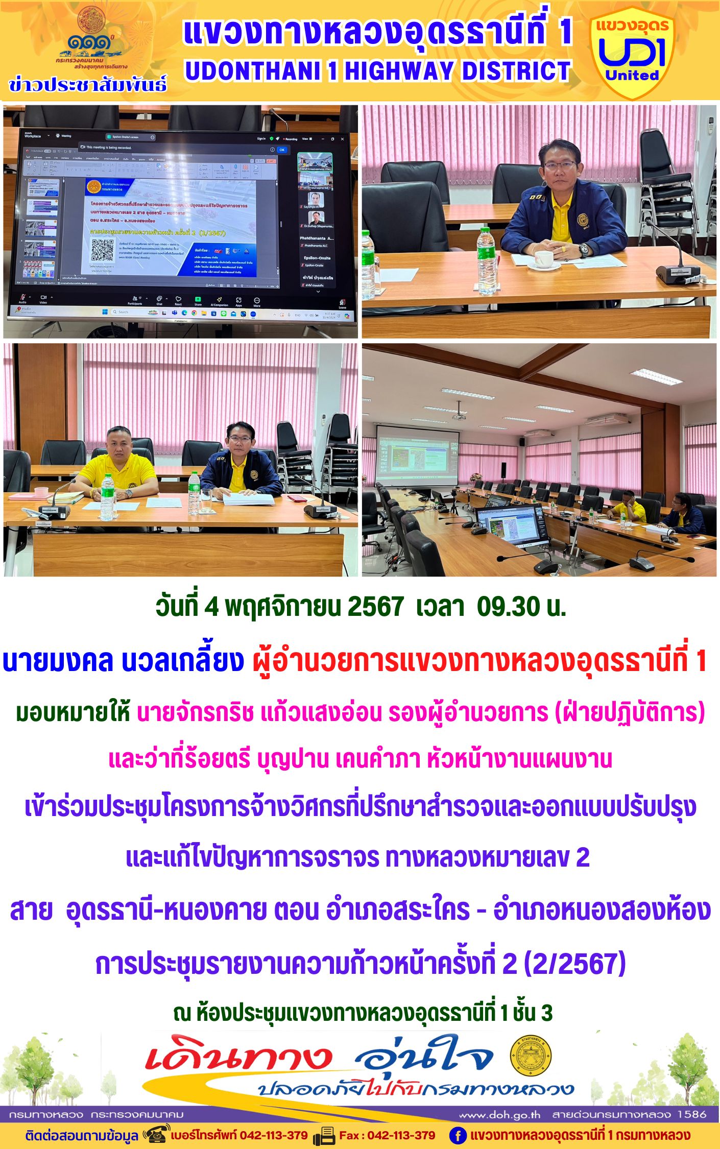 เข้าร่วมประชุมโครงการจ้างวิศกรที่ปรึกษาสำรวจและออกแบบปรับปรุง และแก้ไขปัญหาการจราจร ทางหลวงหมายเลข 2 สาย อุดรธานี-หนองคาย ตอน อำเภอสระใคร - อำเภอหนองสองห้อง การประชุมรายงานความก้าวหน้าครั้งที่ 2 (2/2567)