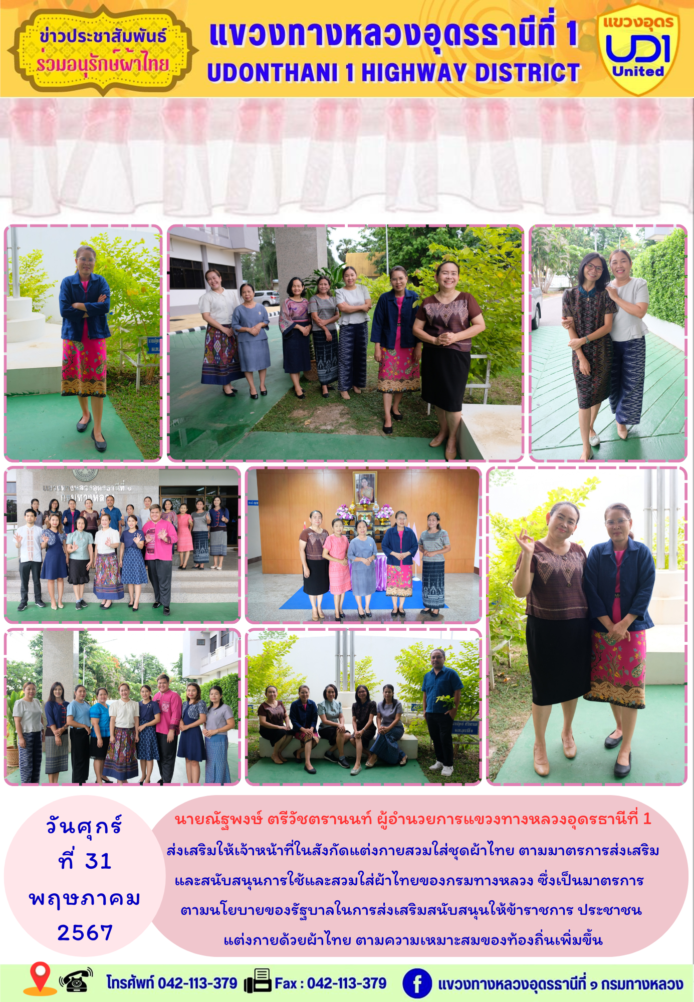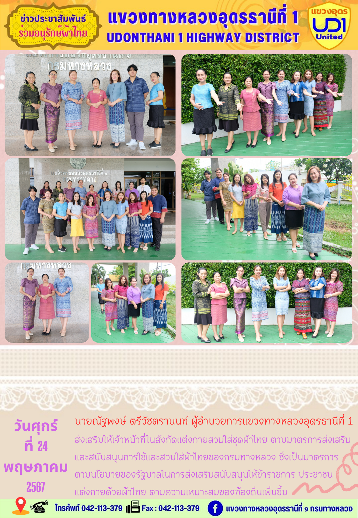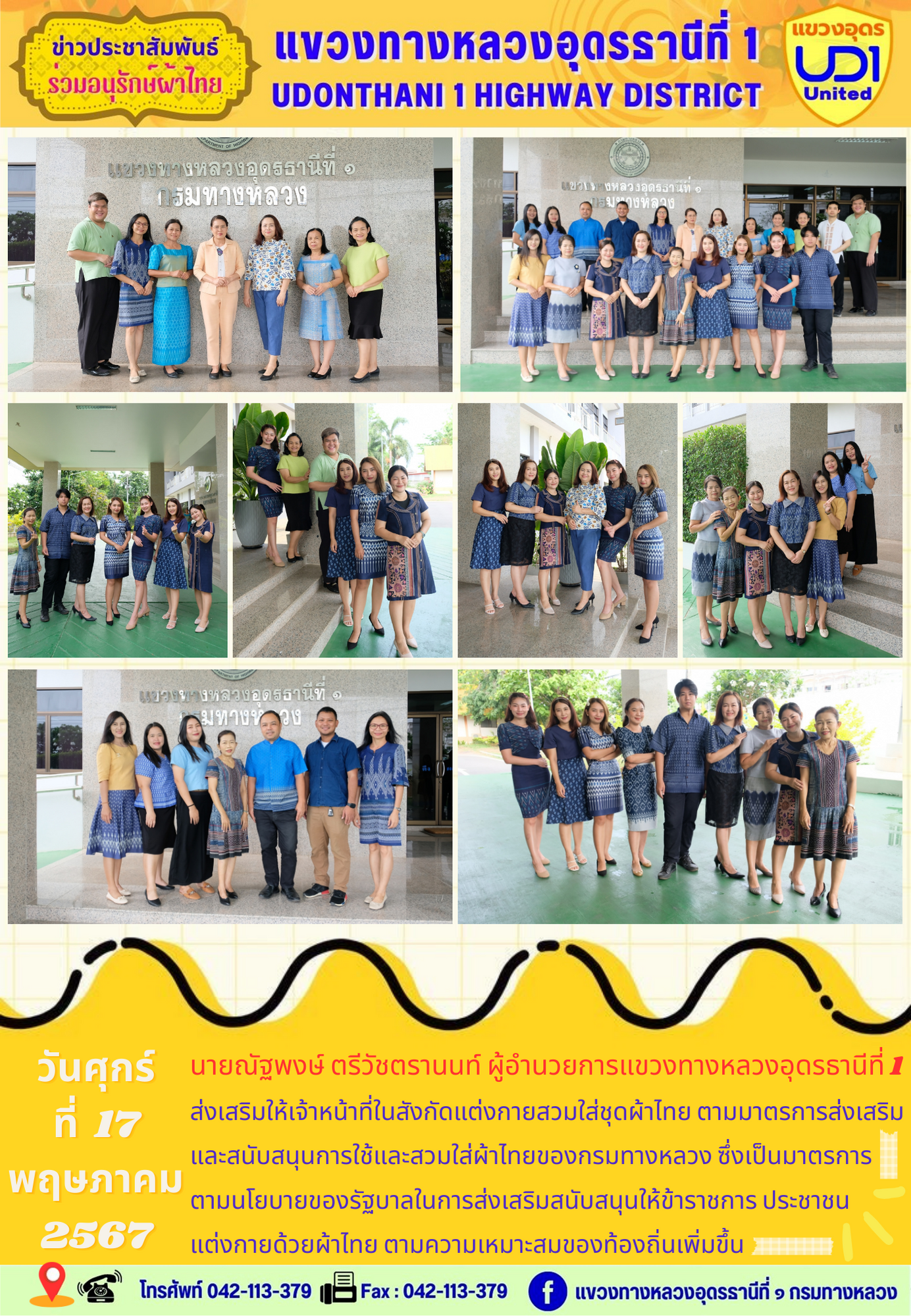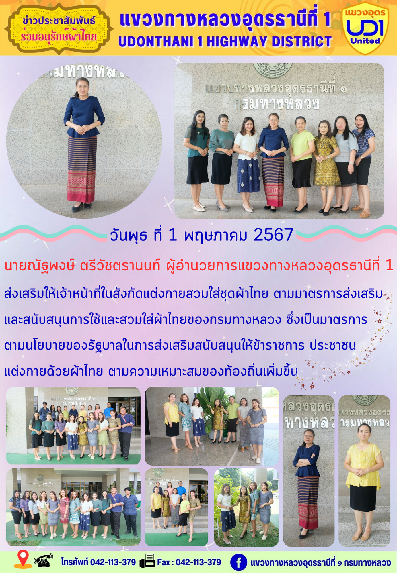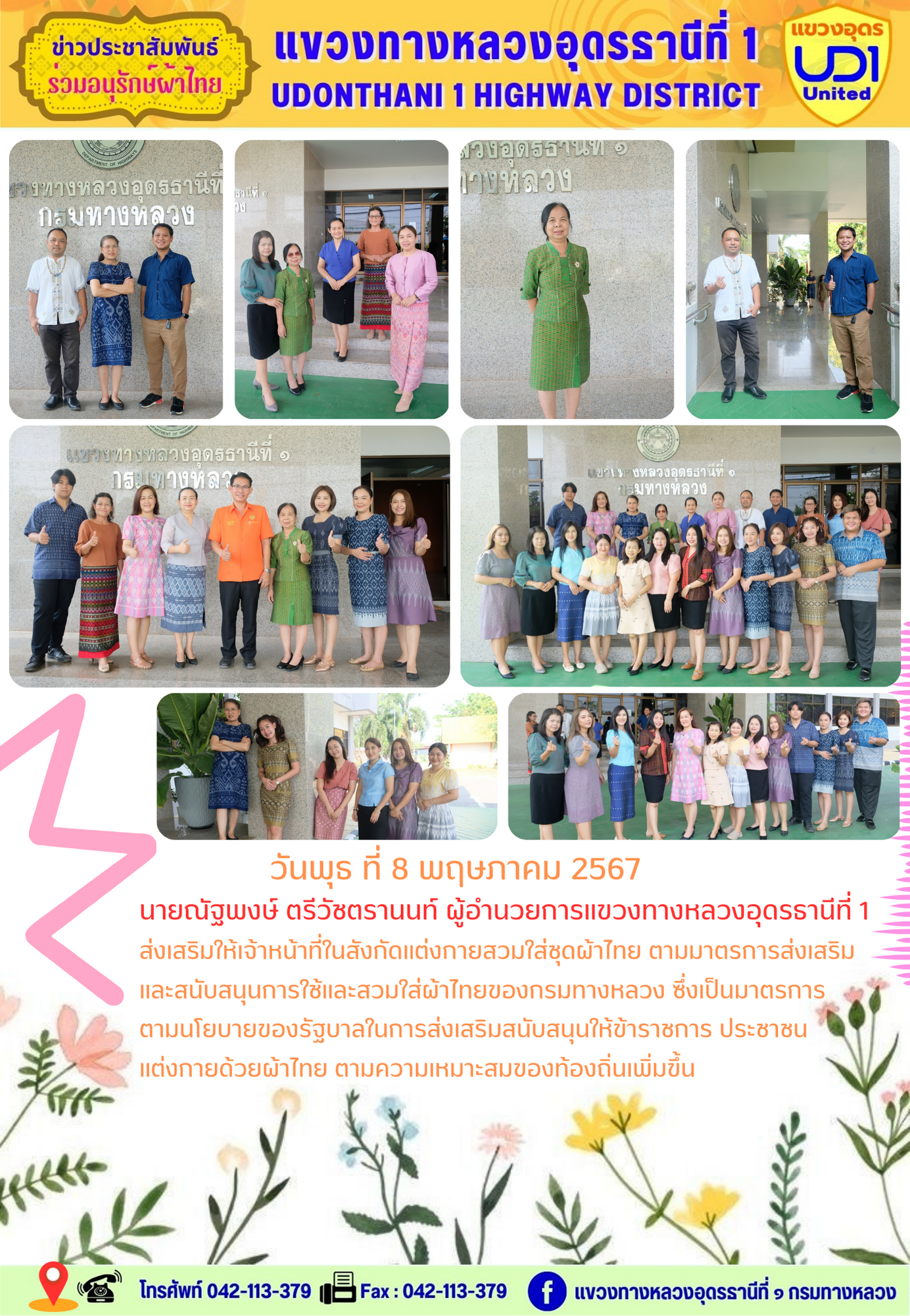 นายณัฐพงษ์ ตรีวัชตรานนท์ ผู้อำนวยการแขวงทางหลวงอุดรธานีที่ 1 พร้อมด้วย นายศุภชัย ศรีโยธี รองผู้อำนวยการ (ฝ่ายวิศวกรรม) นางพานิช สาระมาศ รองผู้อำนวยการ (ฝ่ายบริหารงานทั่วไป) นายจักรกริช แก้วแสงอ่อน รองผู้อำนวยการ (ฝ่ายปฏิบัติการ) และเจ้าหน้าที่ในสังกัดร่วมแต่งกายสวมใส่ชุดผ้าไทยตามมาตรการส่งเสริม และสนับสนุนการใช้และสวมใส่ผ้าไทยของกรมทางหลวง ซึ่งเป็นมาตรการตามนโยบายของรัฐบาลในการส่งเสริมและสนับสนุนให้ข้าราชการ ประชาชน แต่งกายด้วยผ้าไทย ตามความเหมาะสมของท้องถิ่นเพิ่มขึ้น