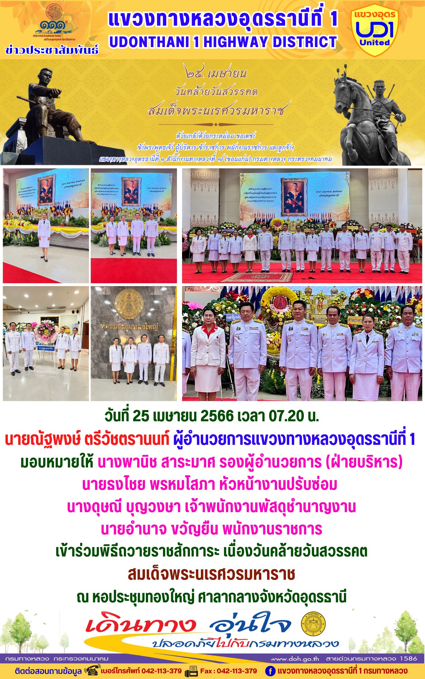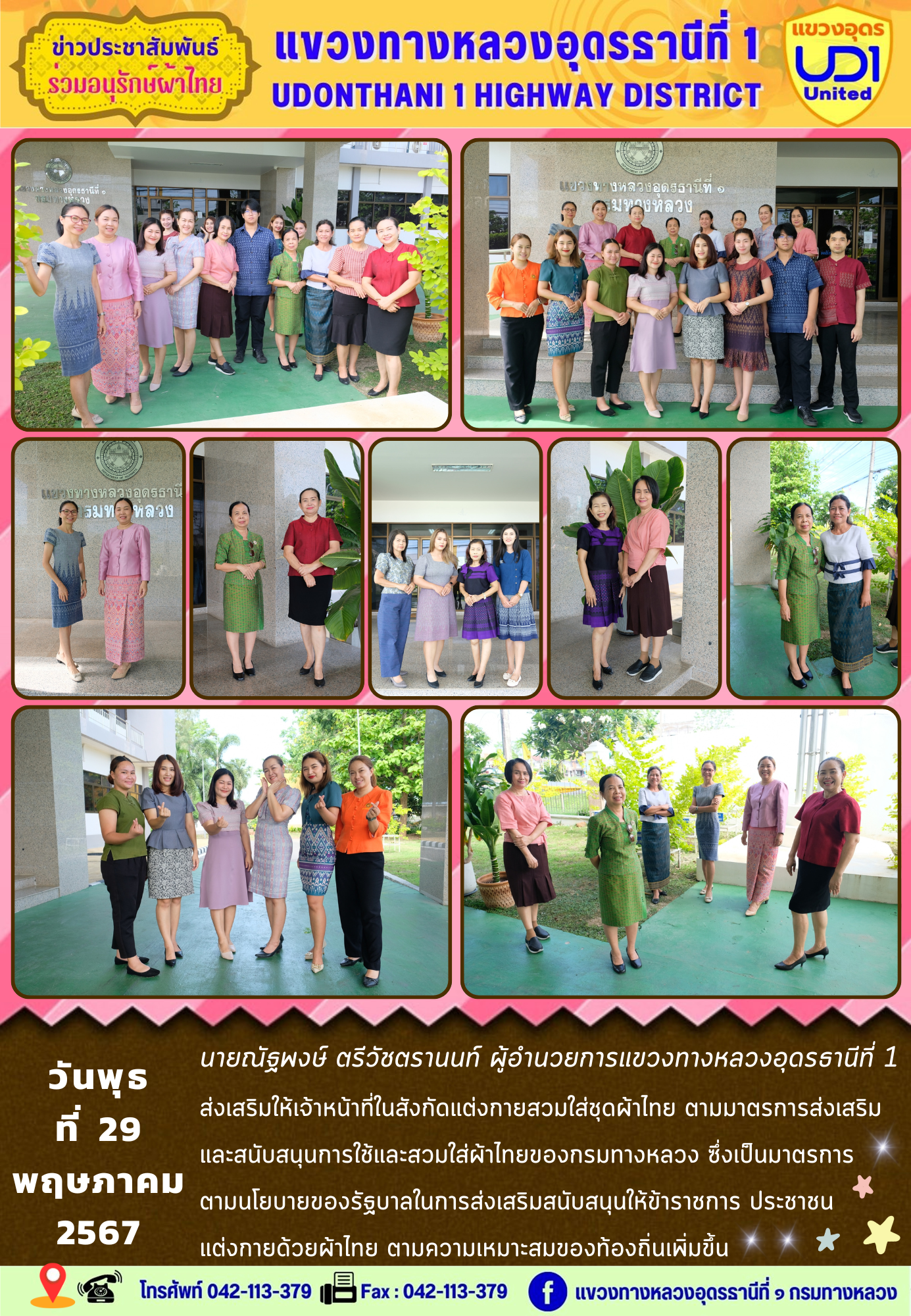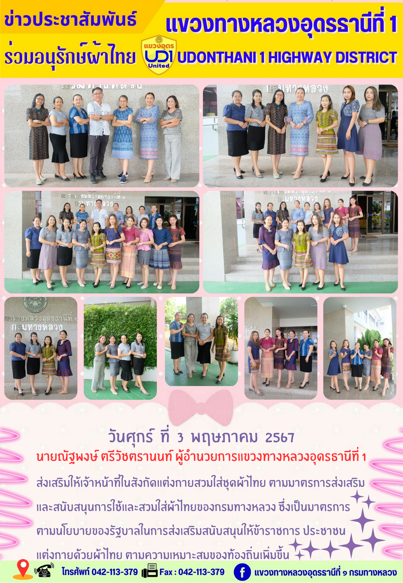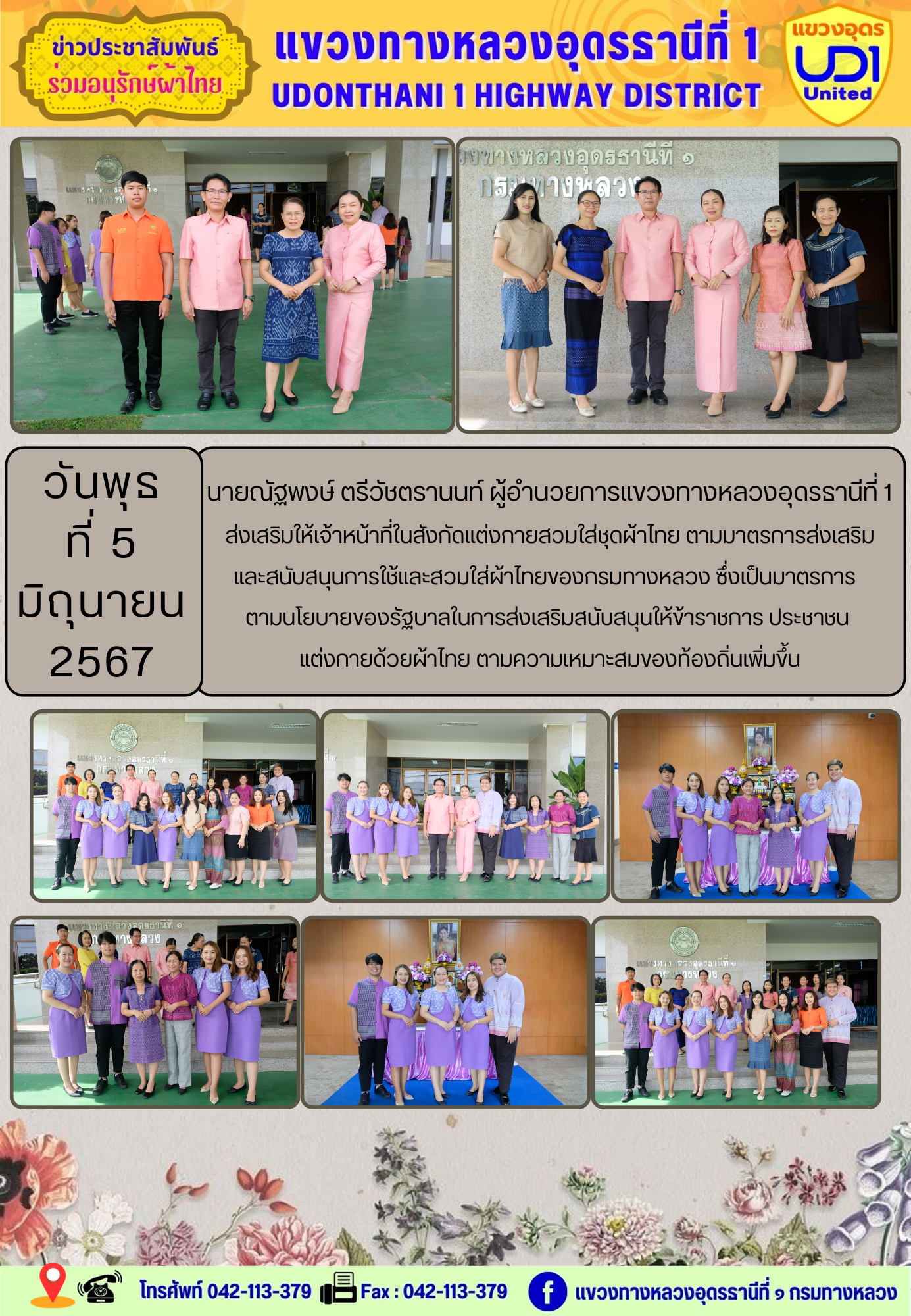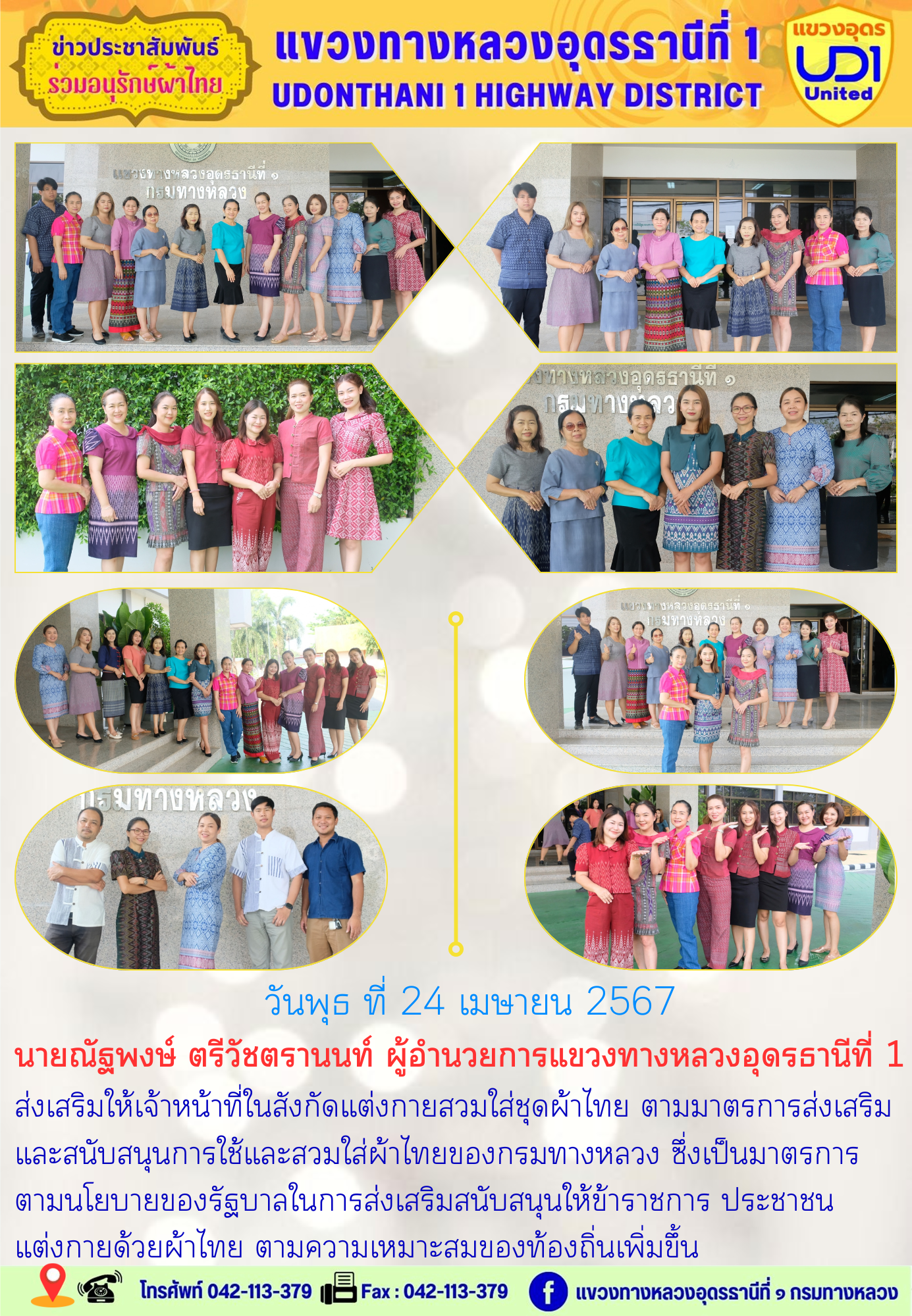 นายณัฐพงษ์ ตรีวัชตรานนท์ ผู้อำนวยการแขวงทางหลวงอุดรธานีที่ 1 พร้อมด้วย นายศุภชัย ศรีโยธี รองผู้อำนวยการ (ฝ่ายวิศวกรรม) นางพานิช สาระมาศ รองผู้อำนวยการ (ฝ่ายบริหารงานทั่วไป) นายจักรกริช แก้วแสงอ่อน รองผู้อำนวยการ (ฝ่ายปฏิบัติการ) และเจ้าหน้าที่ในสังกัดร่วมแต่งกายสวมใส่ชุดผ้าไทยตามมาตรการส่งเสริม และสนับสนุนการใช้และสวมใส่ผ้าไทยของกรมทางหลวง ซึ่งเป็นมาตรการตามนโยบายของรัฐบาลในการส่งเสริมและสนับสนุนให้ข้าราชการ ประชาชน แต่งกายด้วยผ้าไทย ตามความเหมาะสมของท้องถิ่นเพิ่มขึ้น