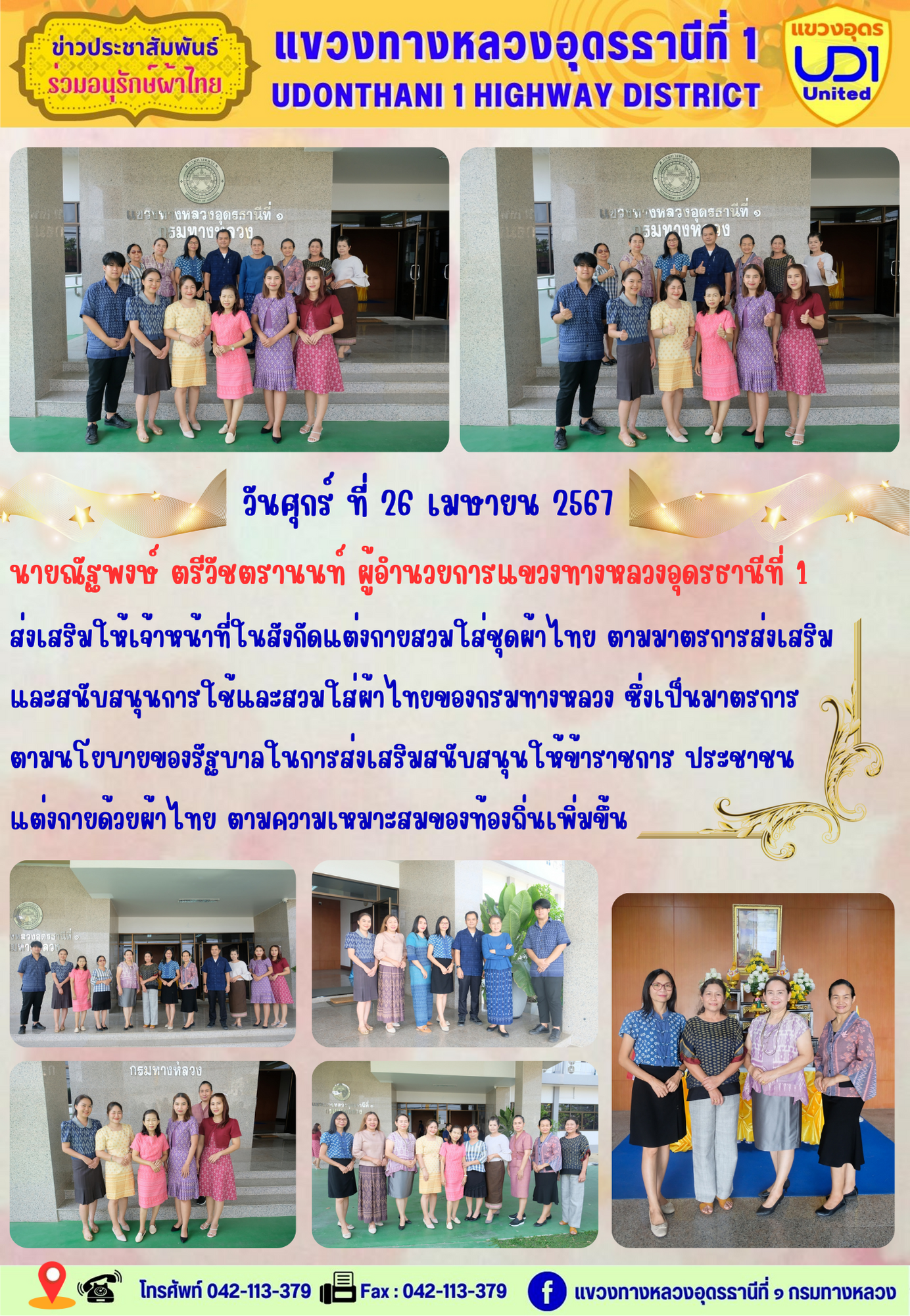 นายณัฐพงษ์ ตรีวัชตรานนท์ ผู้อำนวยการแขวงทางหลวงอุดรธานีที่ 1 ส่งเสริมให้เจ้าหน้าที่ในสังกัดแต่งกายสวมใส่ชุดผ้าไทย ตามมาตรการส่งเสริม และสนับสนุนการใช้และสวมใส่ผ้าไทยของกรมทางหลวง ซึ่งเป็นมาตรการ ตามนโยบายของรัฐบาลในการส่งเสริมสนับสนุนให้ข้าราชการ ประชาชน แต่งกายด้วยผ้าไทย ตามความเหมาะสมของท้องถิ่นเพิ่มขึ้น