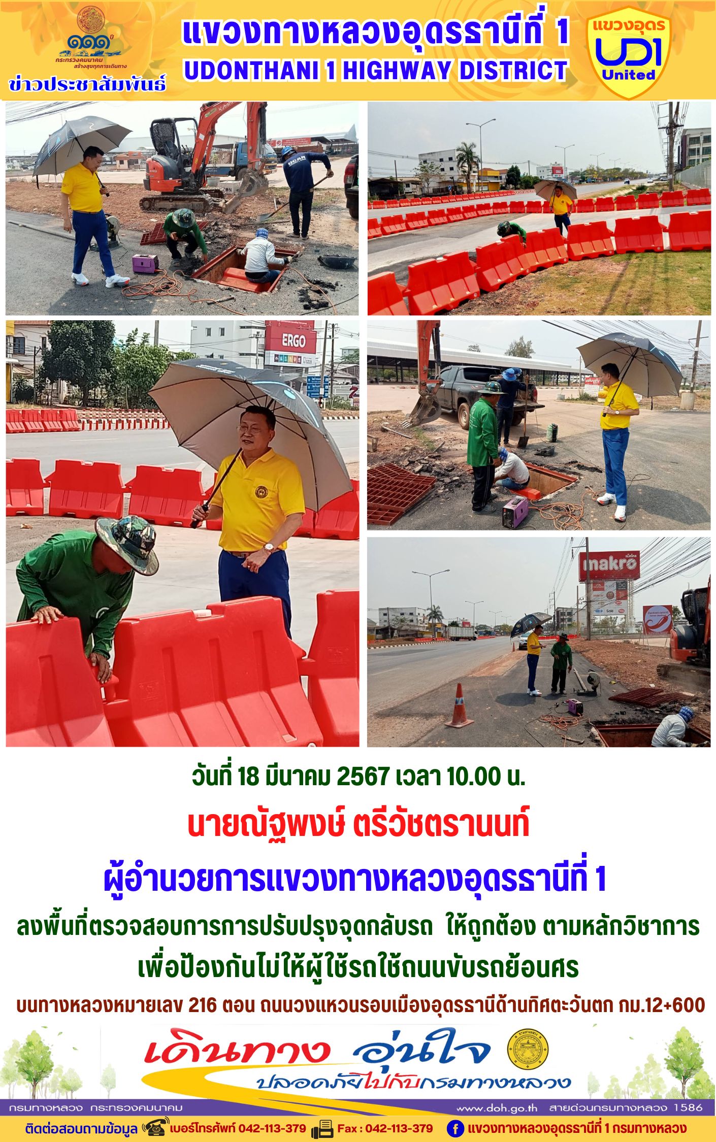นายณัฐพงษ์ ตรีวัชตรานนท์ ผู้อำนวยการแขวงทางหลวงอุดรธานีที่ 1 ลงพื้นที่ตรวจสอบการการปรับปรุงจุดกลับรถ ให้ถูกต้อง ตามหลักวิชาการ เพื่อป้องกันไม่ให้ผู้?ใช้รถใช้ถนนขับรถย้อนศร