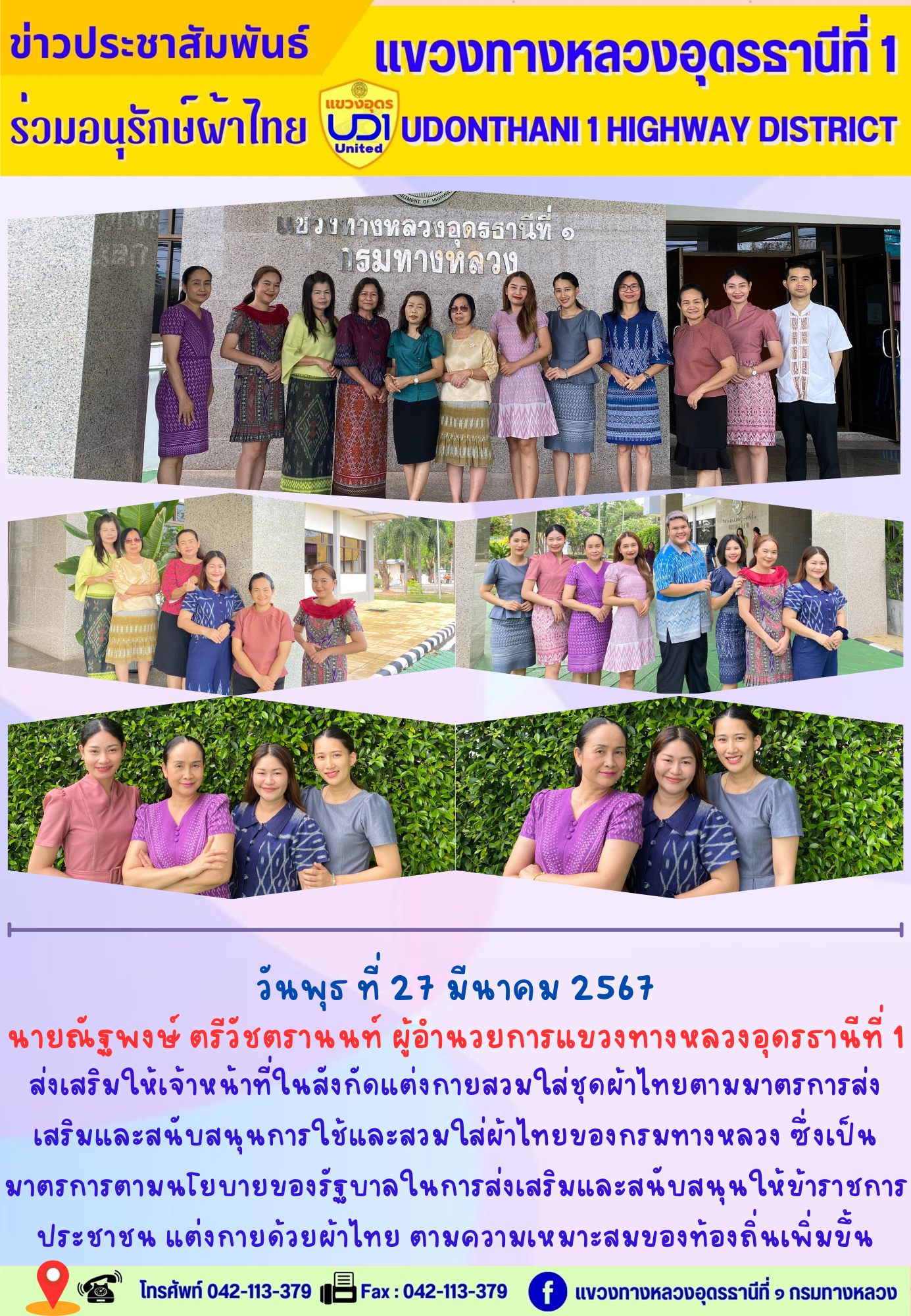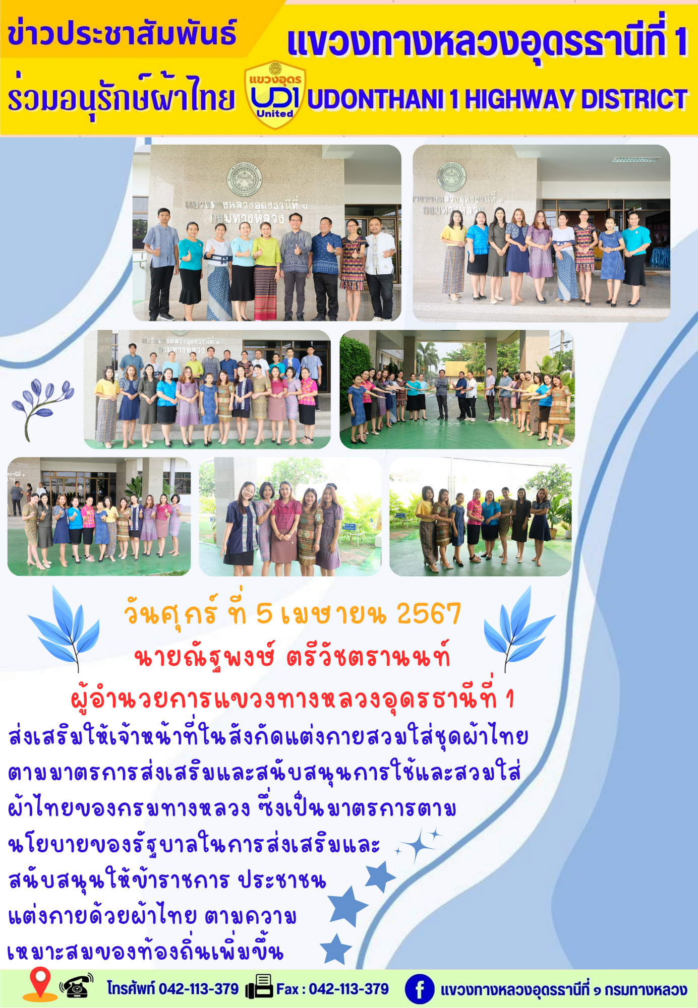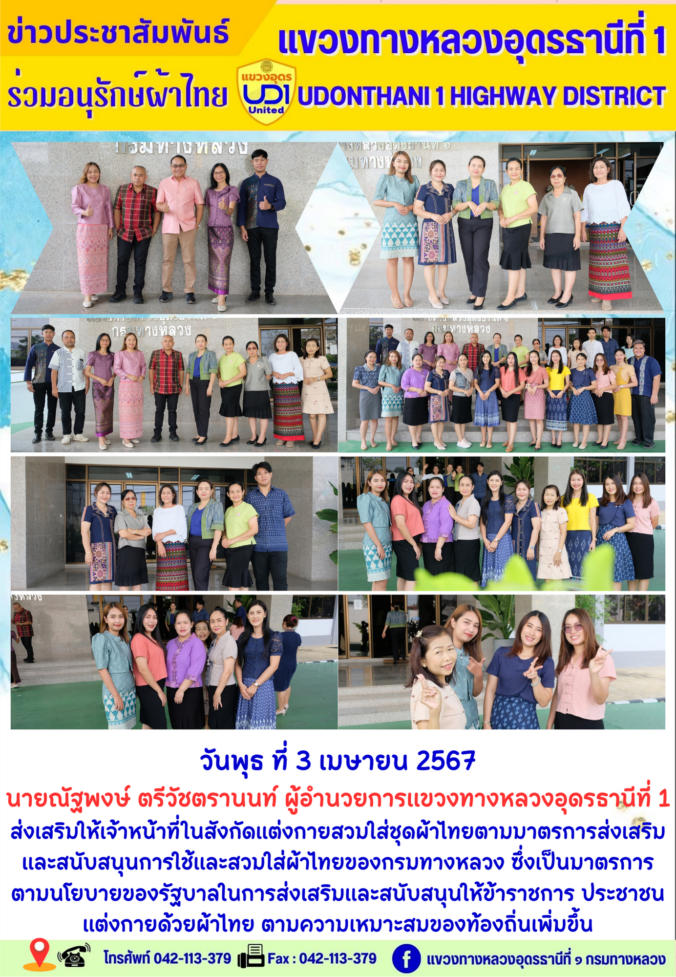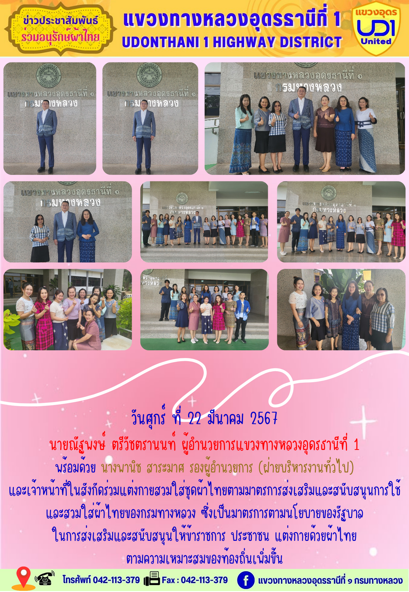 นายณัฐพงษ์ ตรีวัชตรานนท์ ผู้อำนวยการแขวงทางหลวงอุดรธานีที่ 1 ส่งเสริมให้เจ้าหน้าที่ในสังกัดแต่งกายสวมใส่ชุดผ้าไทยตามมาตรการส่งเสริม และสนับสนุนการใช้และสวมใส่ผ้าไทยของกรมทางหลวง ซึ่งเป็นมาตรการ ตามนโยบายของรัฐบาลในการส่งเสริมและสนับสนุนให้ข้าราชการ ประชาชน แต่งกายด้วยผ้าไทย ตามความเหมาะสมของท้องถิ่นเพิ่มขึ้น