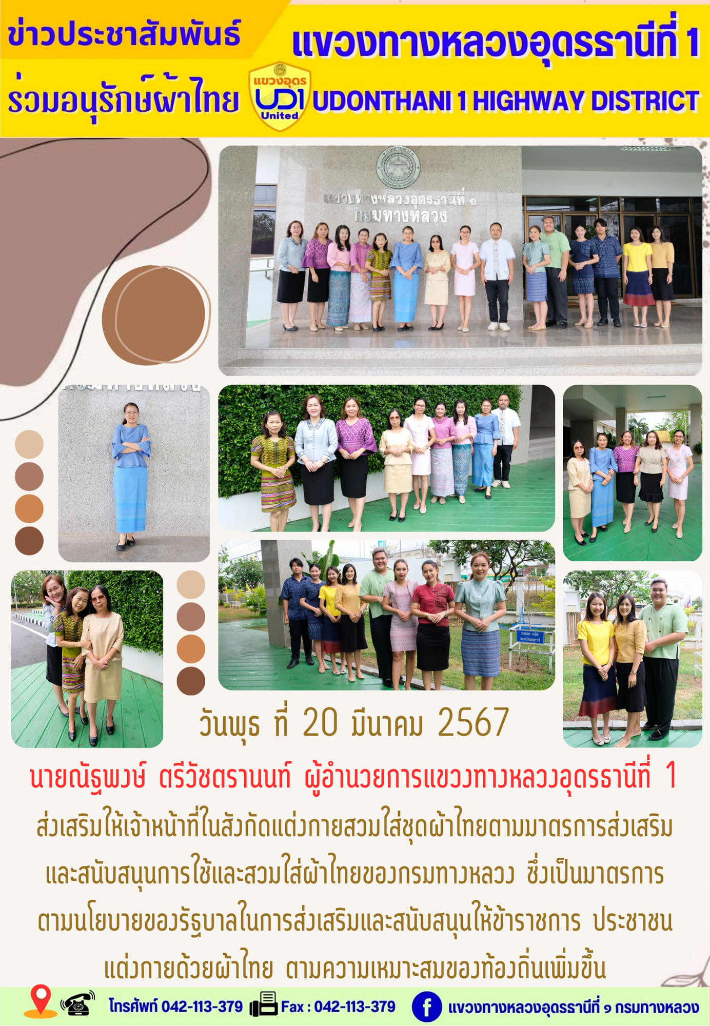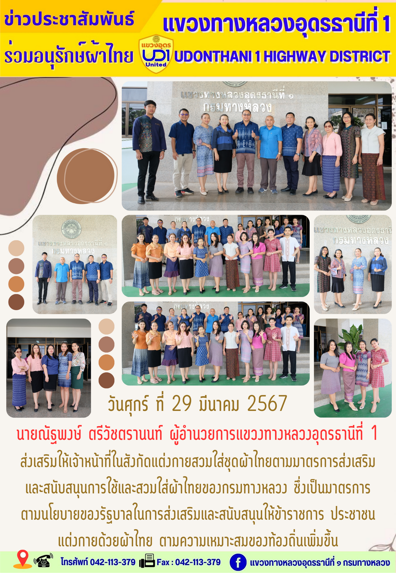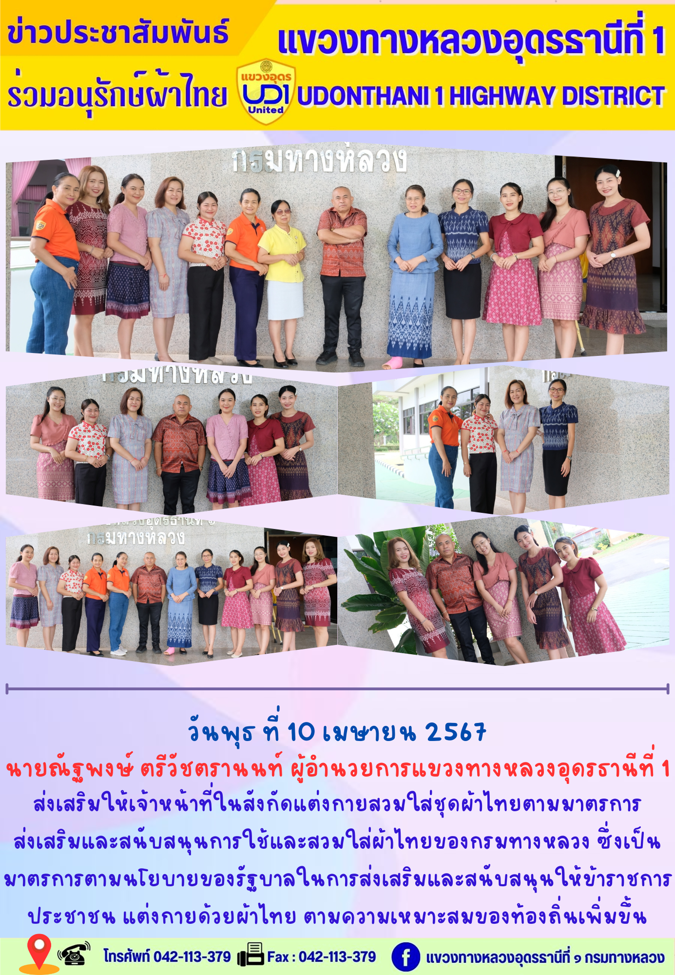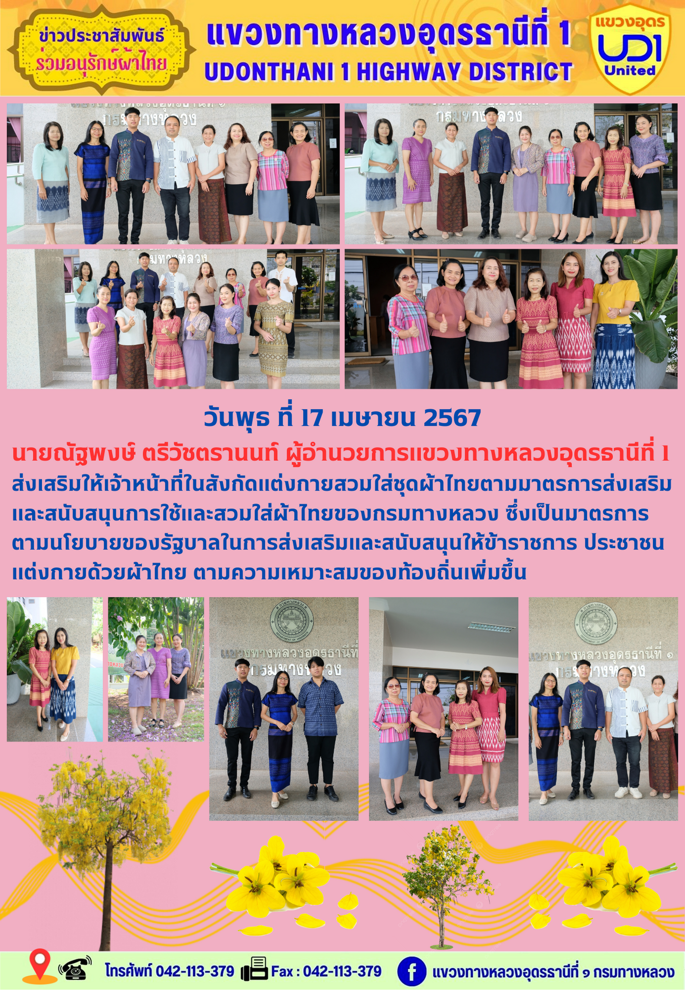นายณัฐพงษ์ ตรีวัชตรานนท์ ผู้อำนวยการแขวงทางหลวงอุดรธานีที่ 1 ส่งเสริมให้เจ้าหน้าที่ในสังกัดแต่งกายสวมใส่ชุดผ้าไทยตามมาตรการส่งเสริม และสนับสนุนการใช้และสวมใส่ผ้าไทยของกรมทางหลวง ซึ่งเป็นมาตรการ ตามนโยบายของรัฐบาลในการส่งเสริมและสนับสนุนให้ข้าราชการ ประชาชน แต่งกายด้วยผ้าไทย ตามความเหมาะสมของท้องถิ่นเพิ่มขึ้น