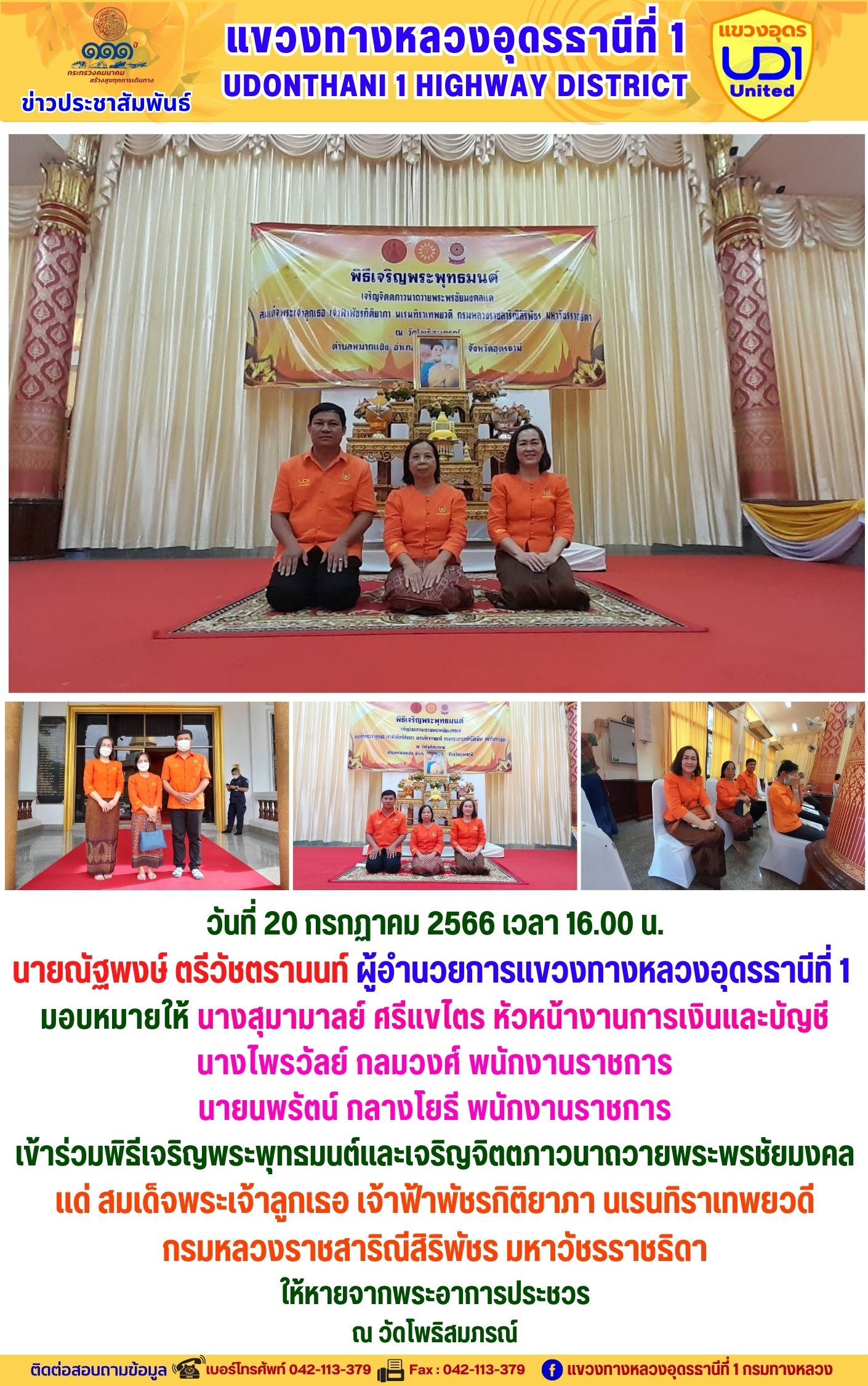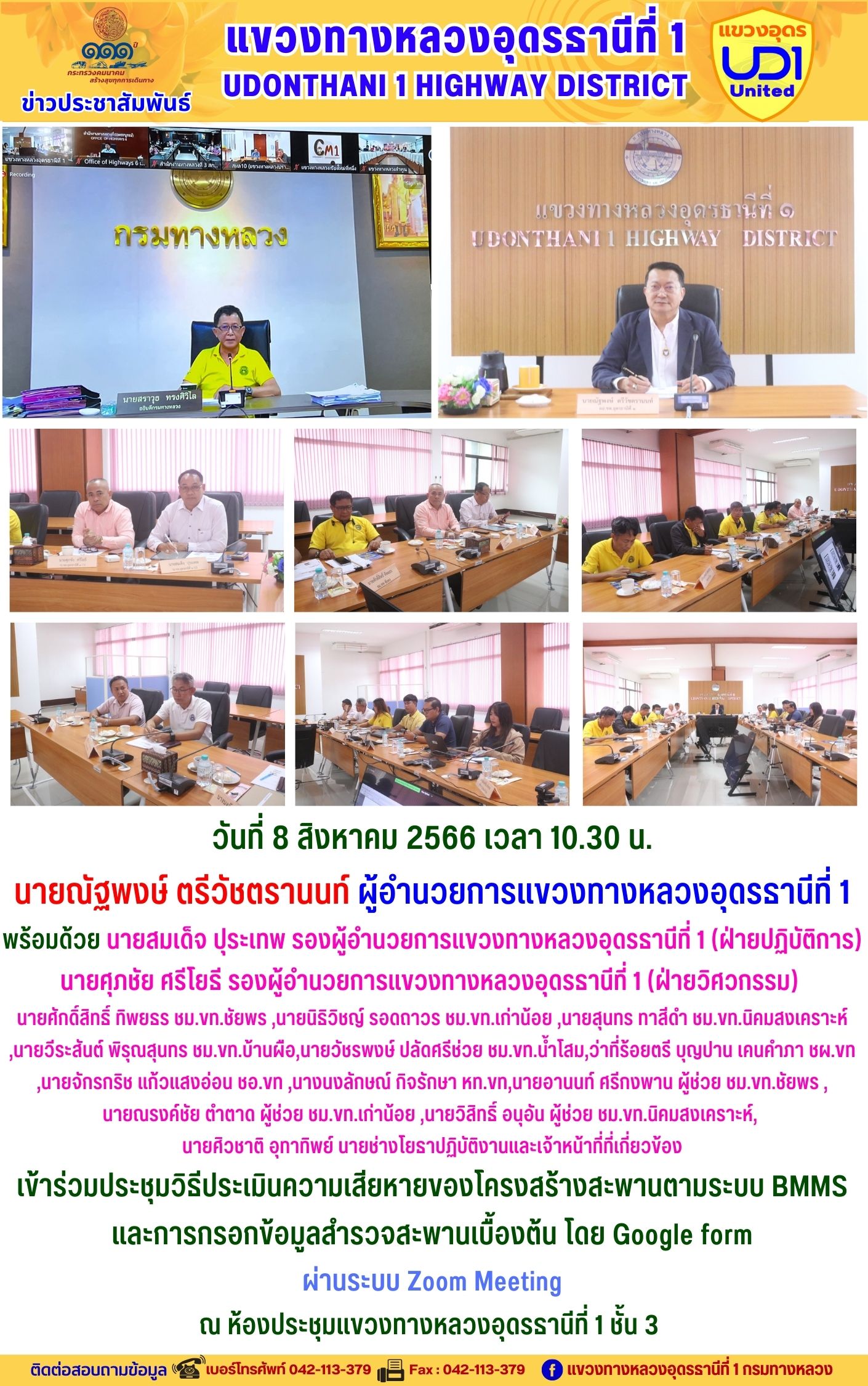 นายณัฐพงษ์ ตรีวัชตรานนท์ ผู้อำนวยการแขวงทางหลวงอุดรธานีที่ 1 มอบหมายให้ นายศุภชัย ศรีโยธี รอ.ขท.อุดรธานีที่ 1 (ว) เข้าร่วมประชุมคณะอนุกรรมการเร่งรัดติดตามและประเมินผลแผนงานโครงการตามแผนปฏิบัติราชการจังหวัดอุดรธานี และแผนปฏิบัติราชการกลุ่มจังหวัดภาคตะวันออกเฉียงเหนือตอนบน 1 ประจำปีงบประมาณ พ.ศ.2566 ครั้งที่ 3/2566