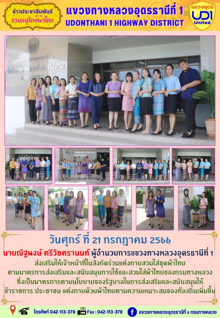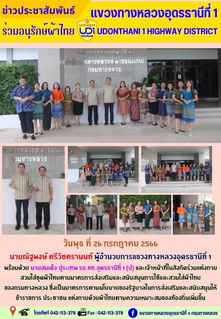นายณัฐพงษ์ ตรีวัชตรานนท์ ผู้อำนวยการแขวงทางหลวงอุดรธานีที่ 1 พร้อมด้วย นายสมเด็จ ปุระเทพ รอ.ขท.อุดรธานีที่ 1 (ป) และเจ้าหน้าที่ในสังกัดร่วมแต่งกายสวมใส่ชุดผ้าไทยตามมาตรการส่งเสริมและสนับสนุนการใช้และสวมใส่ผ้าไทย ของกรมทางหลวง ซึ่งเป็นมาตรการตามนโยบายของรัฐบาลในการส่งเสริมและสนับสนุนให้ข้าราชการ ประชาชน แต่งกายด้วยผ้าไทยตามความเหมาะสมของท้องถิ่นเพิ่มขึ้น