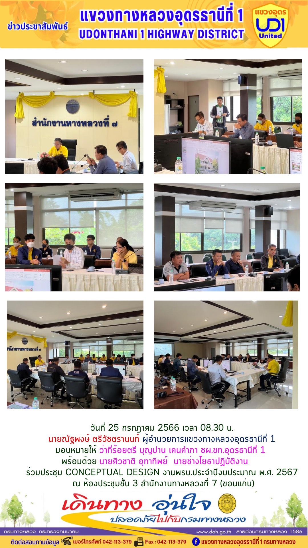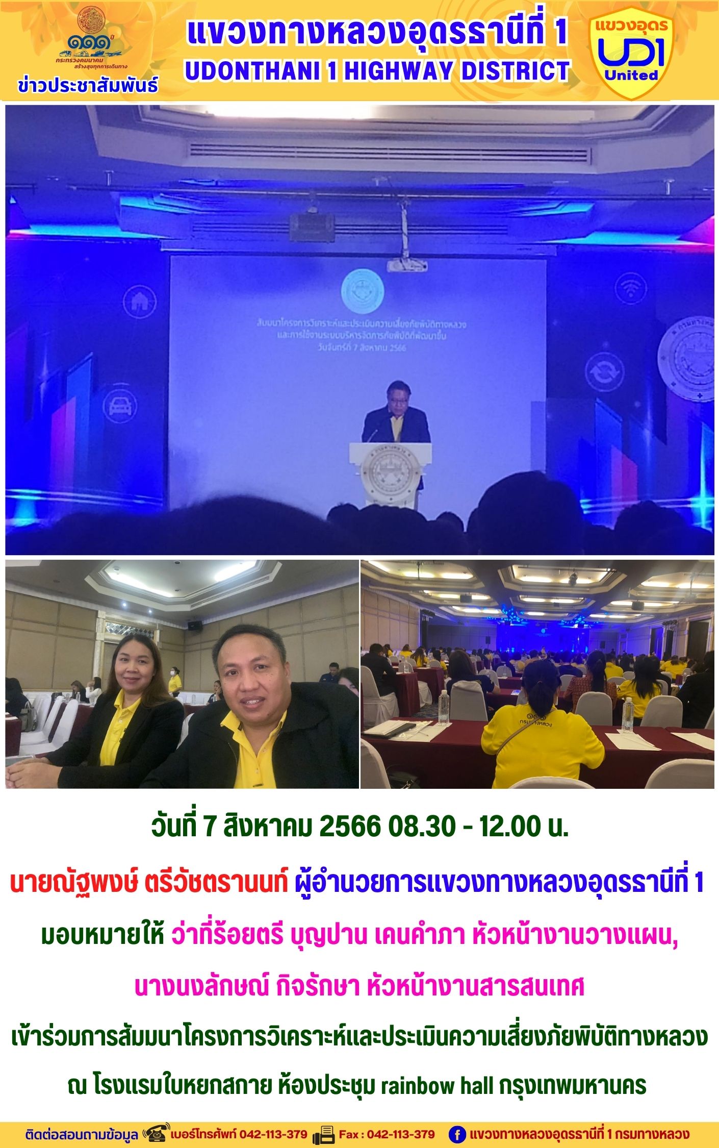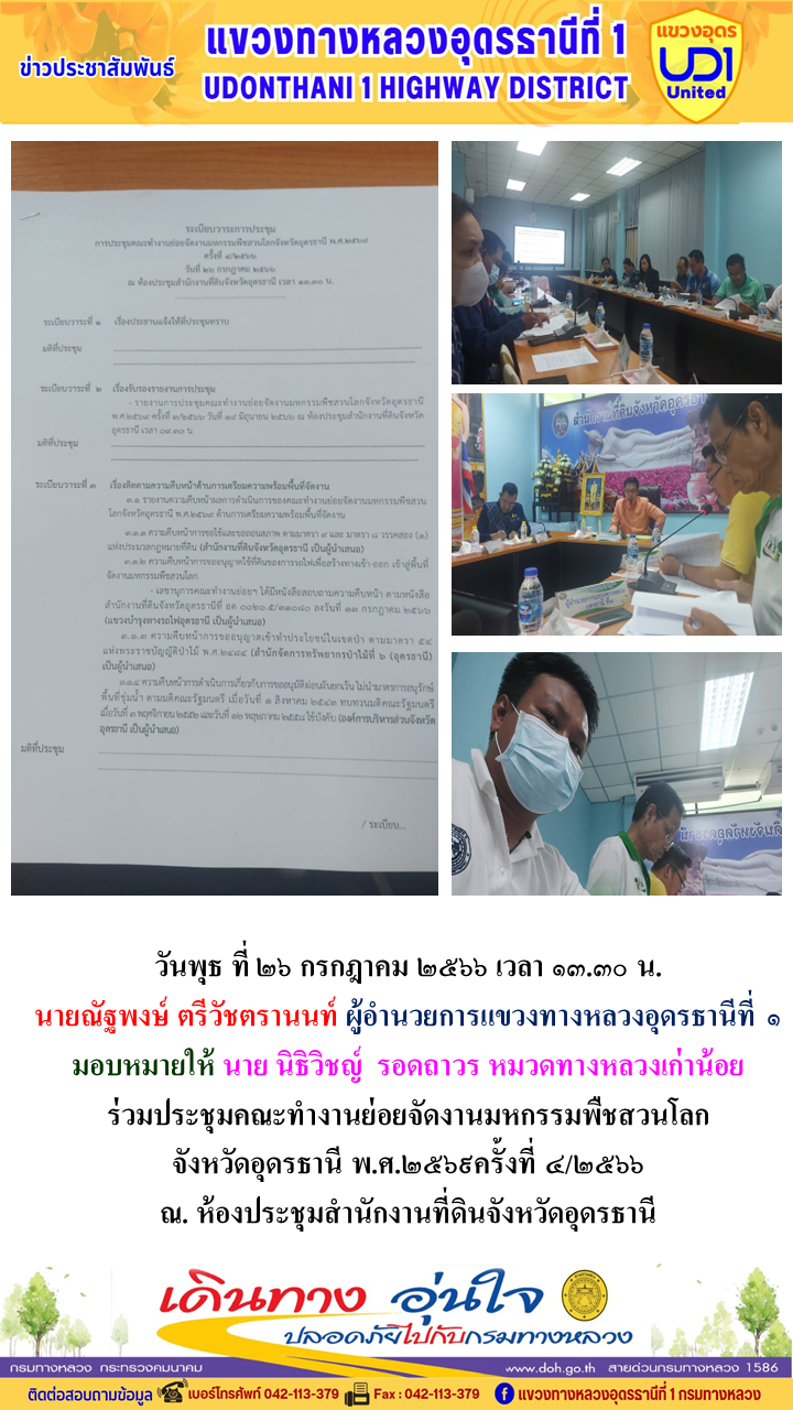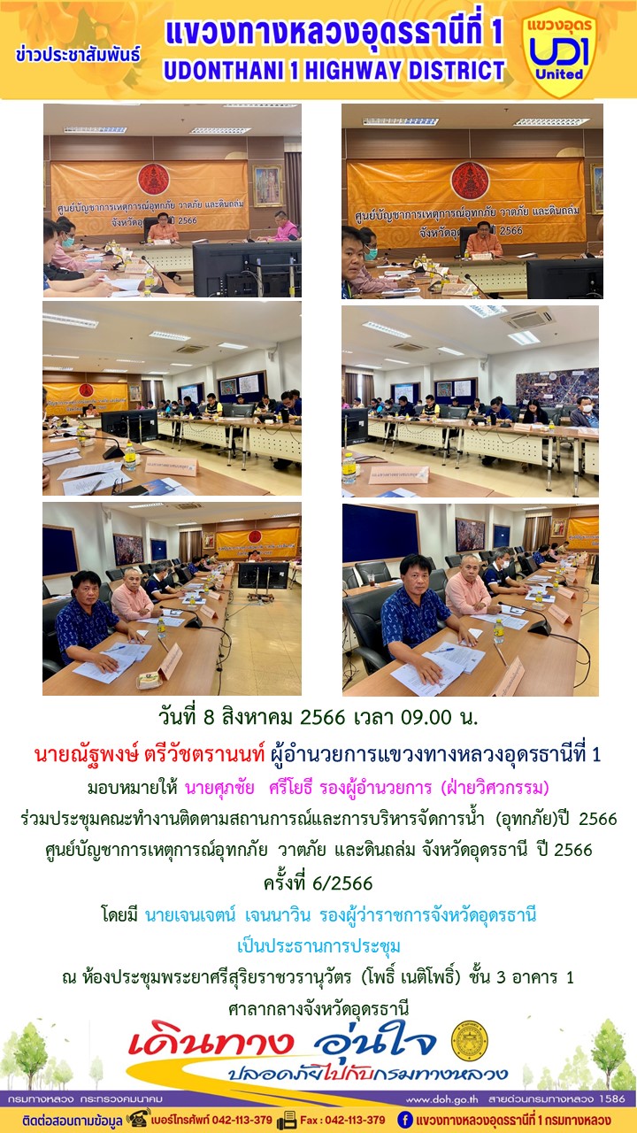 นายณัฐพงษ์ ตรีวัชตรานนท์ ผู้อำนวยการแขวงทางหลวงอุดรธานีที่ 1 มอบหมายให้ นายศุภชัย ศรีโยธี รองผู้อำนวยการ (ฝ่ายวิศวกรรม) ร่วมประชุมคณะทำงานติดตามสถานการณ์และการบริหารจัดการน้ำ (อุทกภัย) ปี 2566 ศูนย์บัญชาการเหตุการณ์อุทกภัย วาตภัย และดินถล่ม จังหวัดอุดรธานี ปี 2566 ครั้งที่ 6/2566 โดยมี นายเจนเจตน์ เจนนาวิน รองผู้ว่าราขการจังหวัดอุดรธานี เป็นประธานการประชุม ณ ห้องประชุมพระยาศรีสุริยราชวรานุวัตร (โพธิ์ เนติโพธิ์) ชั้น 3 อาคาร 1 ศาลากลางจังหวัดอุดรธานี