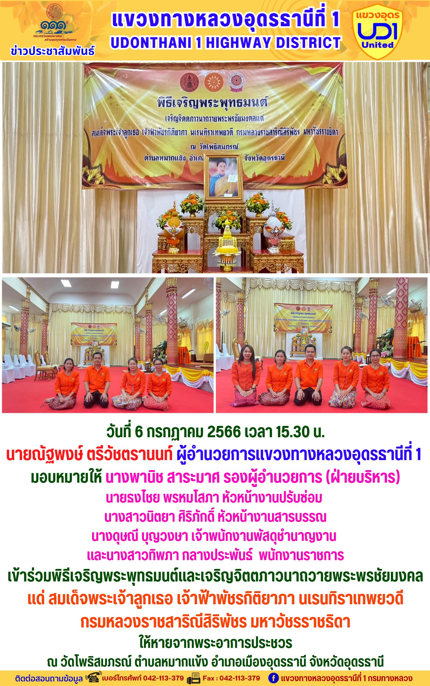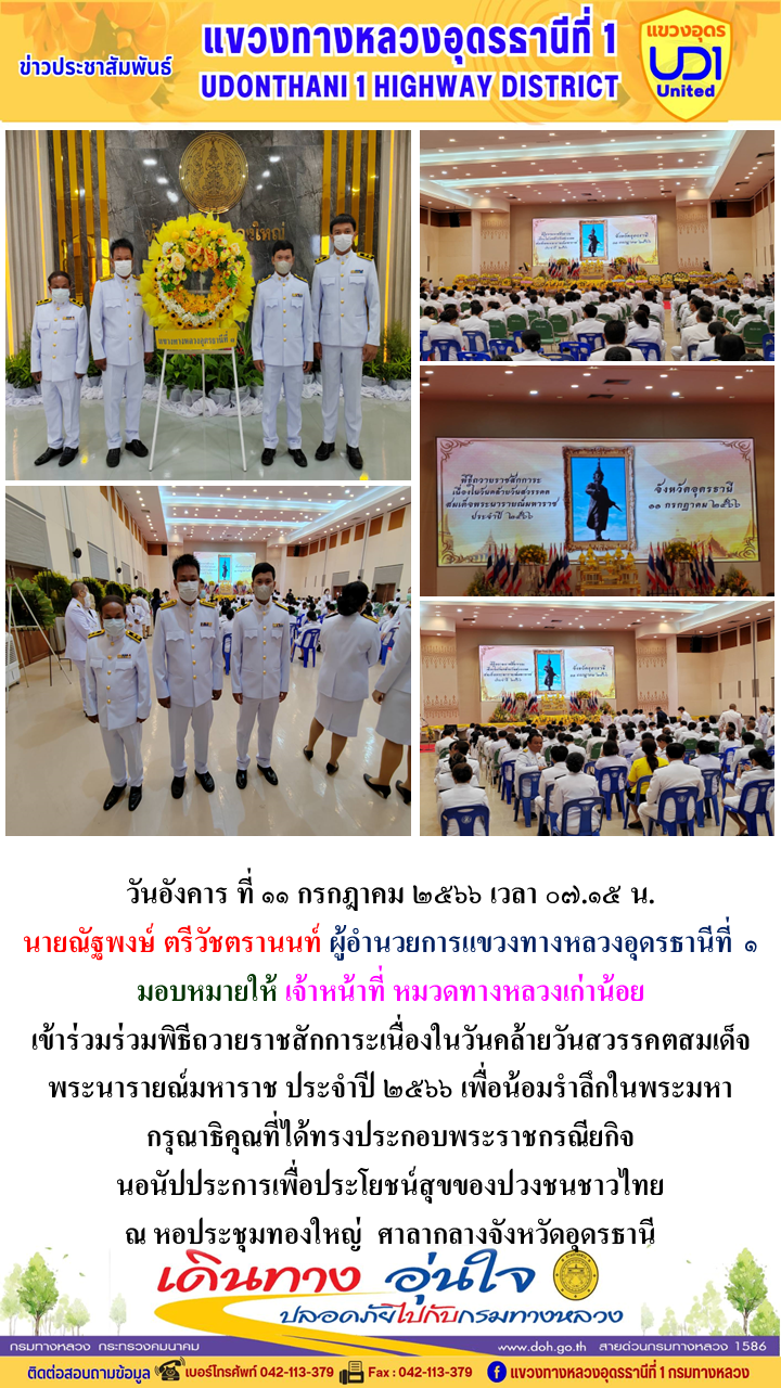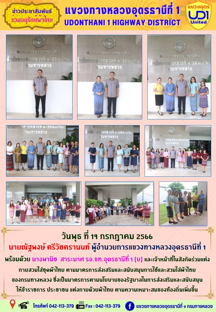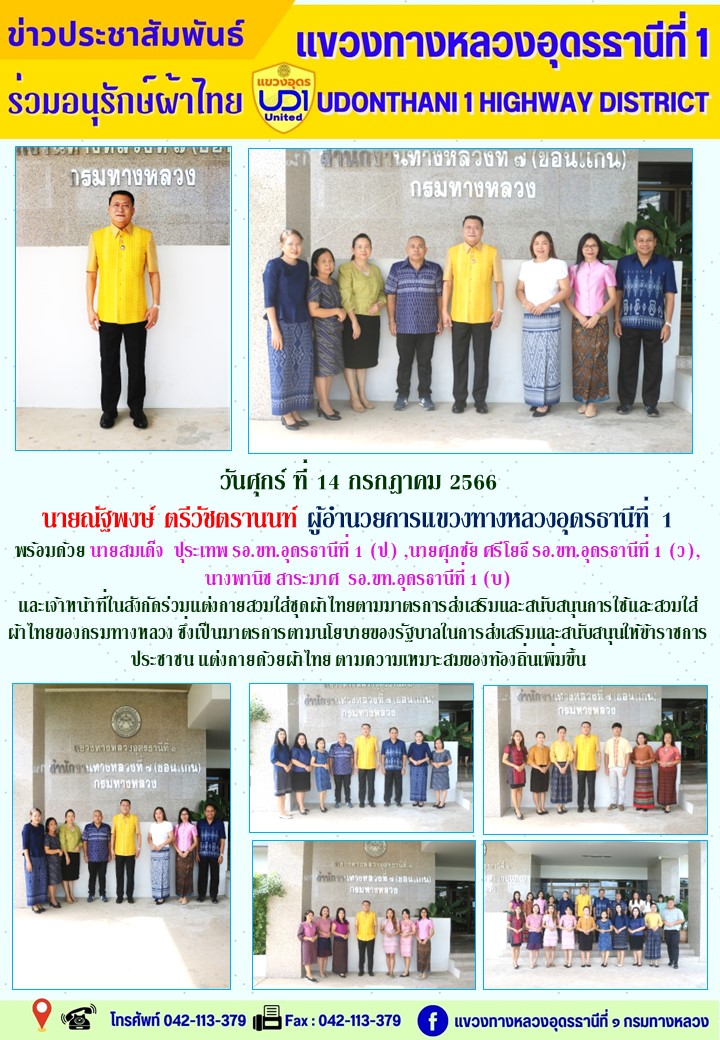 นายณัฐพงษ์ ตรีวัชตรานนท์ ผู้อำนวยการแขวงทางหลวงอุดรธานีที่ 1 พร้อมด้วย นายสมเด็จ ปุระเทพ รอ.ขท.อุดรธานีที่ 1 (ป) ,นายศุภชัย ศรีโยธี รอ.ขท.อุดรธานีที่ 1 (ว), นางพานิช สาระมาศ รอ.ขท.อุดรธานีที่ 1 (บ) และเจ้าหน้าที่ในสังกัดร่วมแต่งกายสวมใส่ชุดผ้าไทยตามมาตรการส่งเสริมและสนับสนุนการใช้และสวมใส่ผ้าไทยของกรมทางหลวง ซึ่งเป็นมาตรการตามนโยบายของรัฐบาลในการส่งเสริมและสนับสนุนให้ข้าราชการ ประชาชน แต่งกายด้วยผ้าไทย ตามความเหมาะสมของท้องถิ่นเพิ่มขึ้น