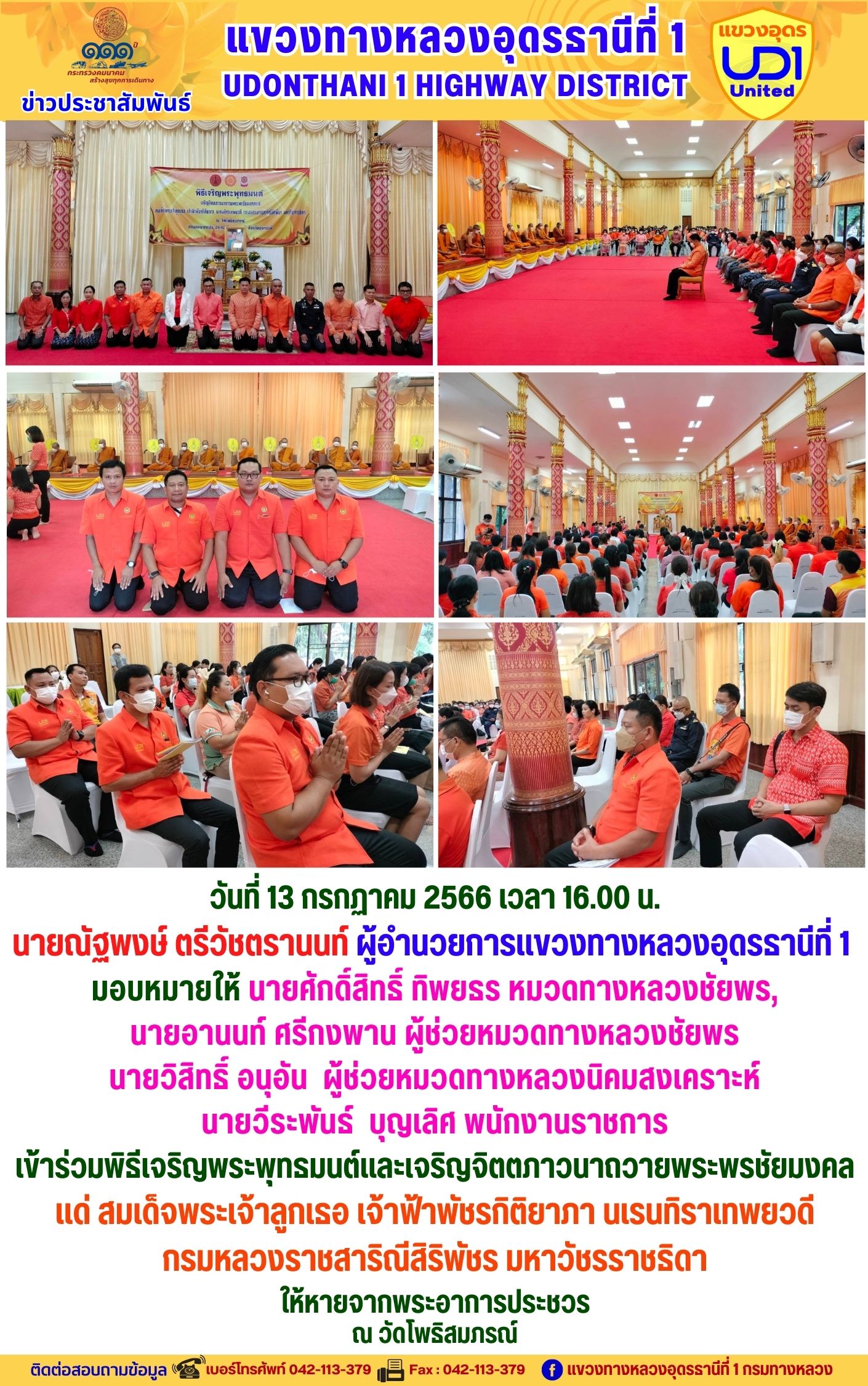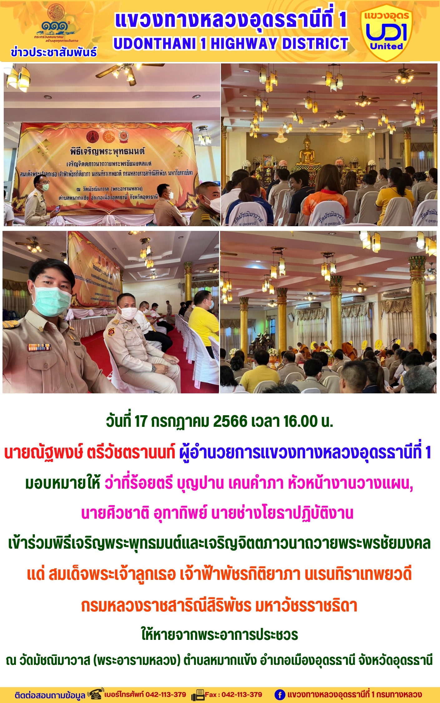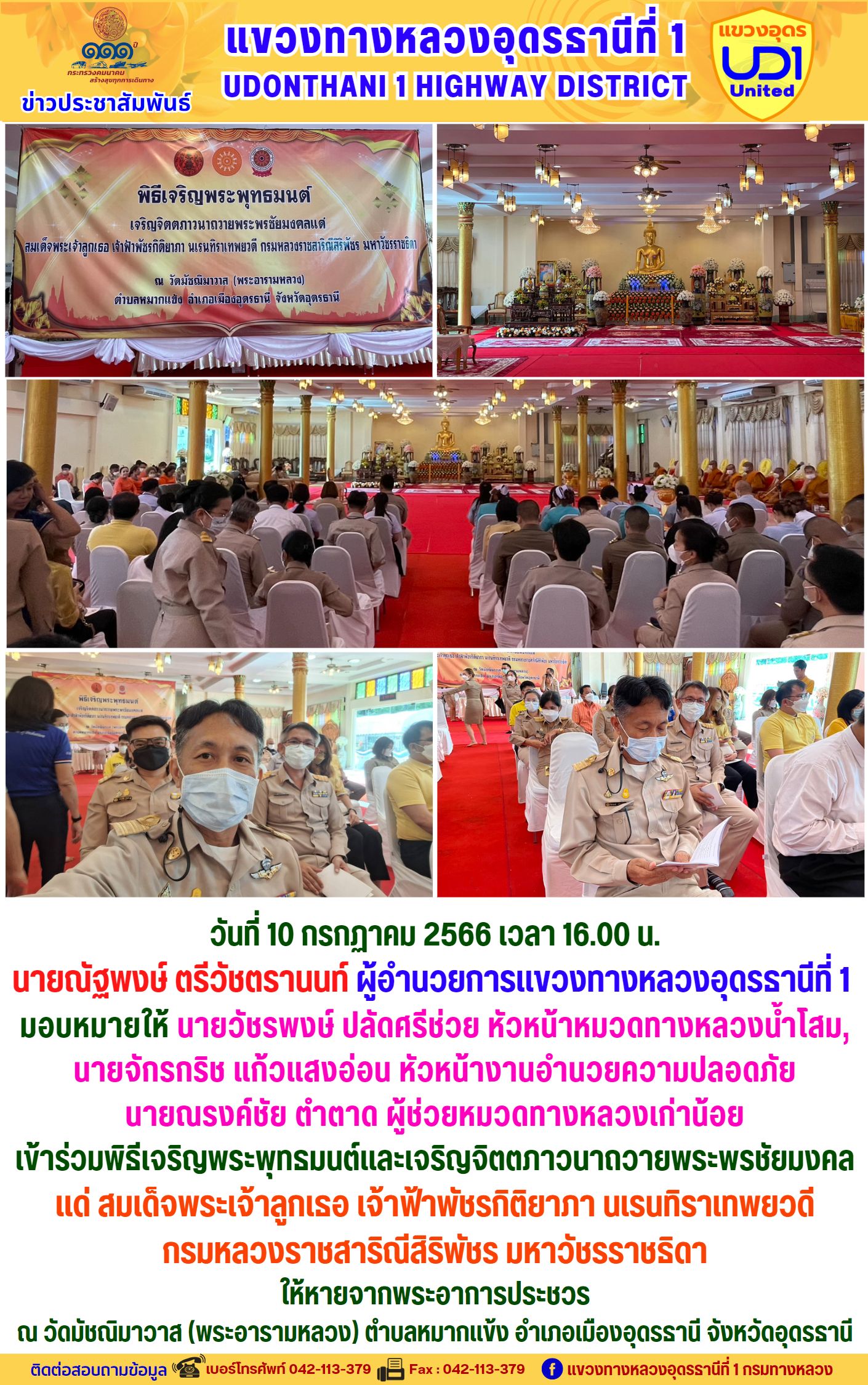 นายณัฐพงษ์ ตรีวัชตรานนท์ ผู้อำนวยการแขวงทางหลวงอุดรธานีที่ 1 พร้อมด้วย นายสมเด็จ ปุระเทพ รอ.ขท.อุดรธานีที่ 1 (ป) ,นายศุภชัย ศรีโยธี รอ.ขท.อุดรธานีที่ 1 (ว), นางพานิช สาระมาศ รอ.ขท.อุดรธานีที่ 1 (บ) และเจ้าหน้าที่ในสังกัดร่วมแต่งกายสวมใส่ชุดผ้าไทยตามมาตรการส่งเสริมและสนับสนุนการใช้และสวมใส่ผ้าไทยของกรมทางหลวง ซึ่งเป็นมาตรการตามนโยบายของรัฐบาลในการส่งเสริมและสนับสนุนให้ข้าราชการ ประชาชน แต่งกายด้วยผ้าไทย ตามความเหมาะสมของท้องถิ่นเพิ่มขึ้น